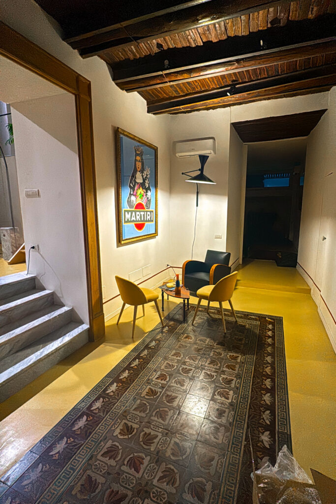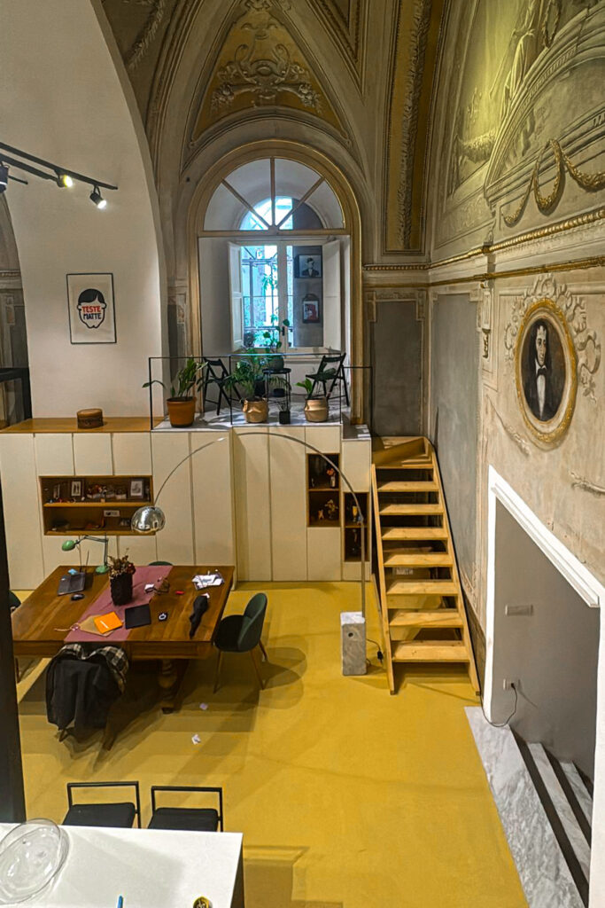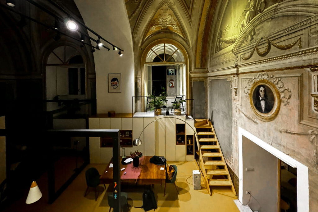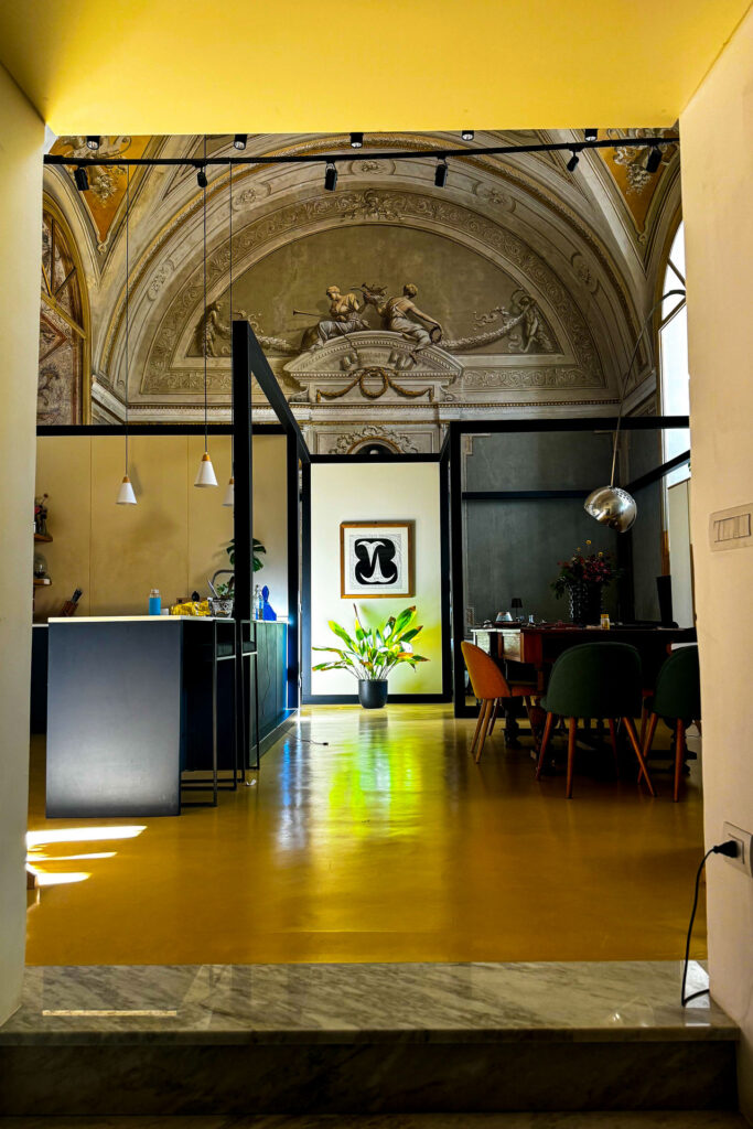 Gli elementi distintivi di questa location si trovano nel contrasto tra le pareti decorate con stucchi e affreschi barocchi e l’arredo dal gusto contemporaneo. Il pavimento in resina color ocra si combina con dettagli industriali in ferro nero e legno, creando un equilibrio visivo ideale per produzioni che cercano una scenografia autentica ma dal carattere moderno.