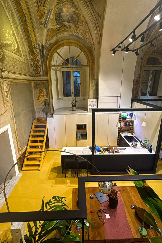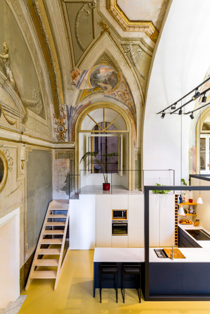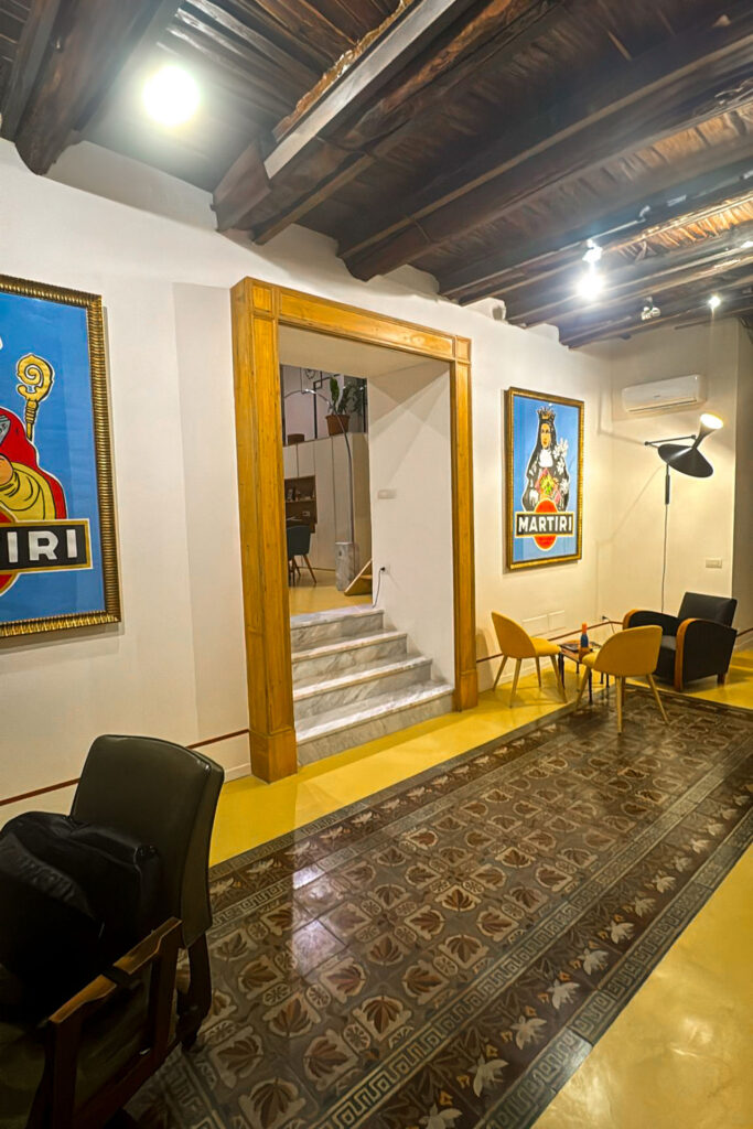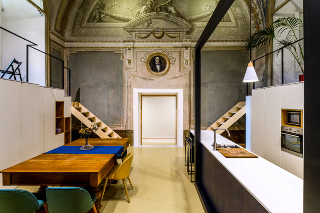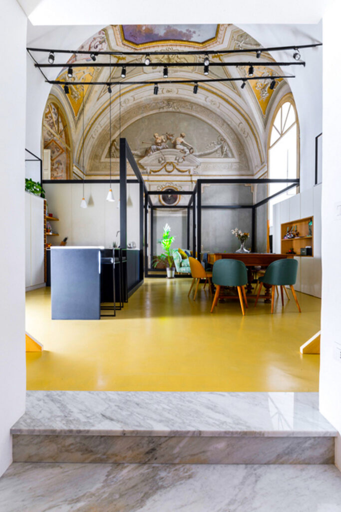 Gli elementi distintivi di questa location si trovano nel contrasto tra le pareti decorate con stucchi e affreschi barocchi e l’arredo dal gusto contemporaneo. Il pavimento in resina color ocra si combina con dettagli industriali in ferro nero e legno, creando un equilibrio visivo ideale per produzioni che cercano una scenografia autentica ma dal carattere moderno.