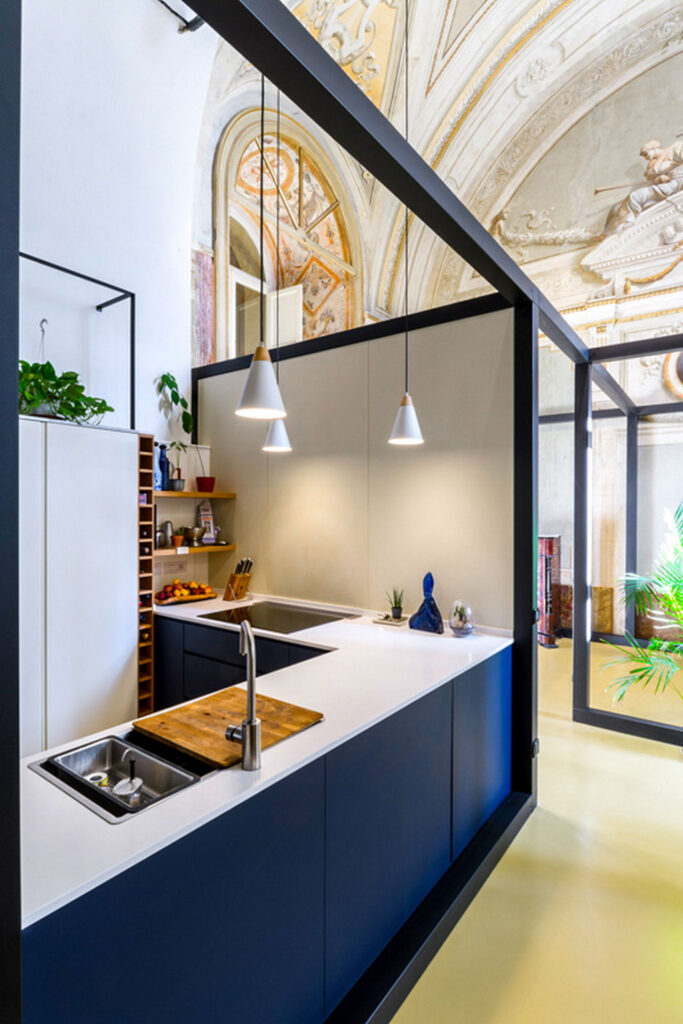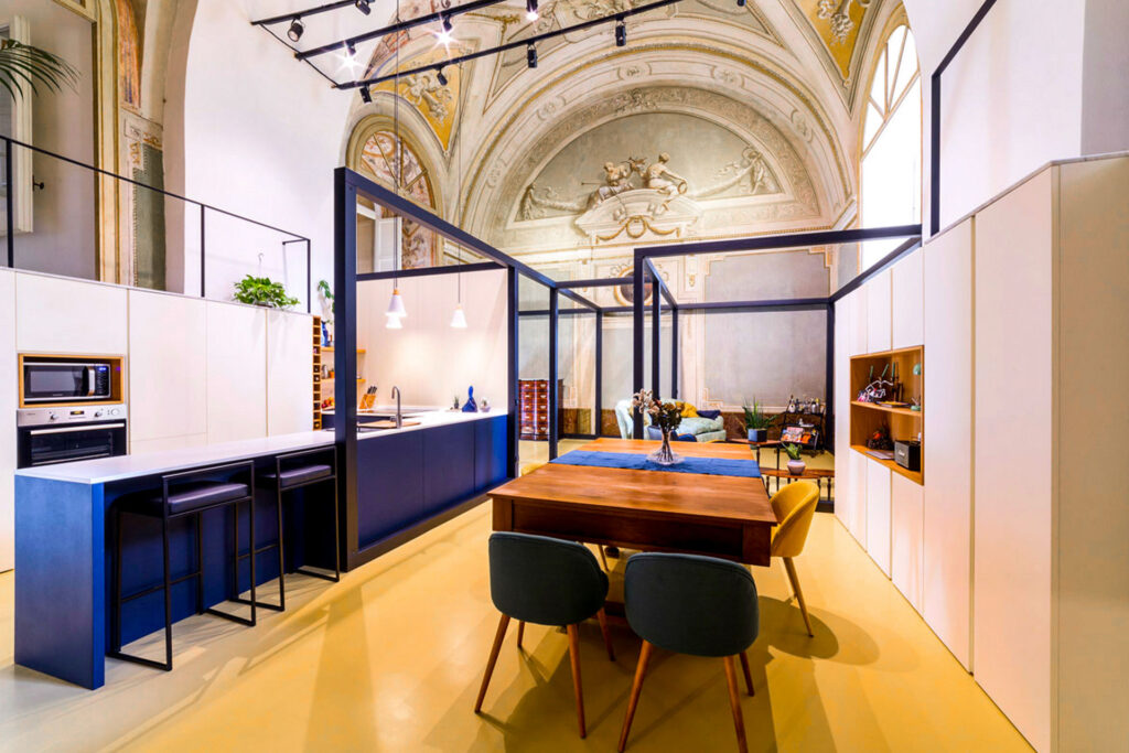 L’Appartamento di Jackie offre uno spazio suggestivo per shooting fotografici e produzioni video, con ambienti ampi e luminosi che si sviluppano sotto alte volte affrescate. La zona giorno si apre su una cucina moderna con isola centrale, circondata da una struttura a vetri dal look minimalista, che crea giochi di trasparenze perfetti per set dal forte impatto visivo.