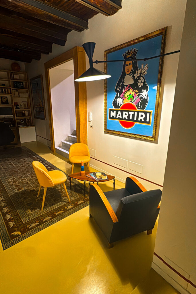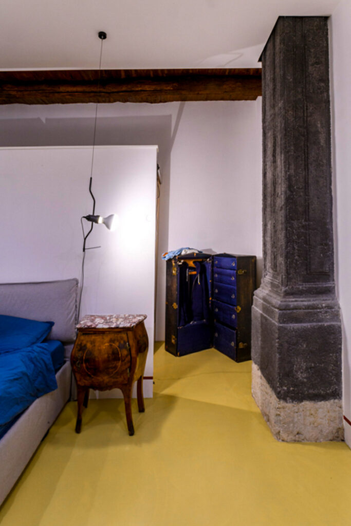 Uno degli spazi più iconici dell’Appartamento di Jackie è la zona living, dove una struttura in metallo nero incornicia il divano e crea una scenografia dal design contemporaneo in perfetto contrasto con le pareti affrescate. Questo ambiente si presta a shooting editoriali ed è perfetto come set per interviste e video storytelling.