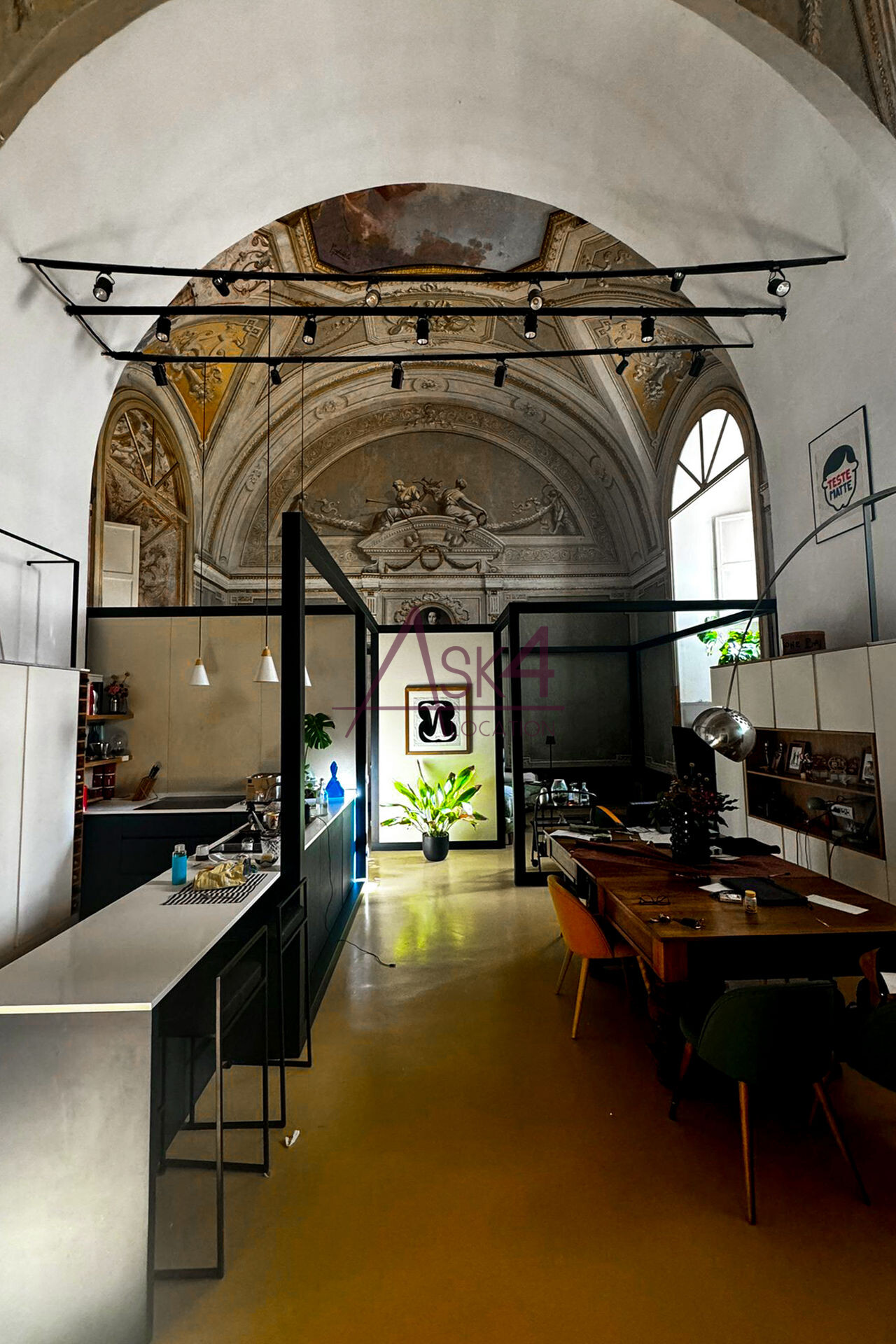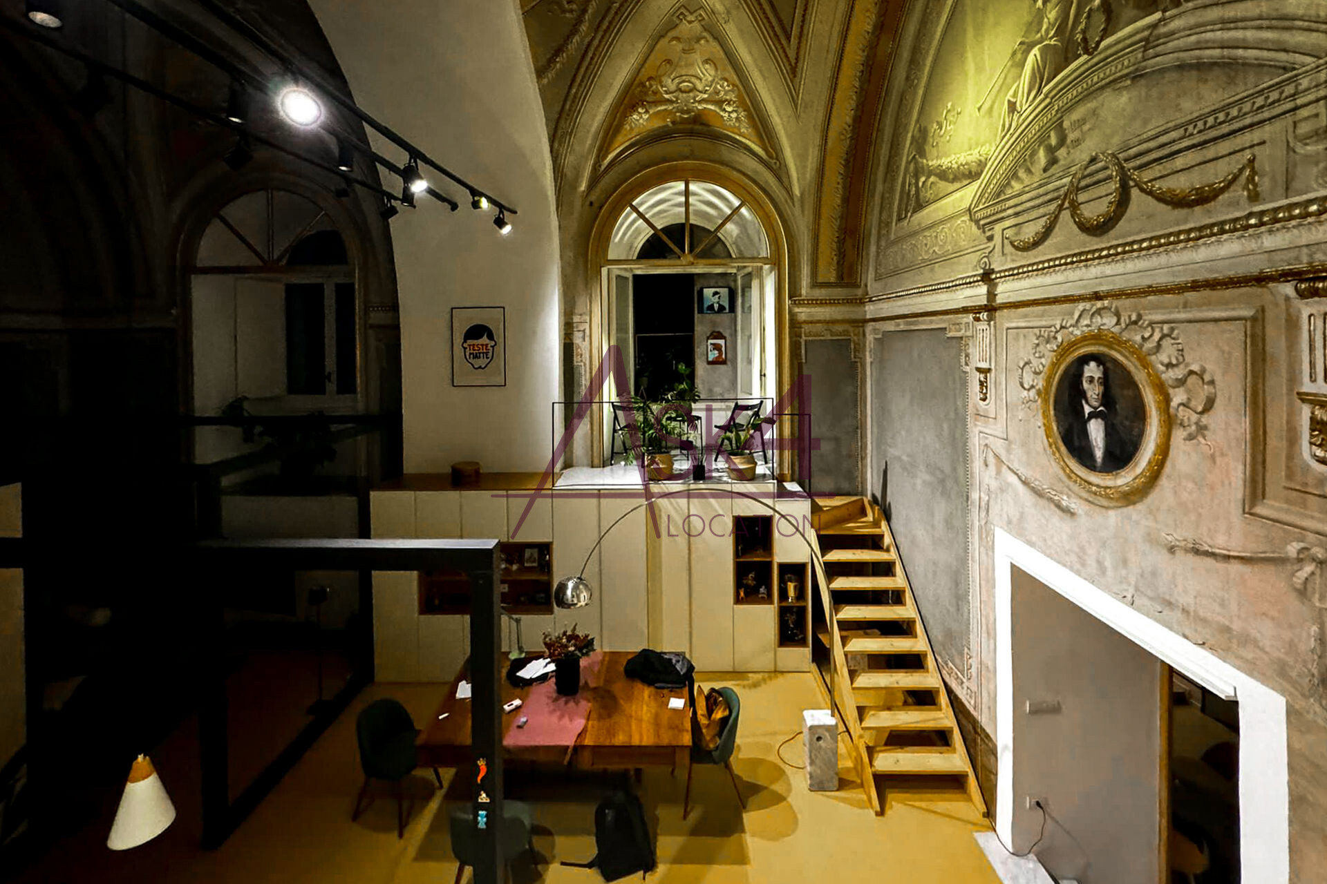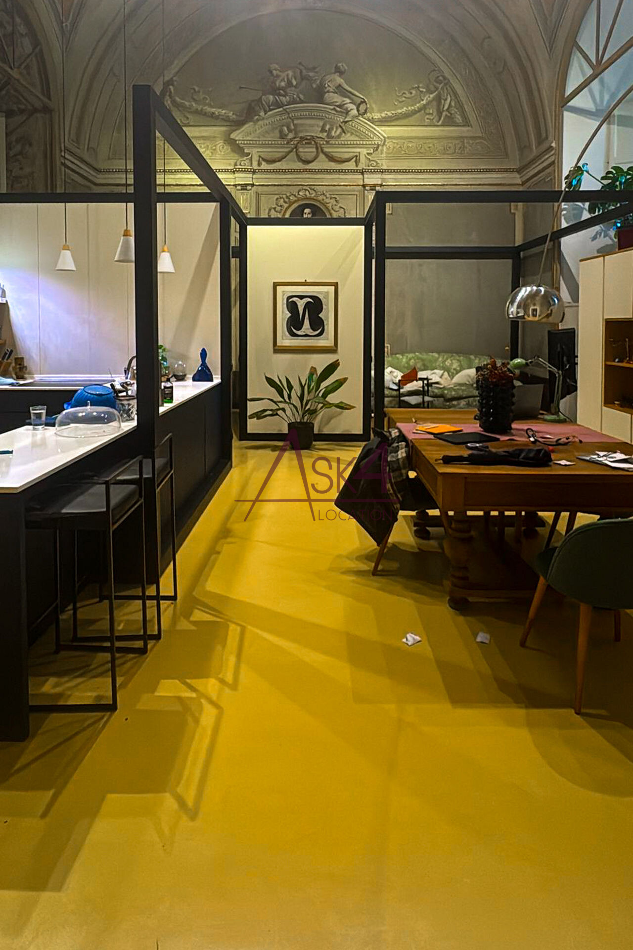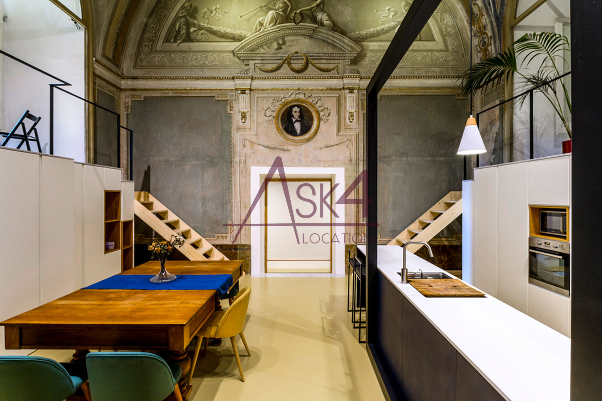 Gli elementi distintivi di questa location si trovano nel contrasto tra le pareti decorate con stucchi e affreschi barocchi e l’arredo dal gusto contemporaneo. Il pavimento in resina color ocra si combina con dettagli industriali in ferro nero e legno, creando un equilibrio visivo ideale per produzioni che cercano una scenografia autentica ma dal carattere moderno.