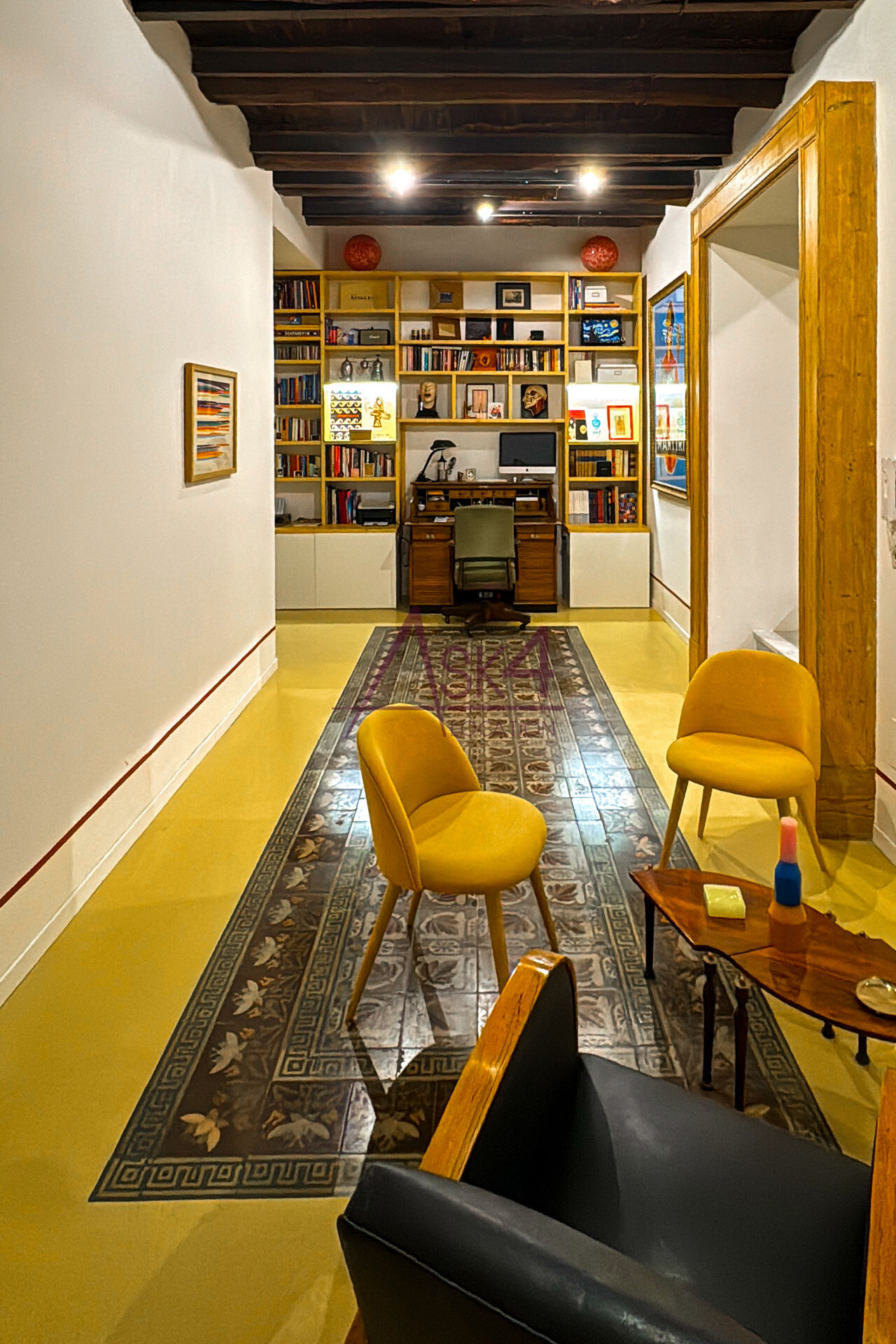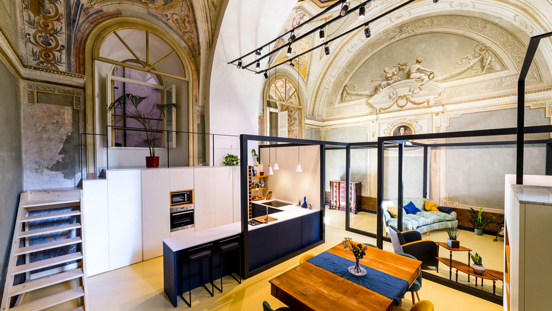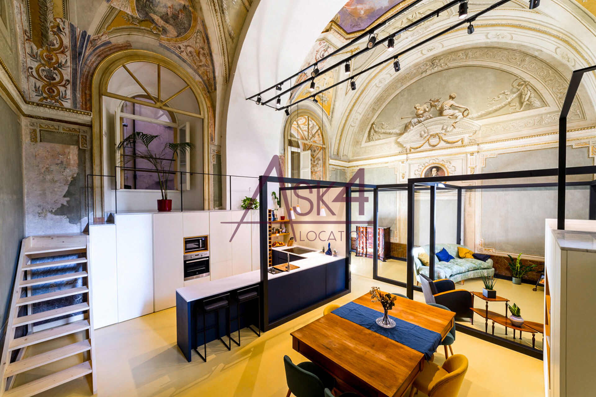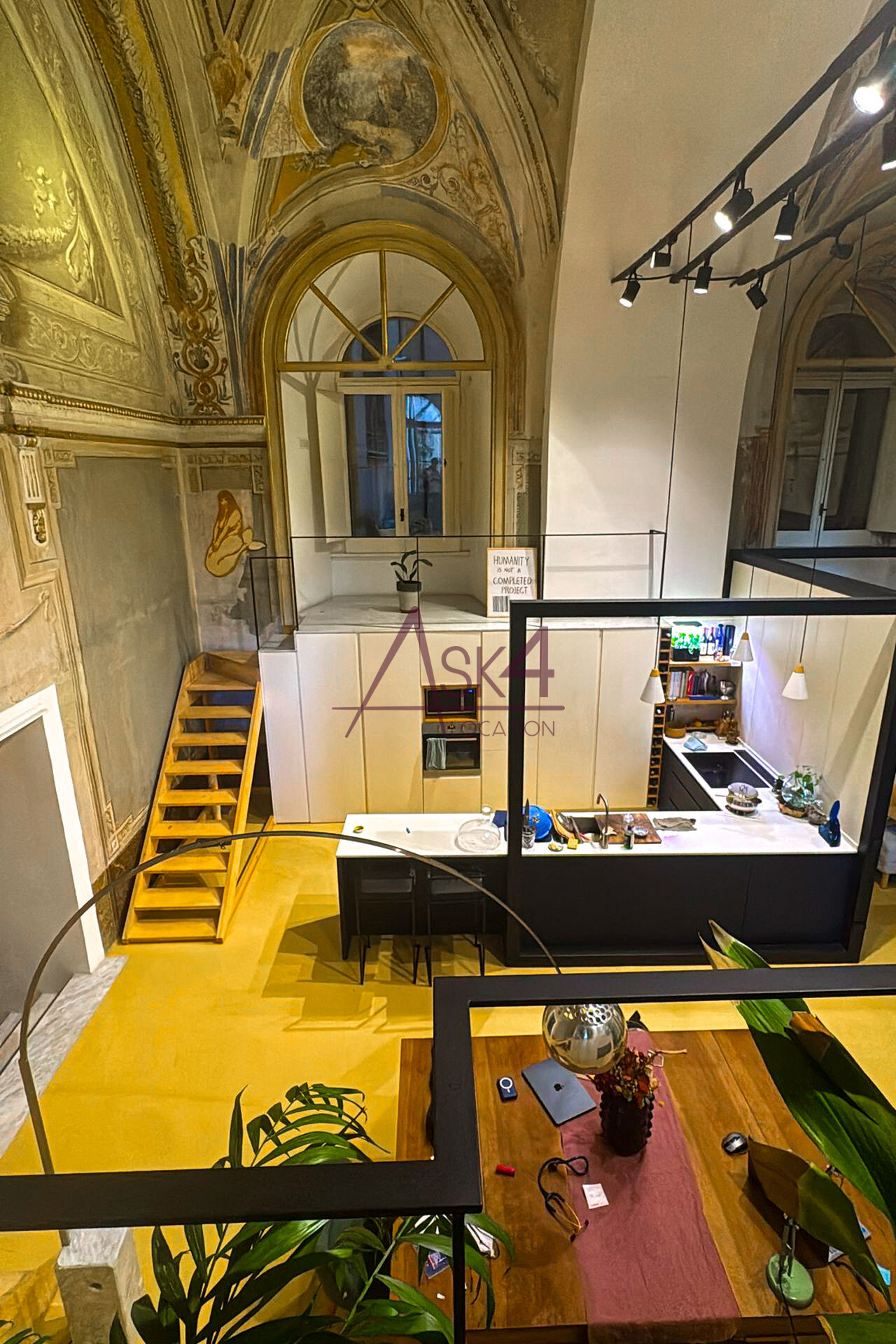 Gli elementi distintivi di questa location si trovano nel contrasto tra le pareti decorate con stucchi e affreschi barocchi e l’arredo dal gusto contemporaneo. Il pavimento in resina color ocra si combina con dettagli industriali in ferro nero e legno, creando un equilibrio visivo ideale per produzioni che cercano una scenografia autentica ma dal carattere moderno.