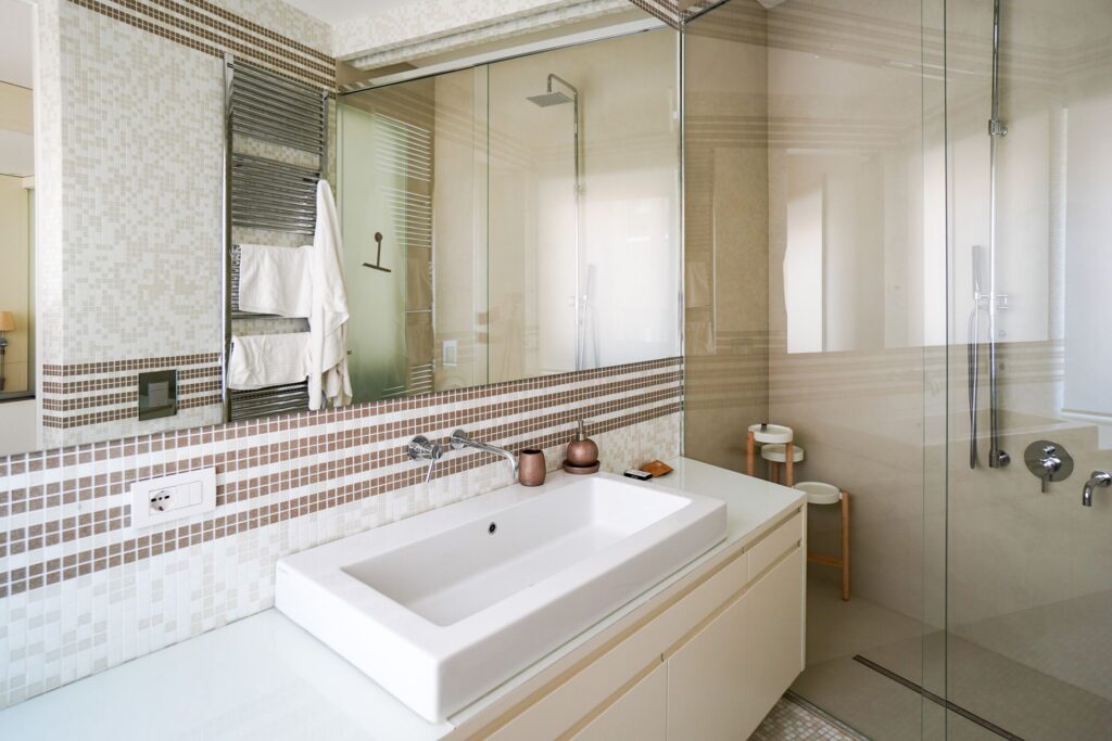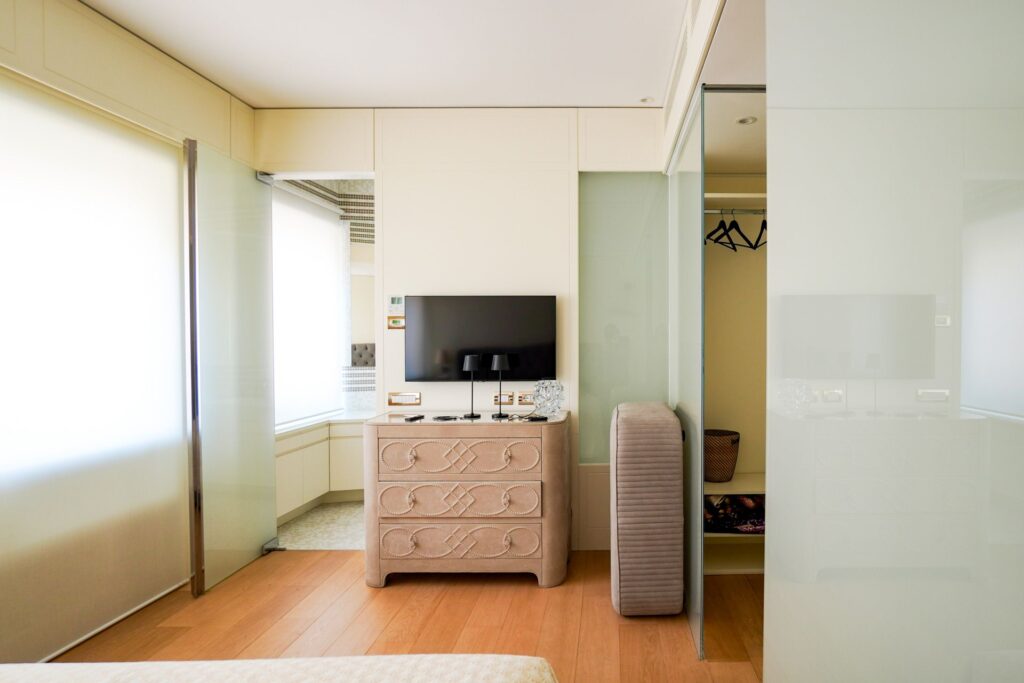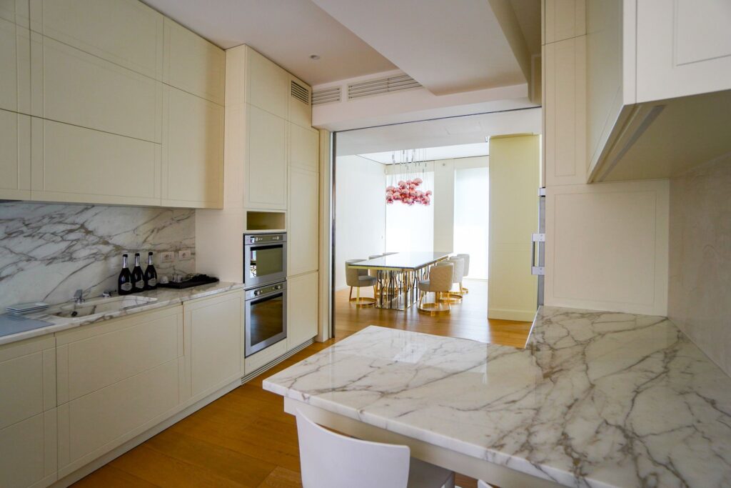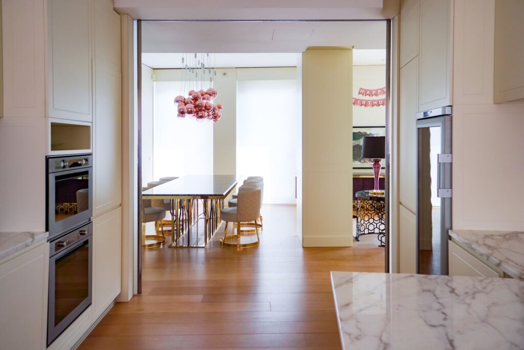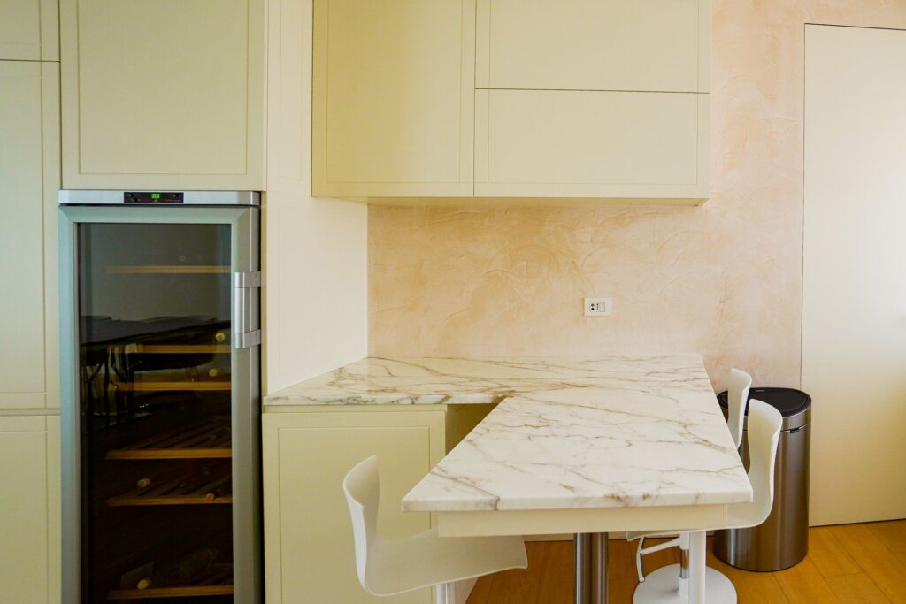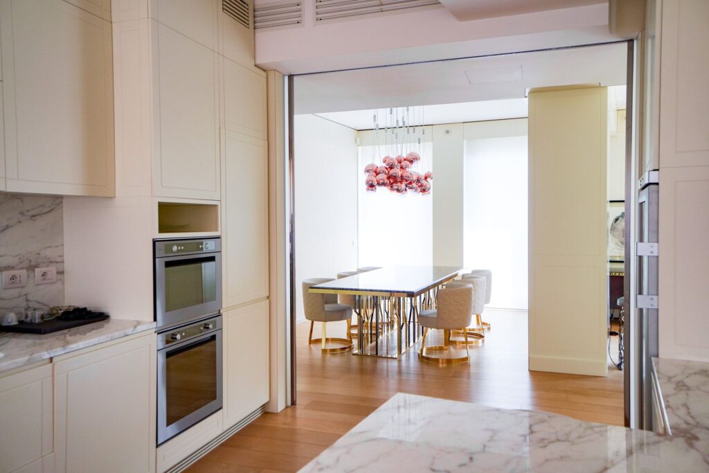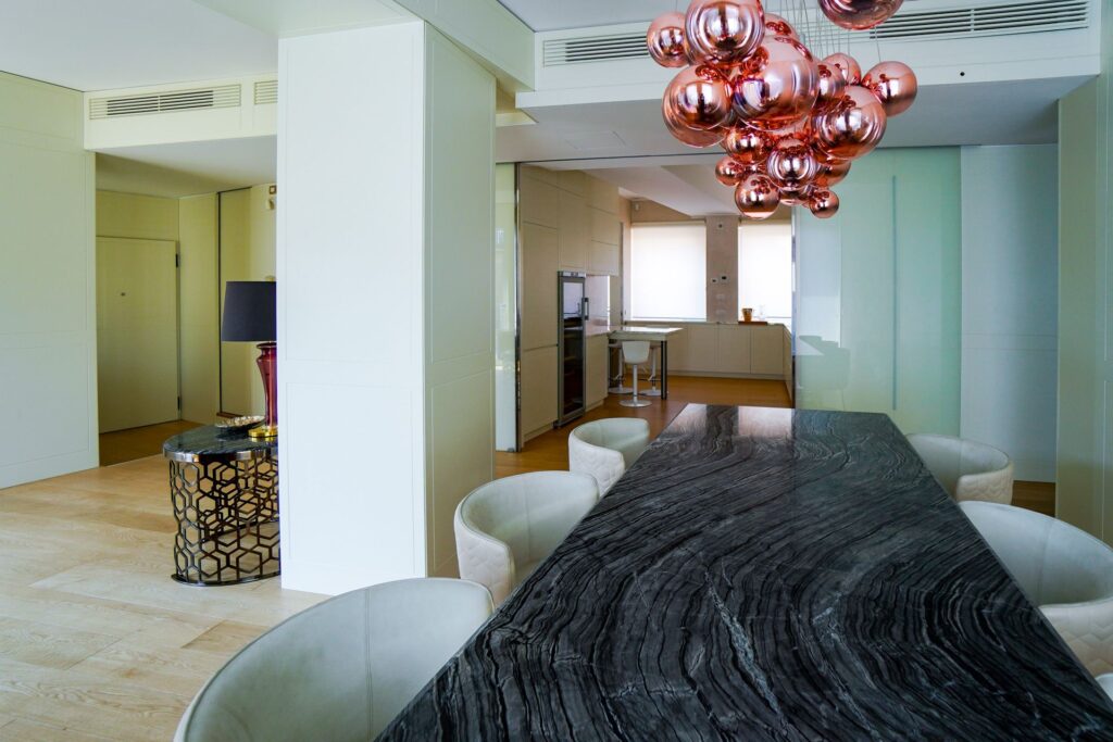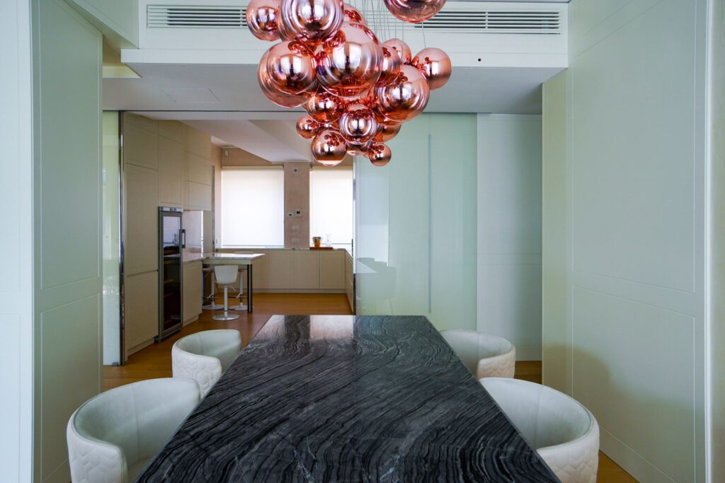 Ogni dettaglio è stato studiato per offrire una resa estetica impeccabile: la console color ametista, le lampade pendenti in metallo lucido, le superfici marmoree e i complementi d’arredo dialogano armoniosamente con le linee pulite dello spazio.