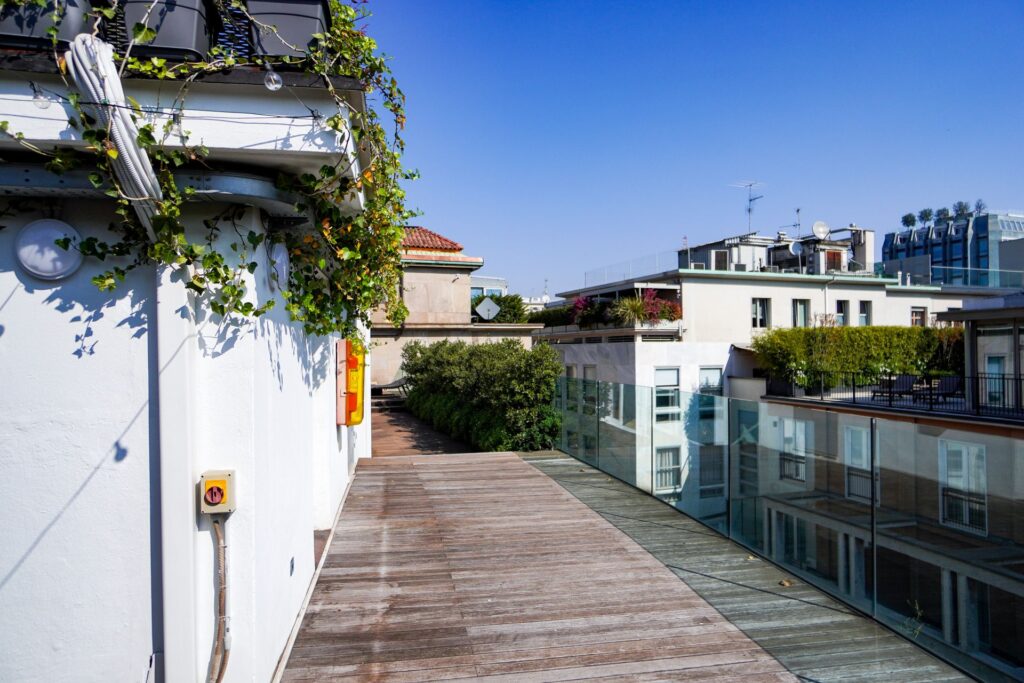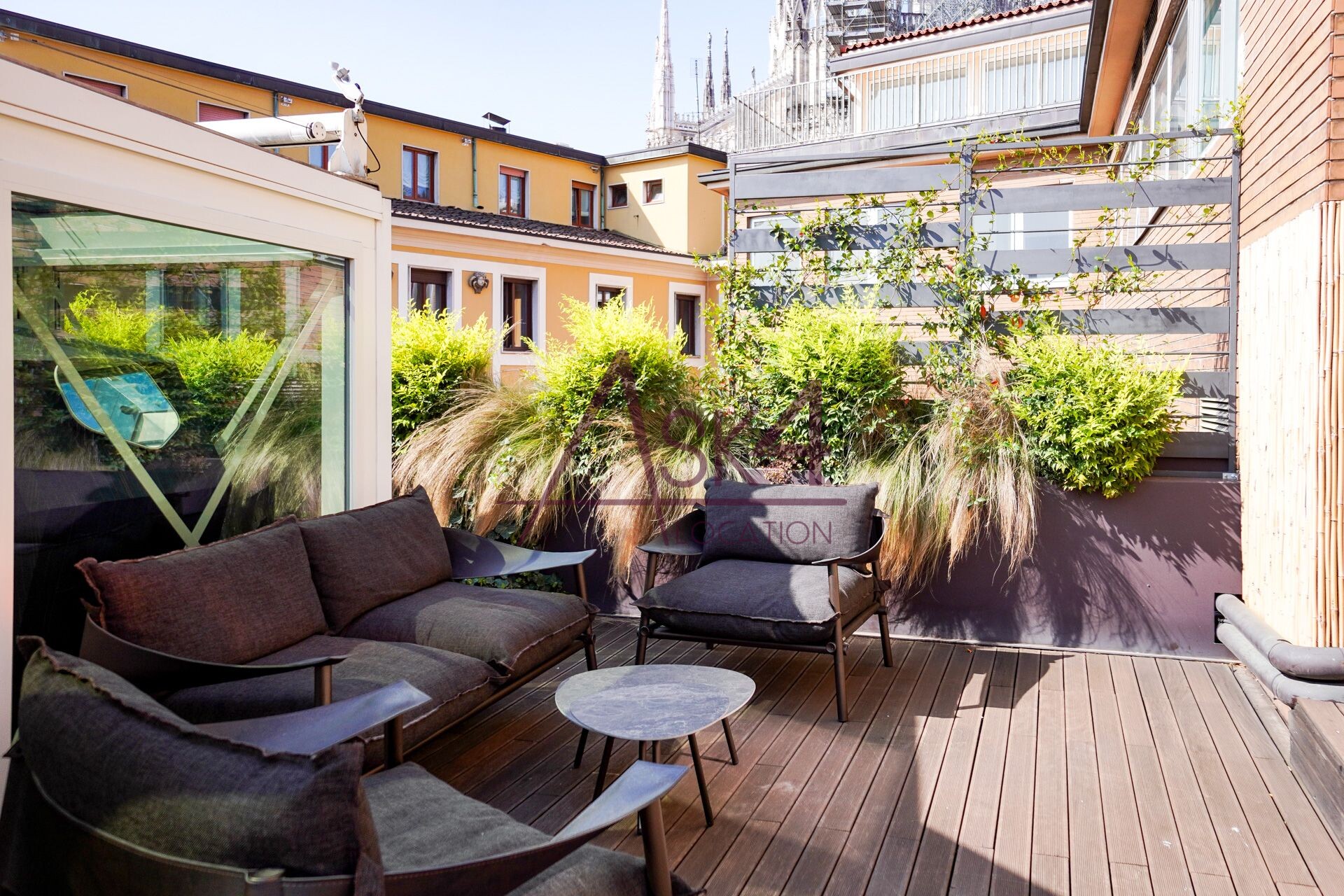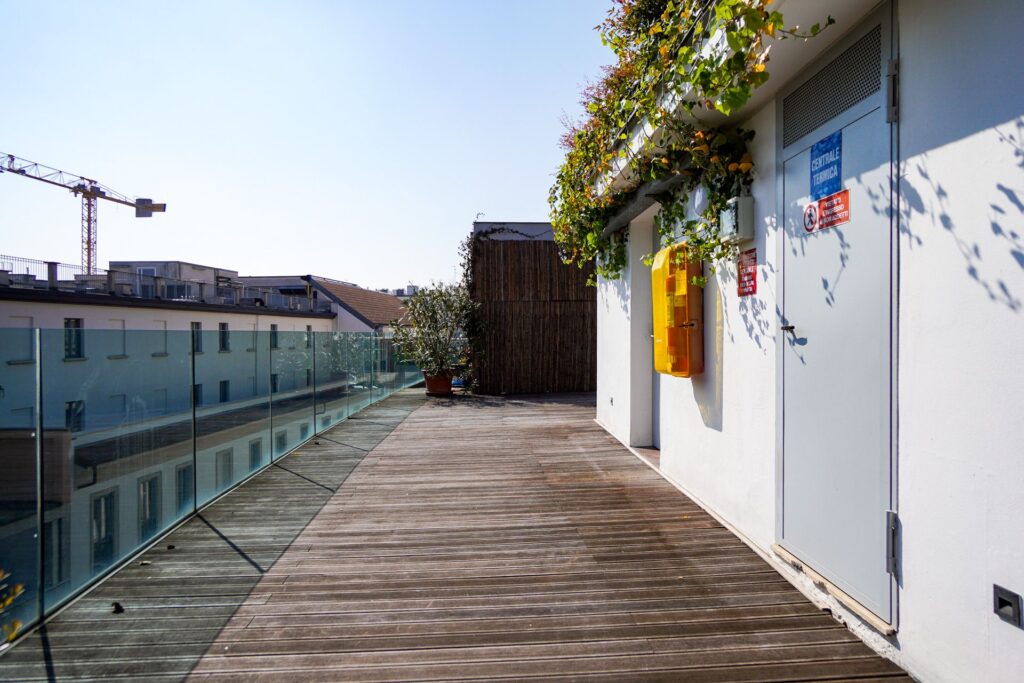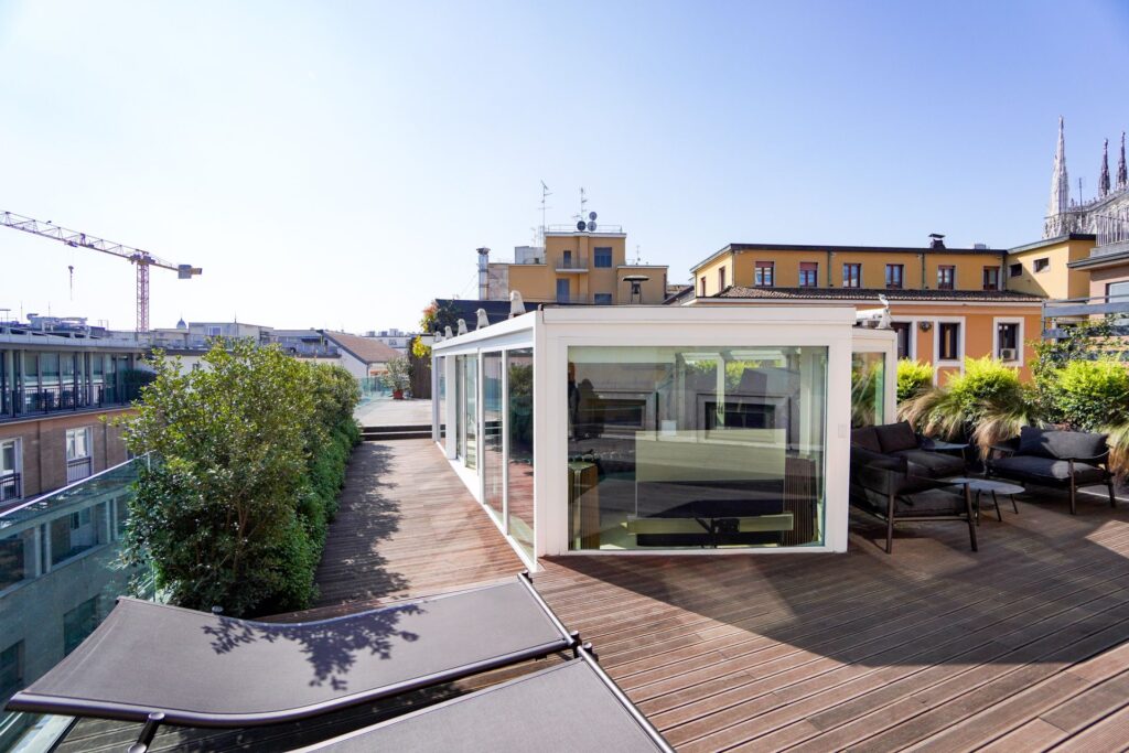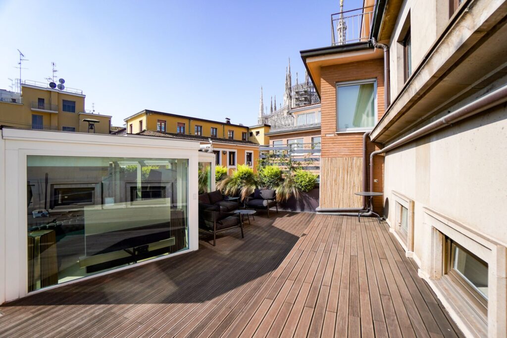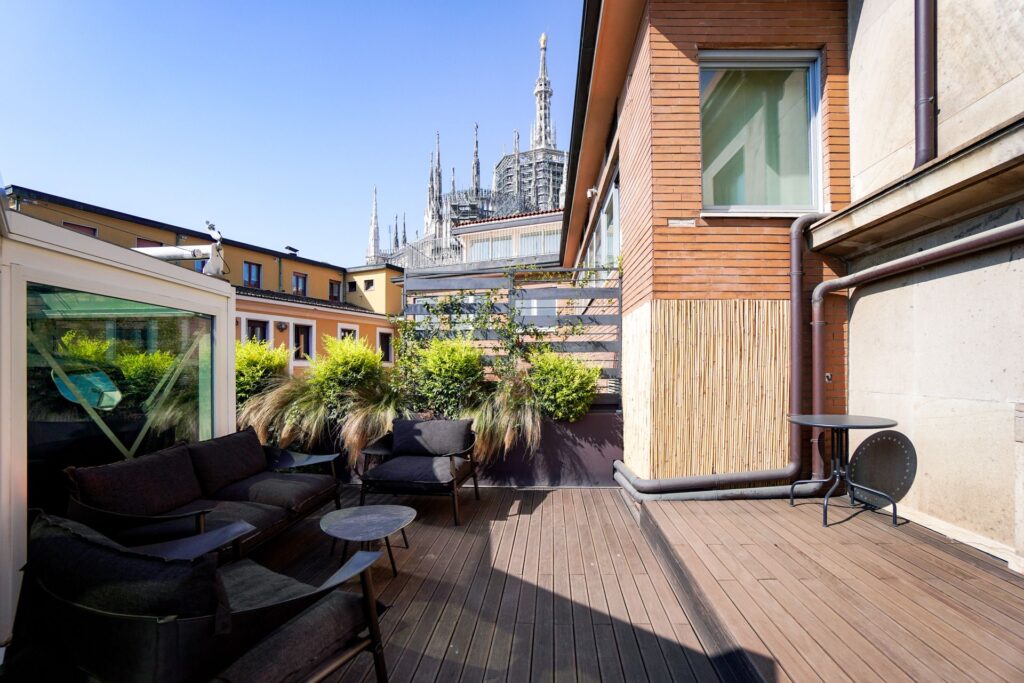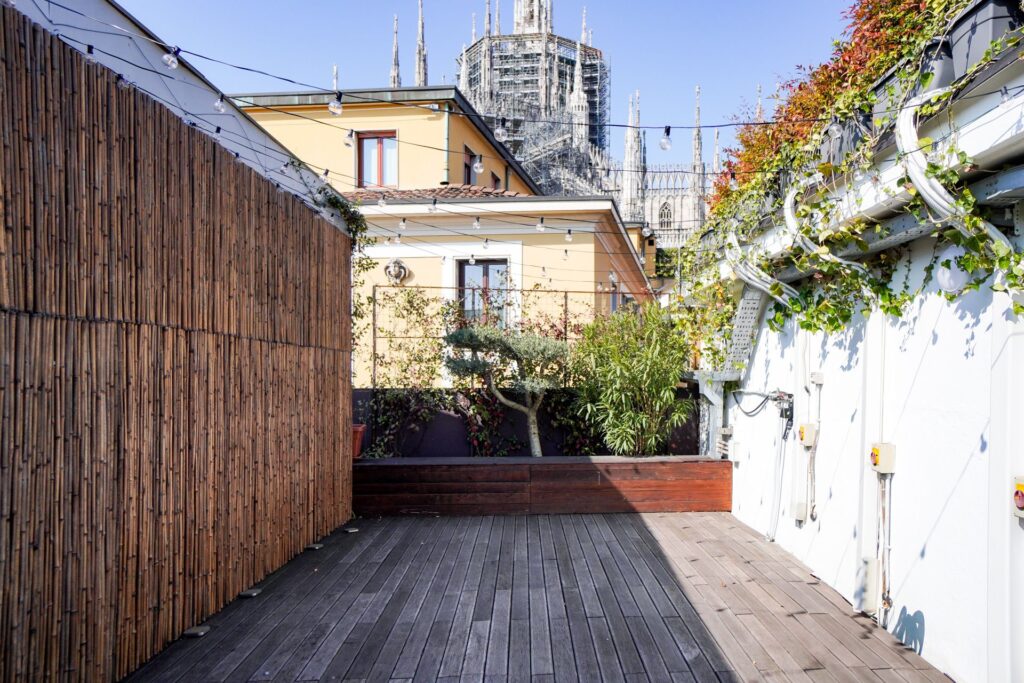 L’ampio terrazzo perimetrale, con vegetazione curata e scorci urbani d’effetto, offre uno sfondo naturale perfetto per shooting in esterna, valorizzato dalla presenza scenografica del Duomo di Milano.