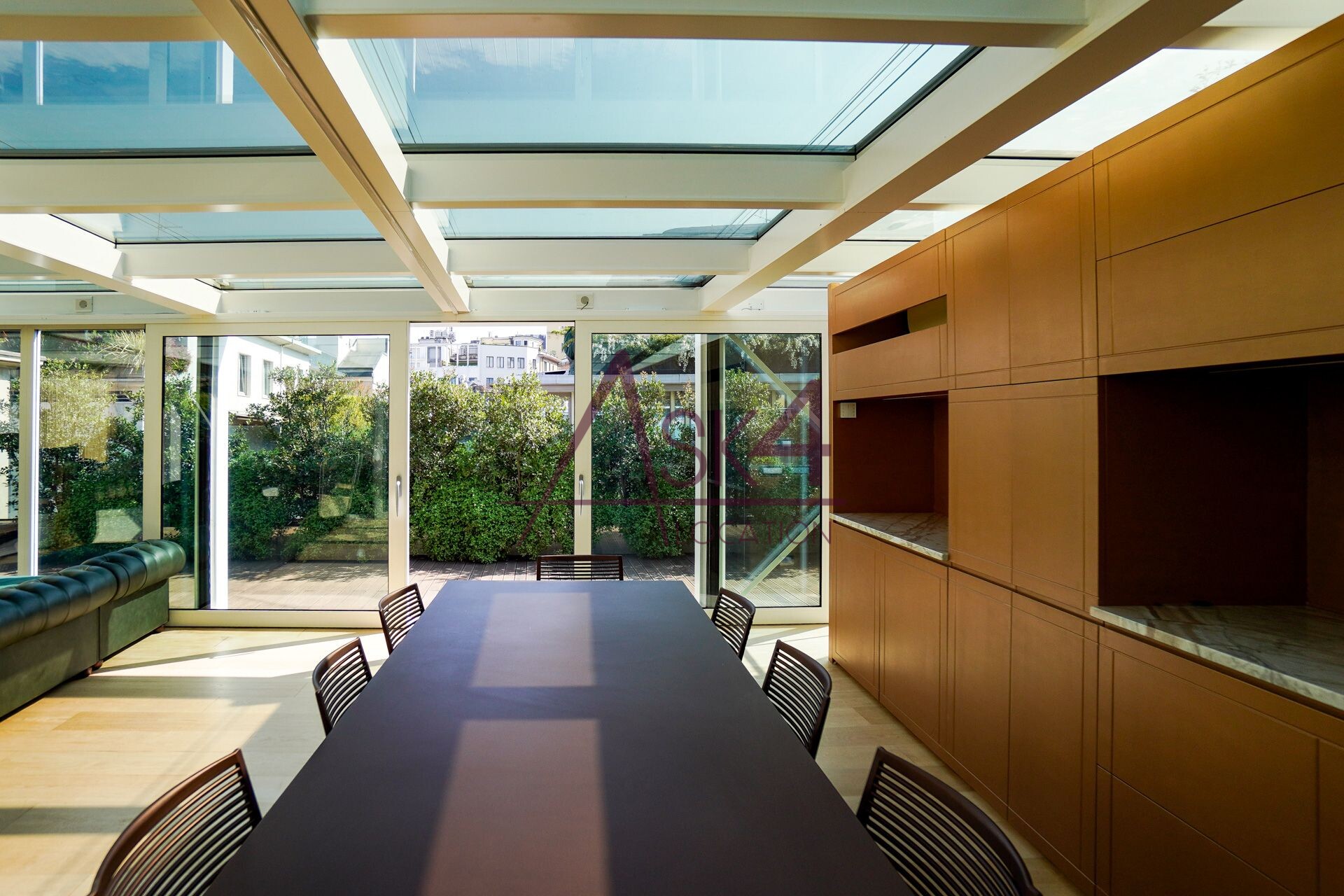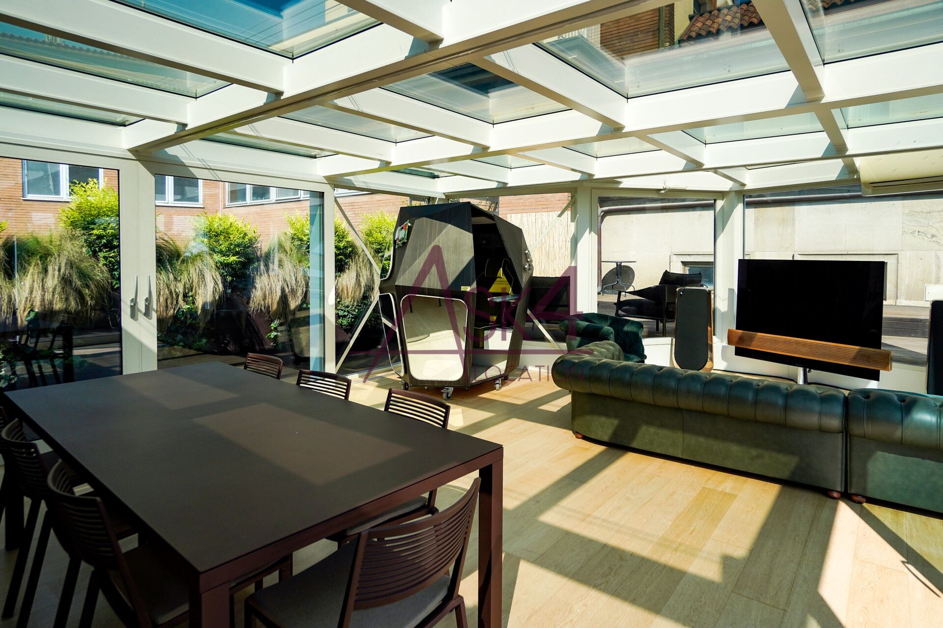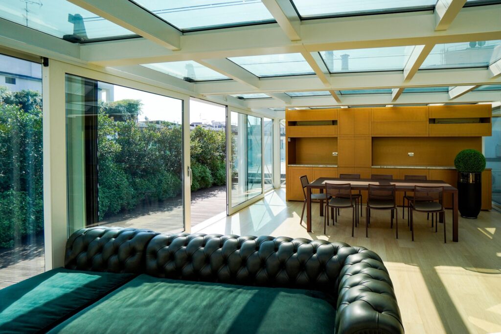 Il cuore visivo della location è la veranda in vetro: uno spazio polifunzionale dotato di divani, area pranzo e sistema audio/video, perfetto per riprese lifestyle, showcooking o talk aziendali. La luce naturale filtra in ogni ora del giorno, garantendo qualità visiva e continuità nei cambi scena.