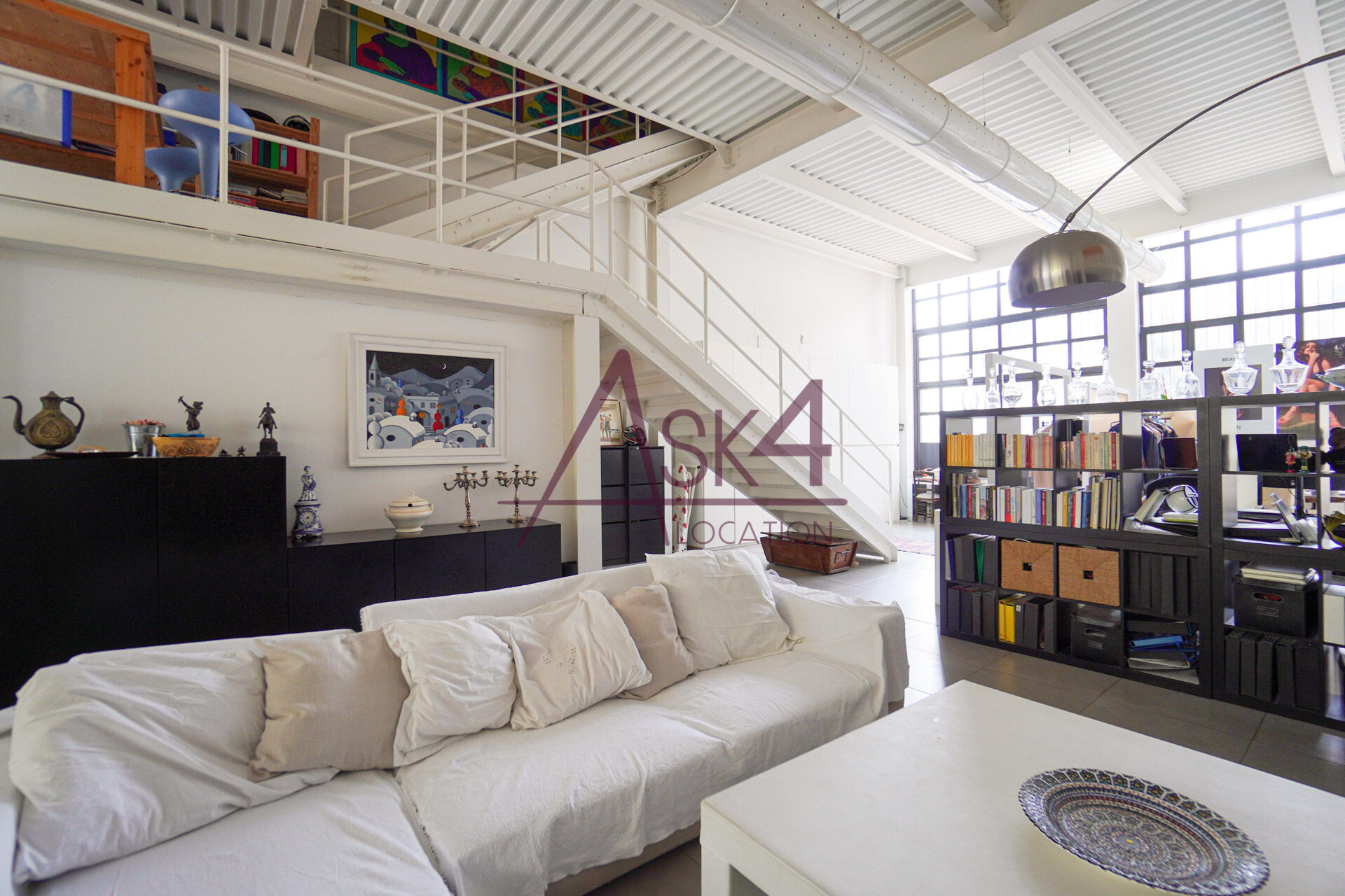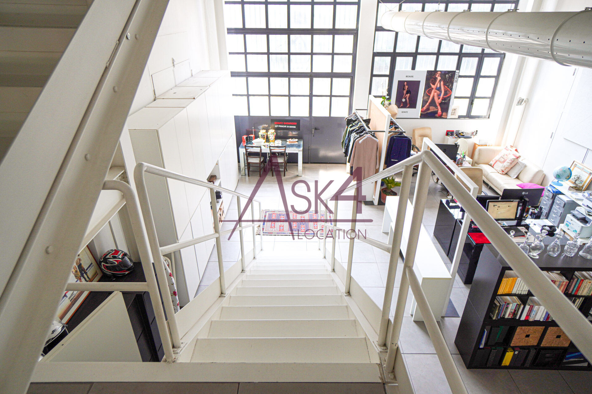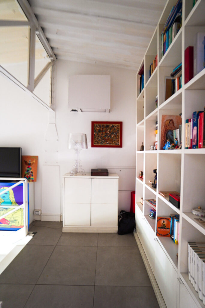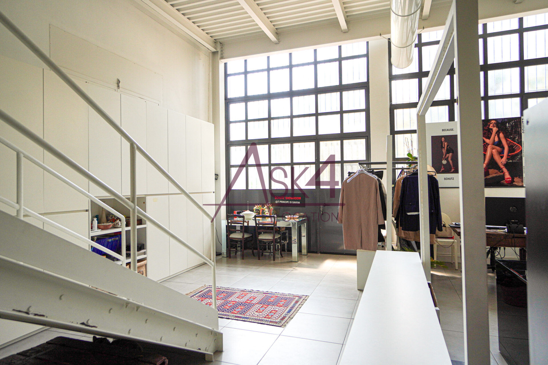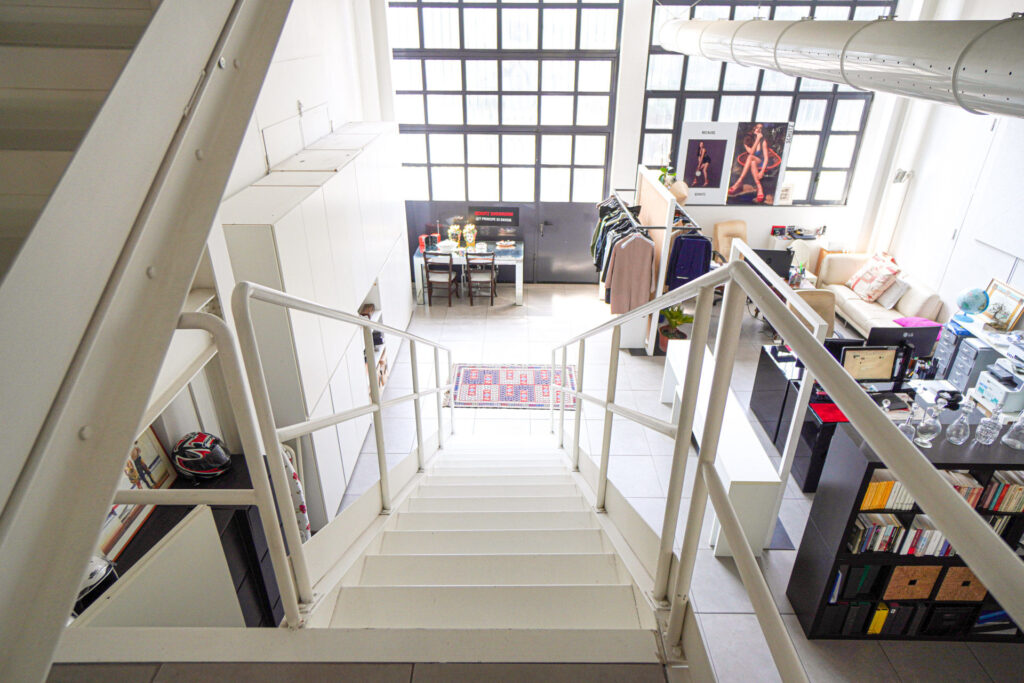A completare la versatilità della location, il loft è dotato di un soppalco accessibile tramite una scala in ferro bianco, che aggiunge profondità e prospettive dinamiche alle inquadrature, ideale per regie che richiedono punti di ripresa sopraelevati o angolazioni inusuali.