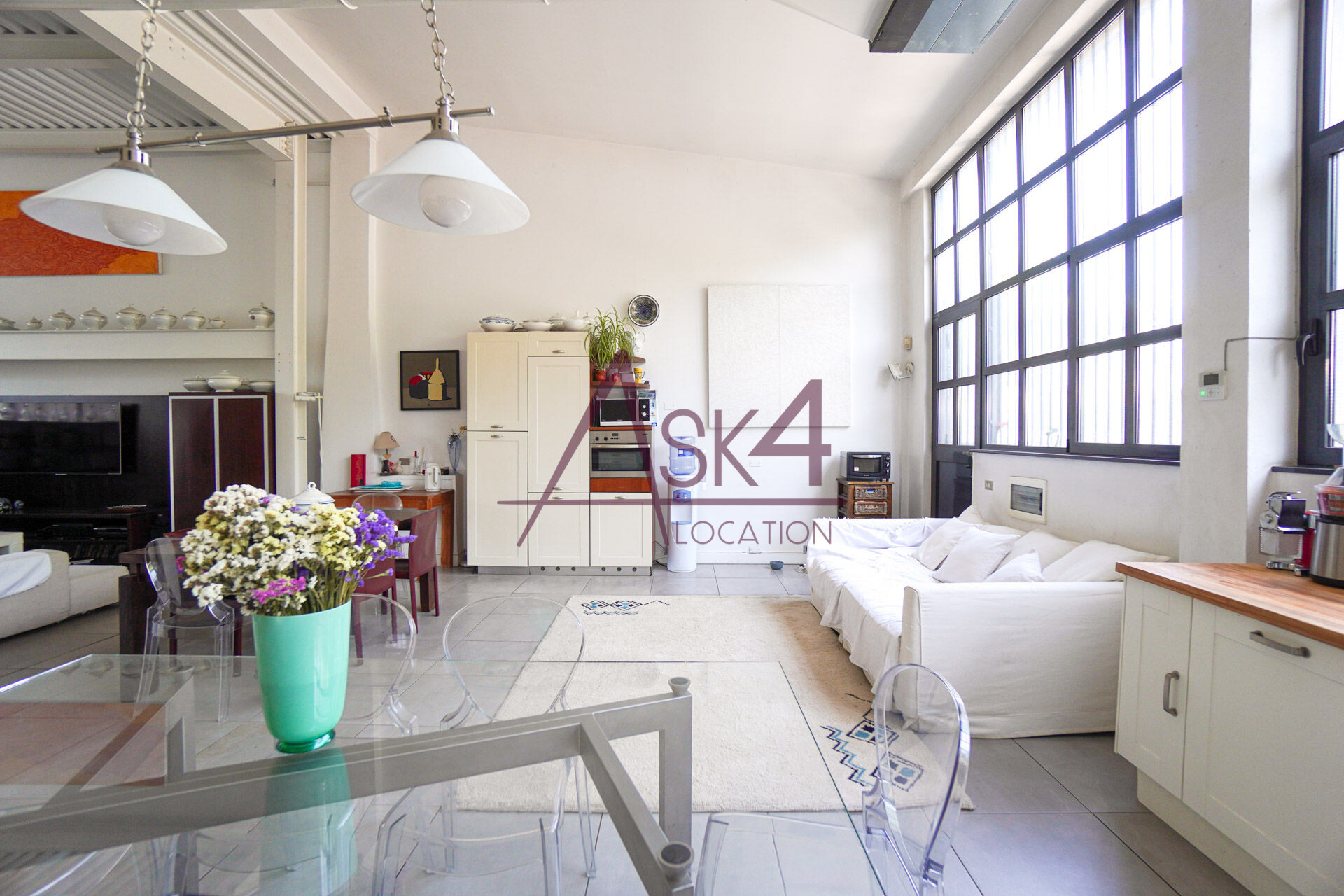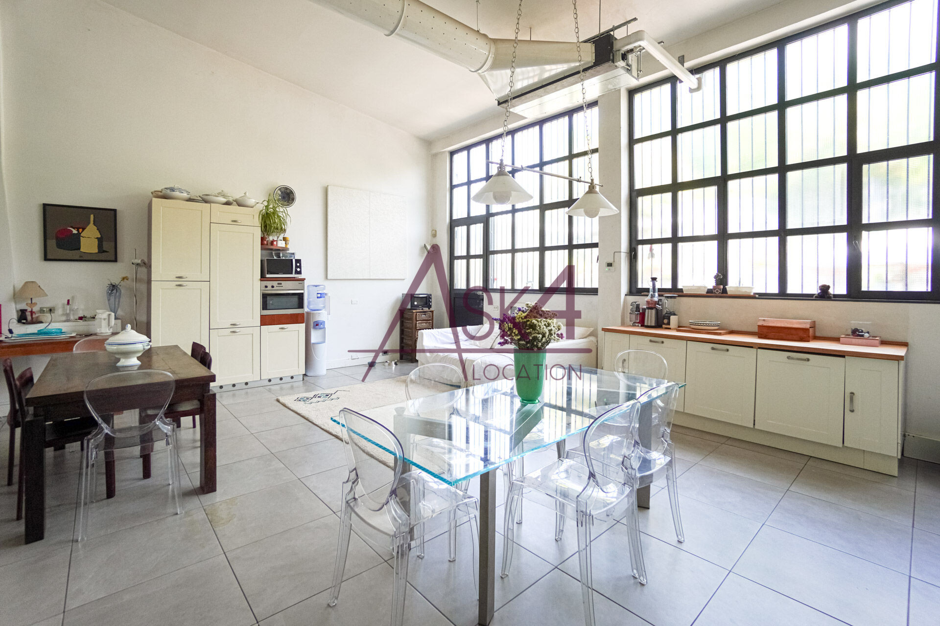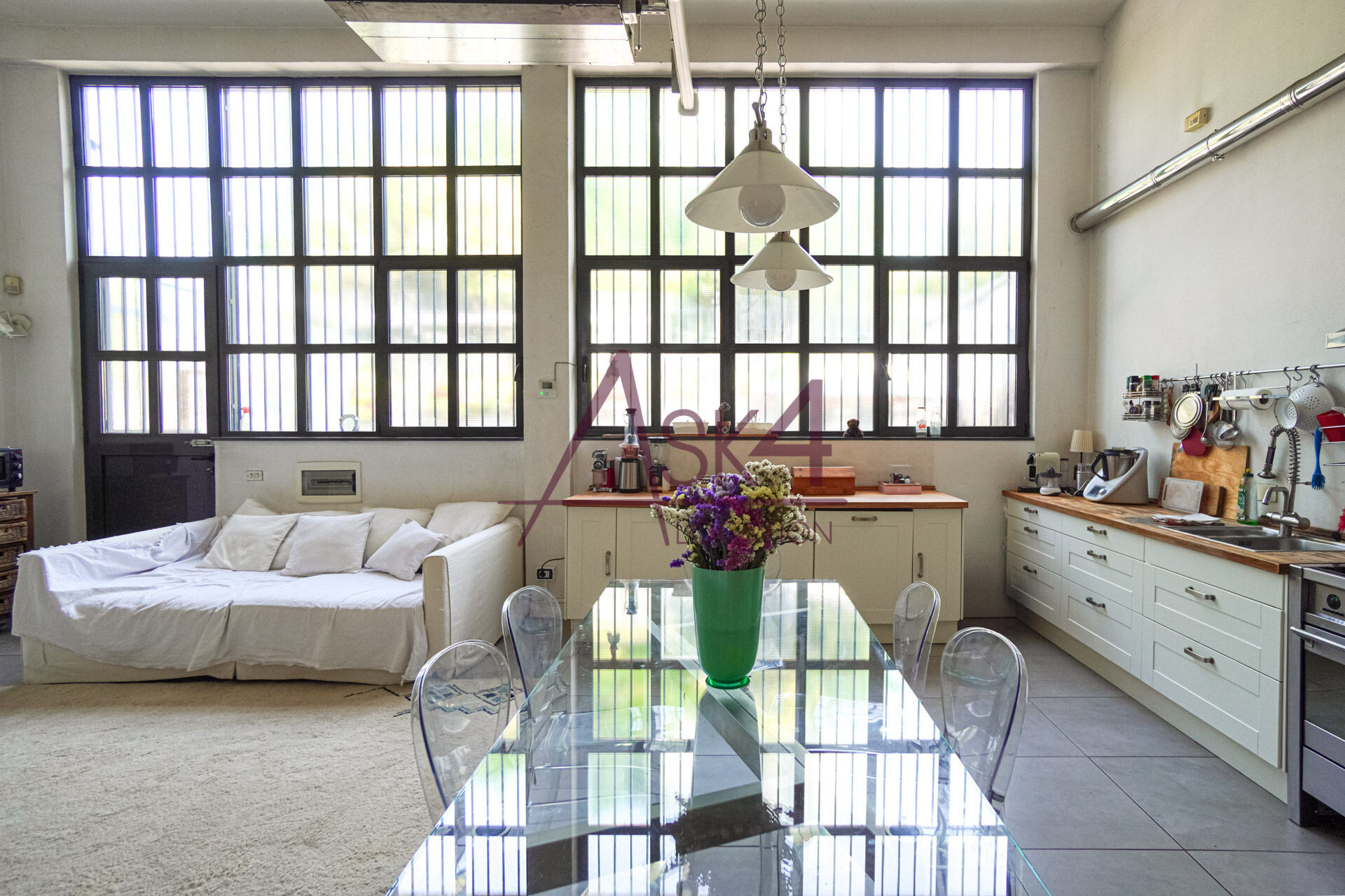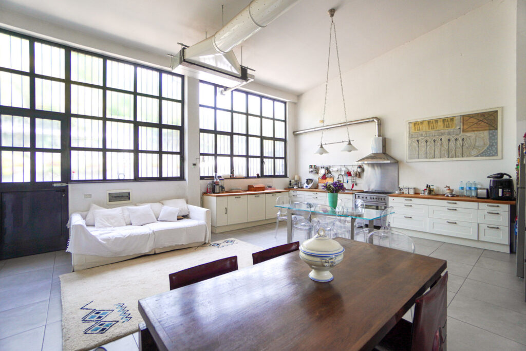 Il loft dispone anche di un angolo cucina con tavolo in vetro e sedute trasparenti, perfetto per shooting food o ambientazioni lifestyle, oltre a una zona living con divani chiari e arredi in legno scuro che aggiungono profondità e texture alle inquadrature.