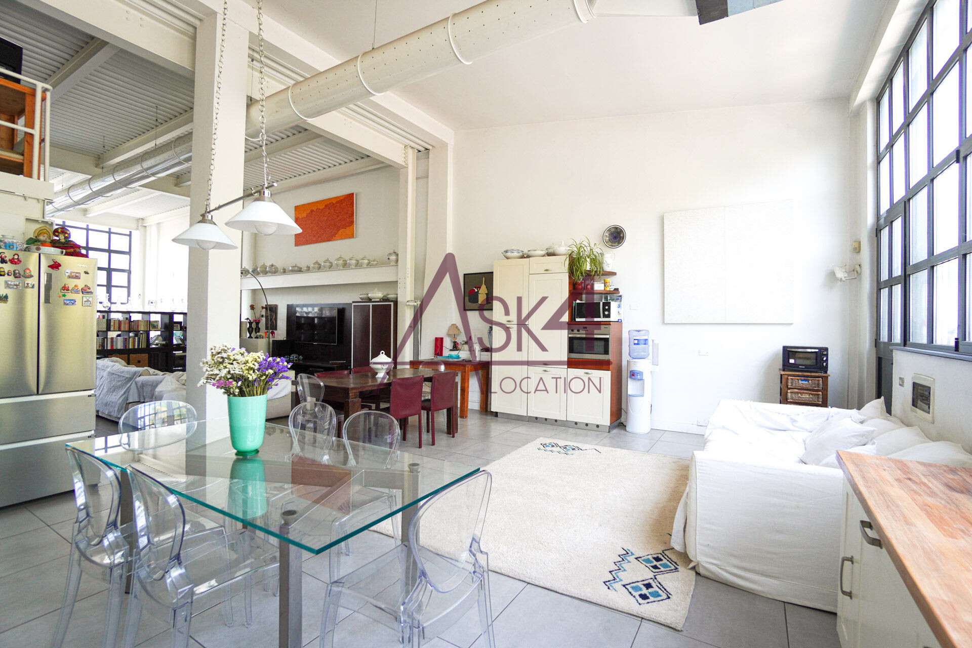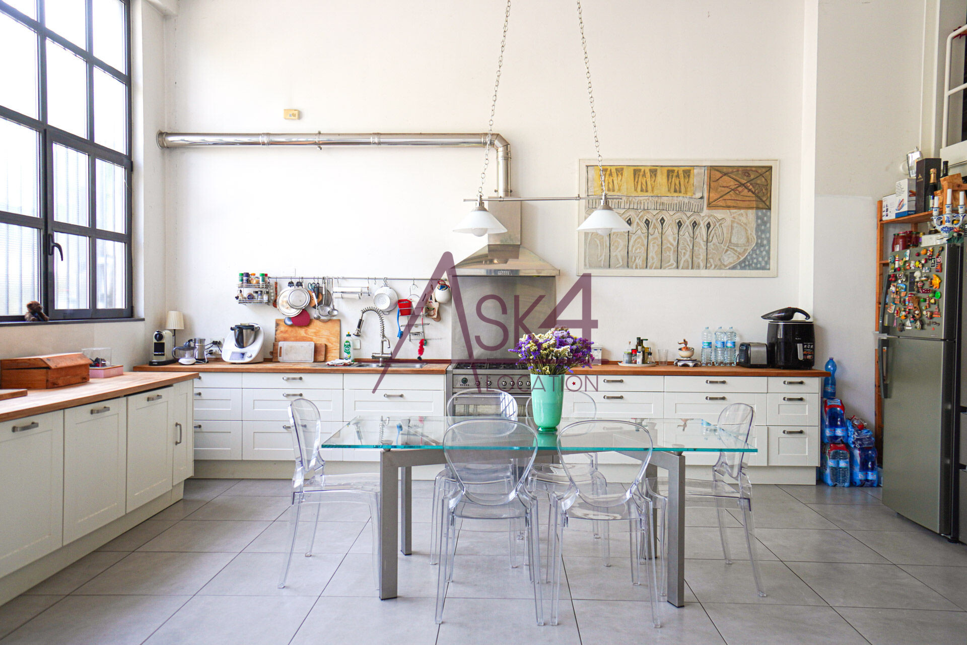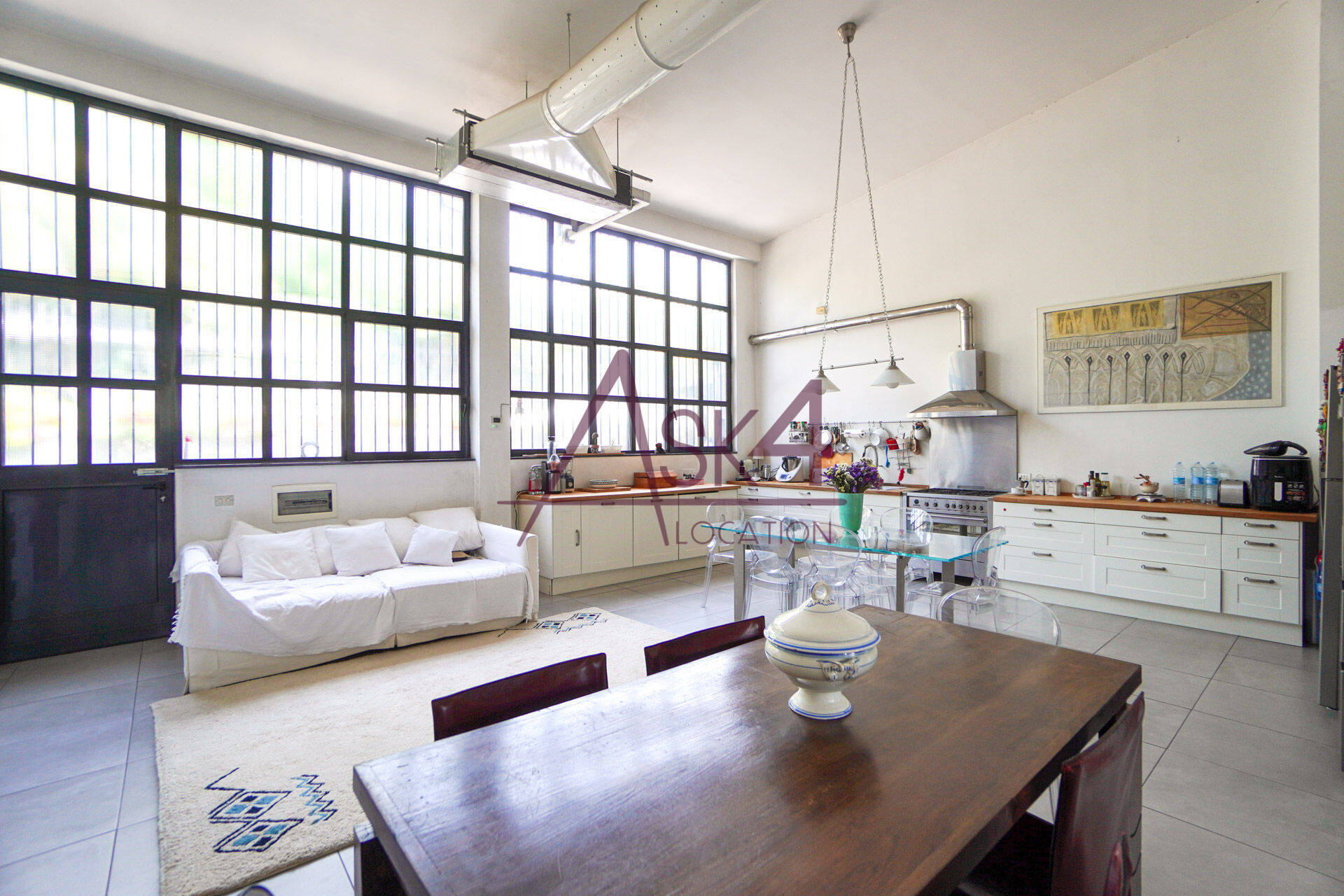 Il loft dispone anche di un angolo cucina con tavolo in vetro e sedute trasparenti, perfetto per shooting food o ambientazioni lifestyle, oltre a una zona living con divani chiari e arredi in legno scuro che aggiungono profondità e texture alle inquadrature.