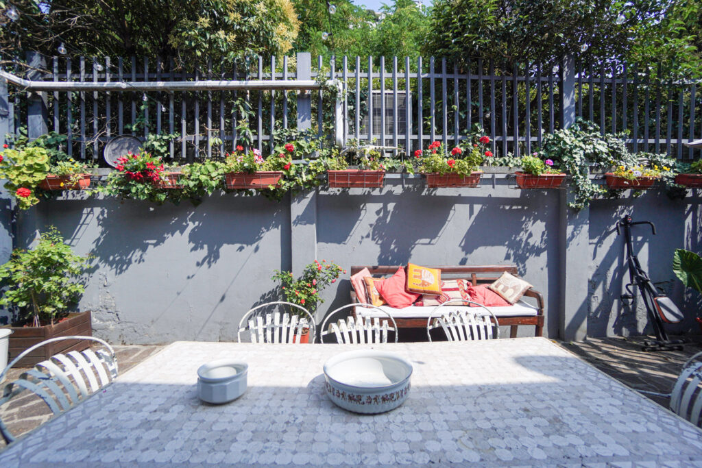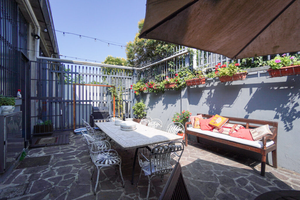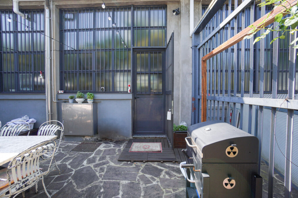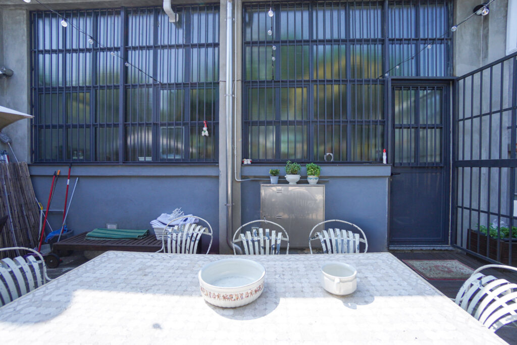 Un elemento distintivo del Loft di Antonio è il suo cortile interno, uno spazio esterno raccolto ma ricco di dettagli visivi, ideale per shooting panoramici e riprese in esterna. Il giardino, circondato da pareti in cemento e griglie in ferro, è arricchito da fioriere con piante rampicanti, creando un contrasto interessante tra elementi naturali e industriali.