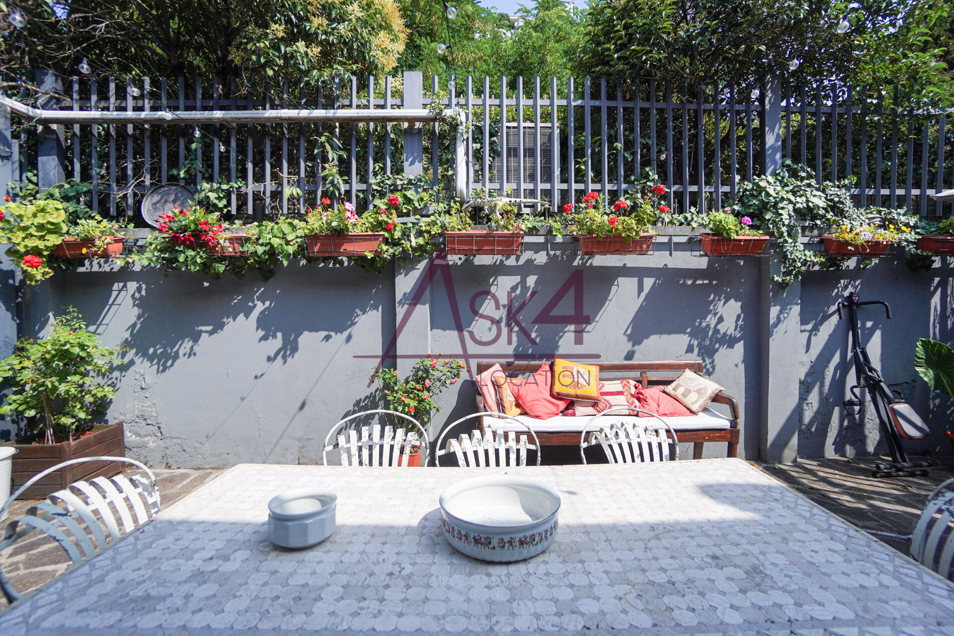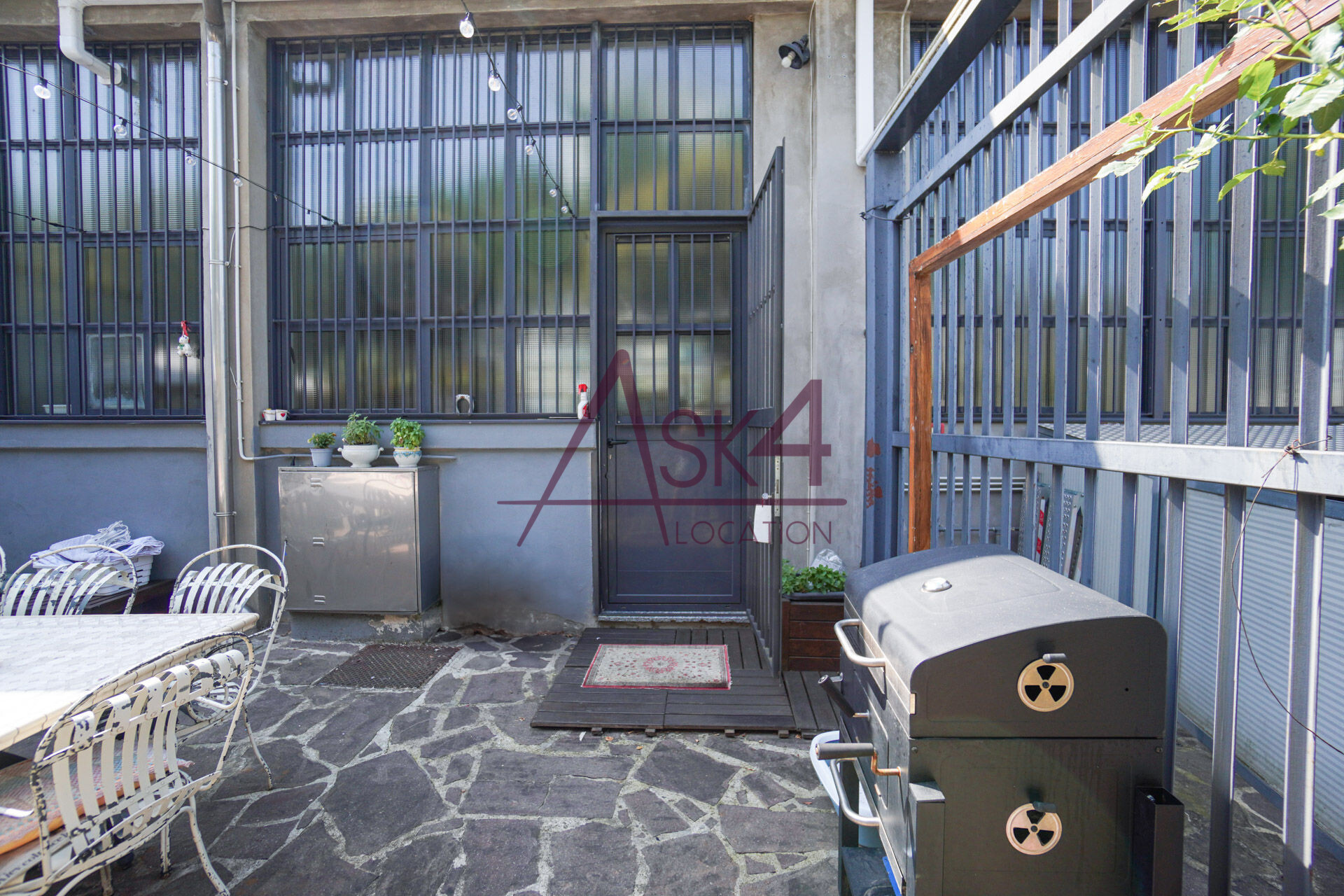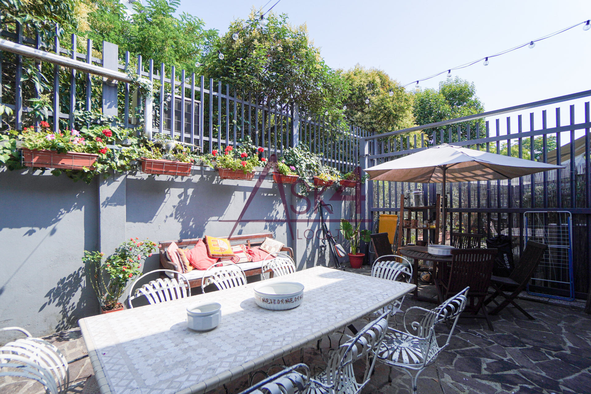 Un elemento distintivo del Loft di Antonio è il suo cortile interno, uno spazio esterno raccolto ma ricco di dettagli visivi, ideale per shooting panoramici e riprese in esterna. Il giardino, circondato da pareti in cemento e griglie in ferro, è arricchito da fioriere con piante rampicanti, creando un contrasto interessante tra elementi naturali e industriali.