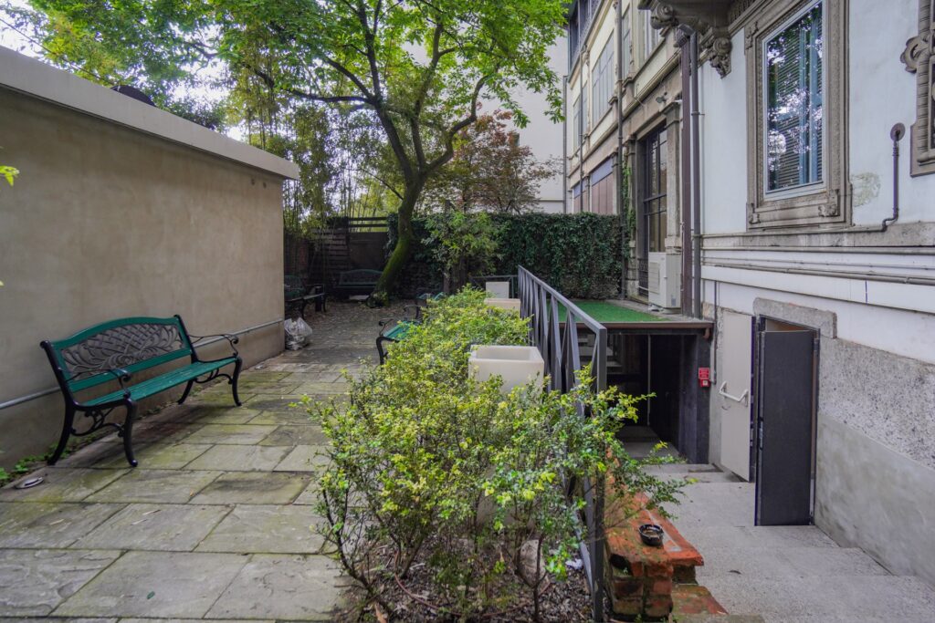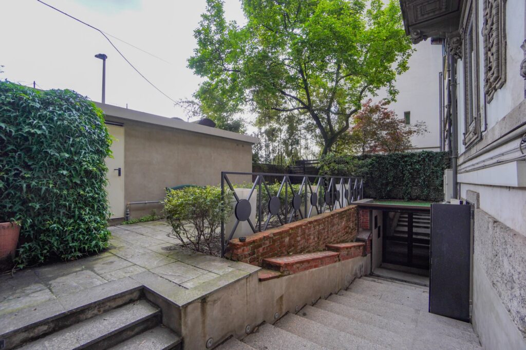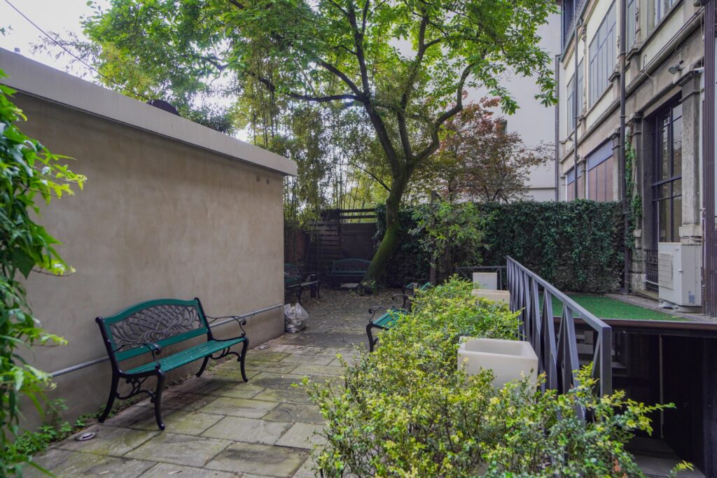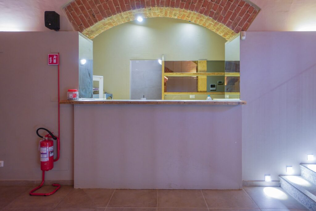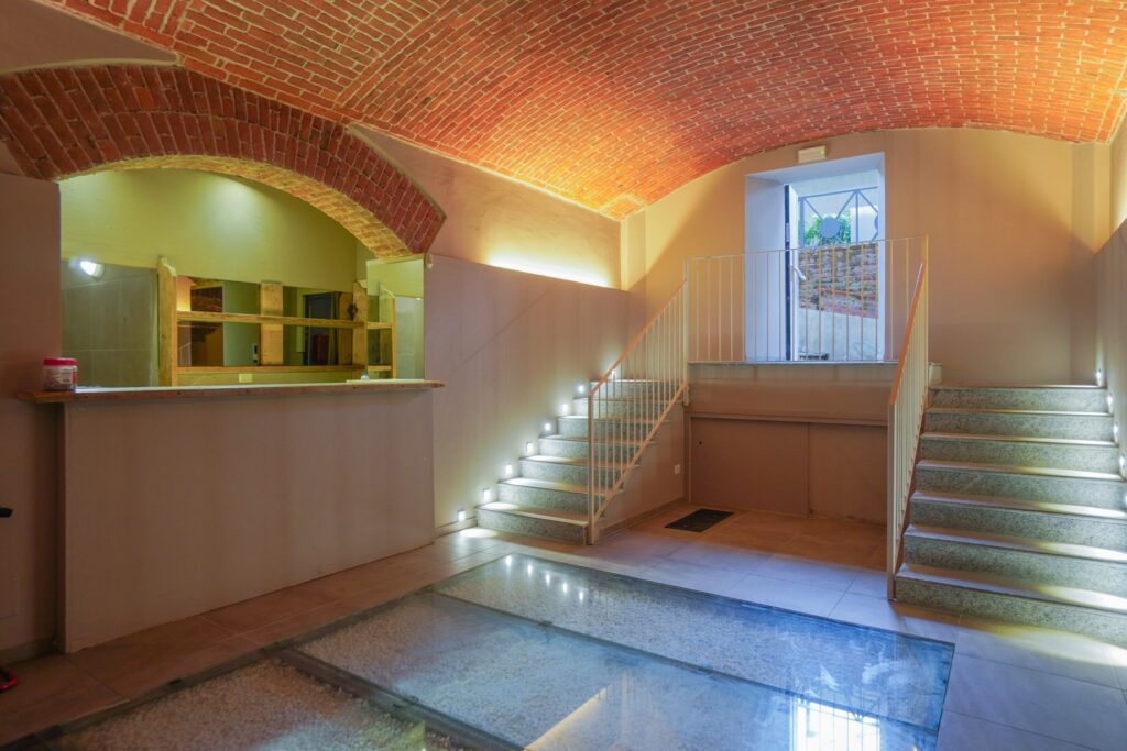 Una zona reception con bancone in muratura e retroilluminazione, insieme a una corte esterna, completano l’offerta logistica della location. L’area esterna, discreta e alberata, rappresenta uno sfondo ideale per shooting in esterna o piani d’appoggio per troupe e attrezzature.