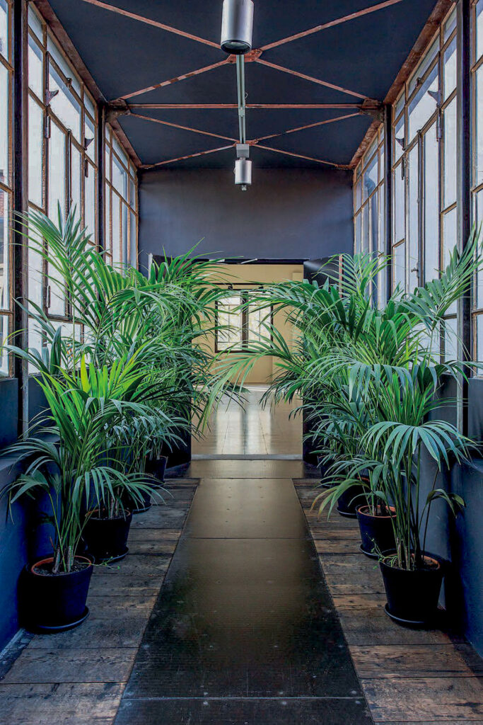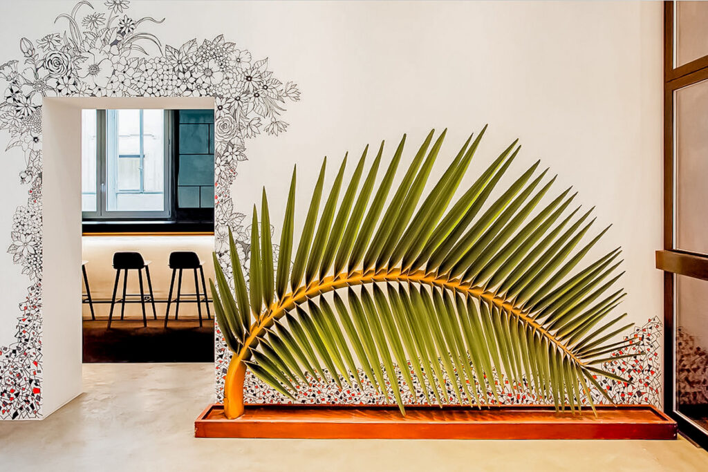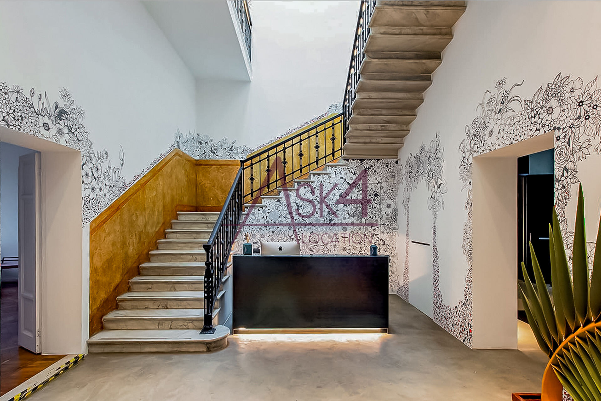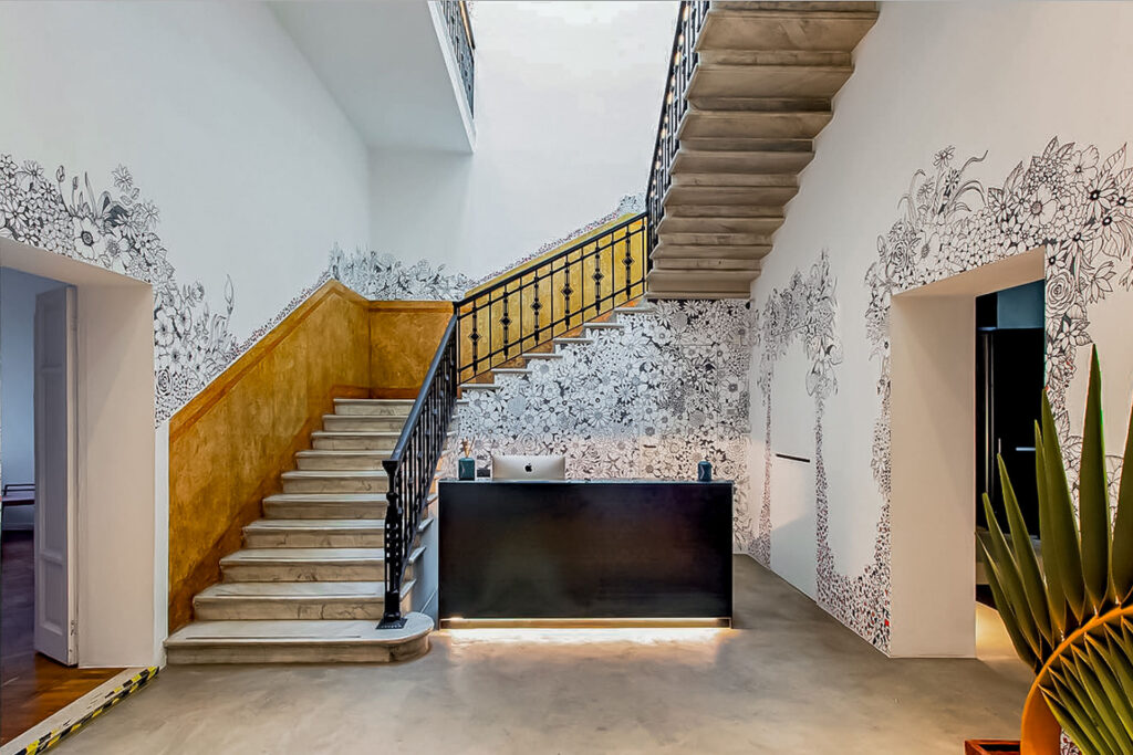 Un altro elemento scenografico è rappresentato dalla zona ingresso, caratterizzata da una parete decorata con illustrazioni floreali e una scalinata in ferro battuto, che aggiunge un tocco artistico all’estetica industriale dello spazio. Angoli come questo diventano set perfetti per shooting creativi o contenuti social dal forte impatto visivo.