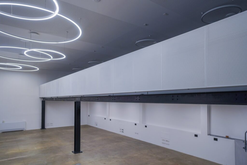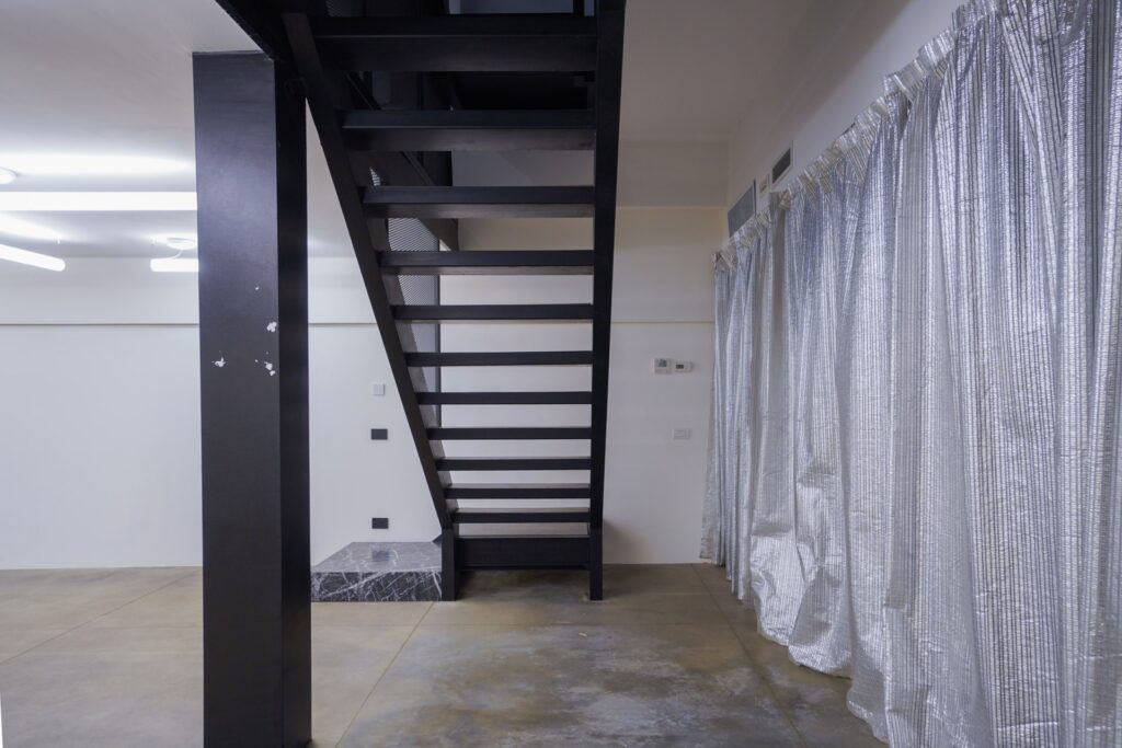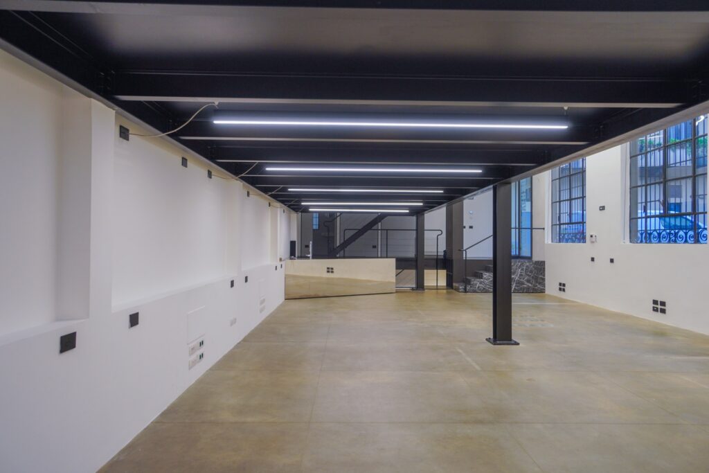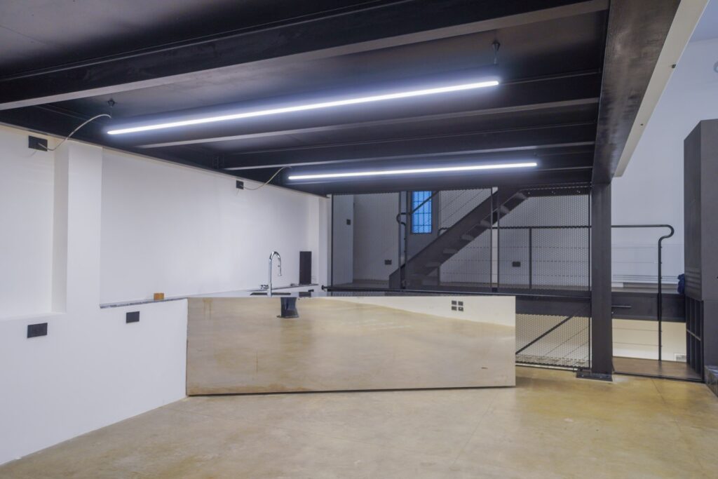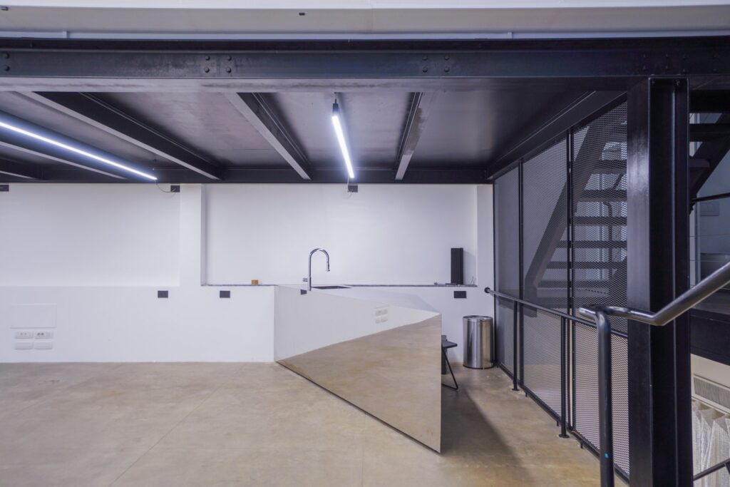 Lo Spazio di Eren si distingue per la sua estetica rigorosa e per la presenza di elementi che richiamano il mondo industriale. Travi in ferro nero, scale metalliche e volumi architettonici netti dialogano con superfici neutre, generando un ambiente visivamente potente e al tempo stesso adattabile.