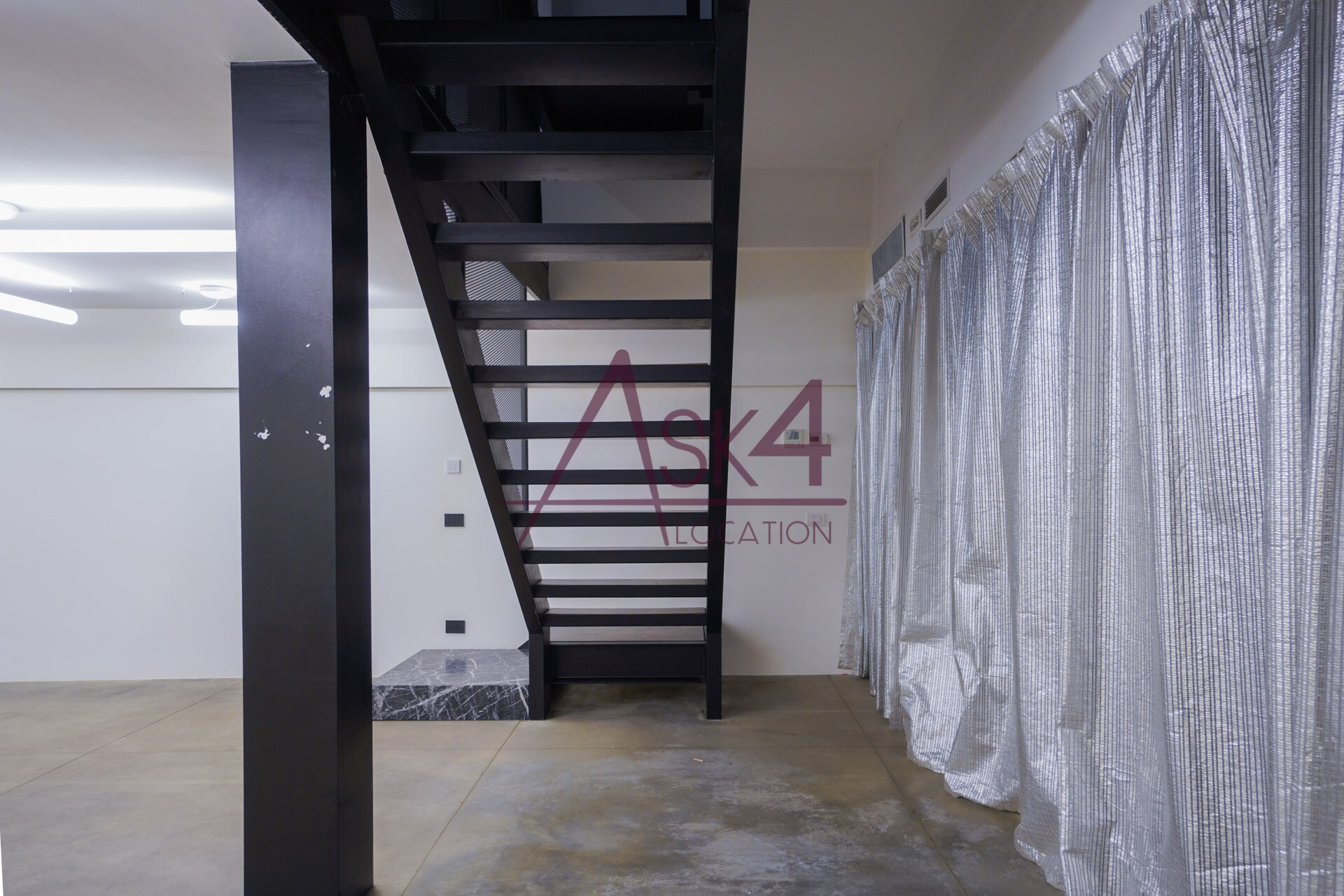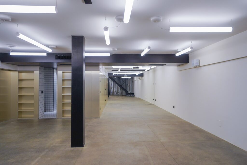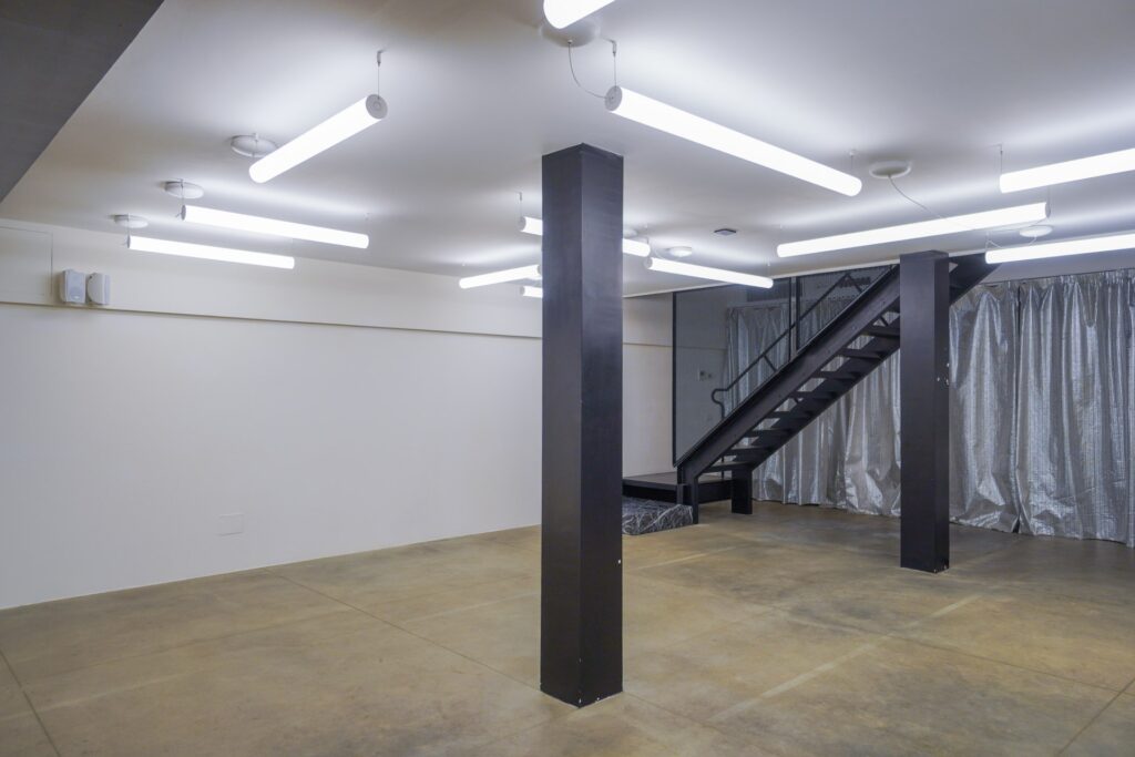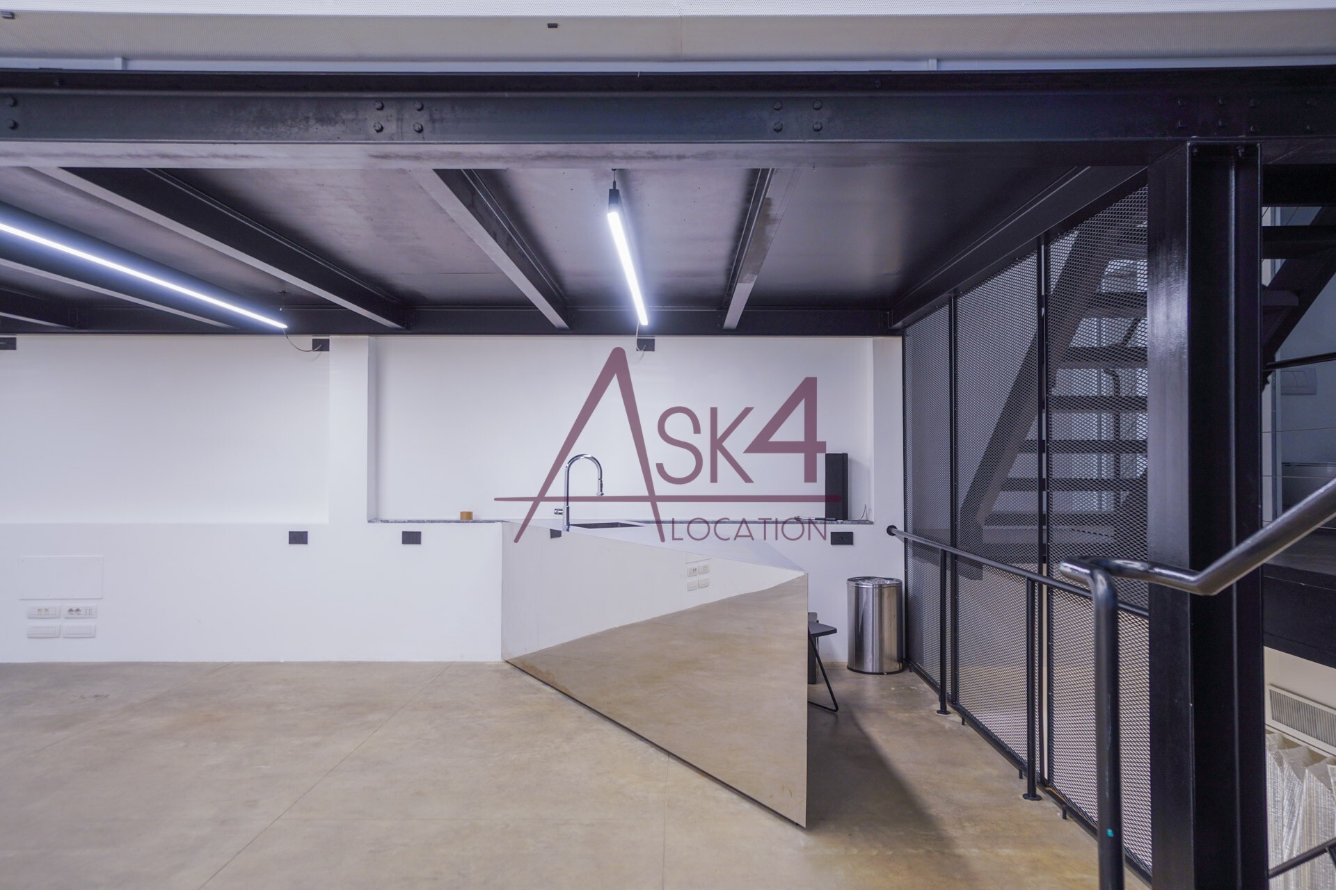 Lo Spazio di Eren si distingue per la sua estetica rigorosa e per la presenza di elementi che richiamano il mondo industriale. Travi in ferro nero, scale metalliche e volumi architettonici netti dialogano con superfici neutre, generando un ambiente visivamente potente e al tempo stesso adattabile.
