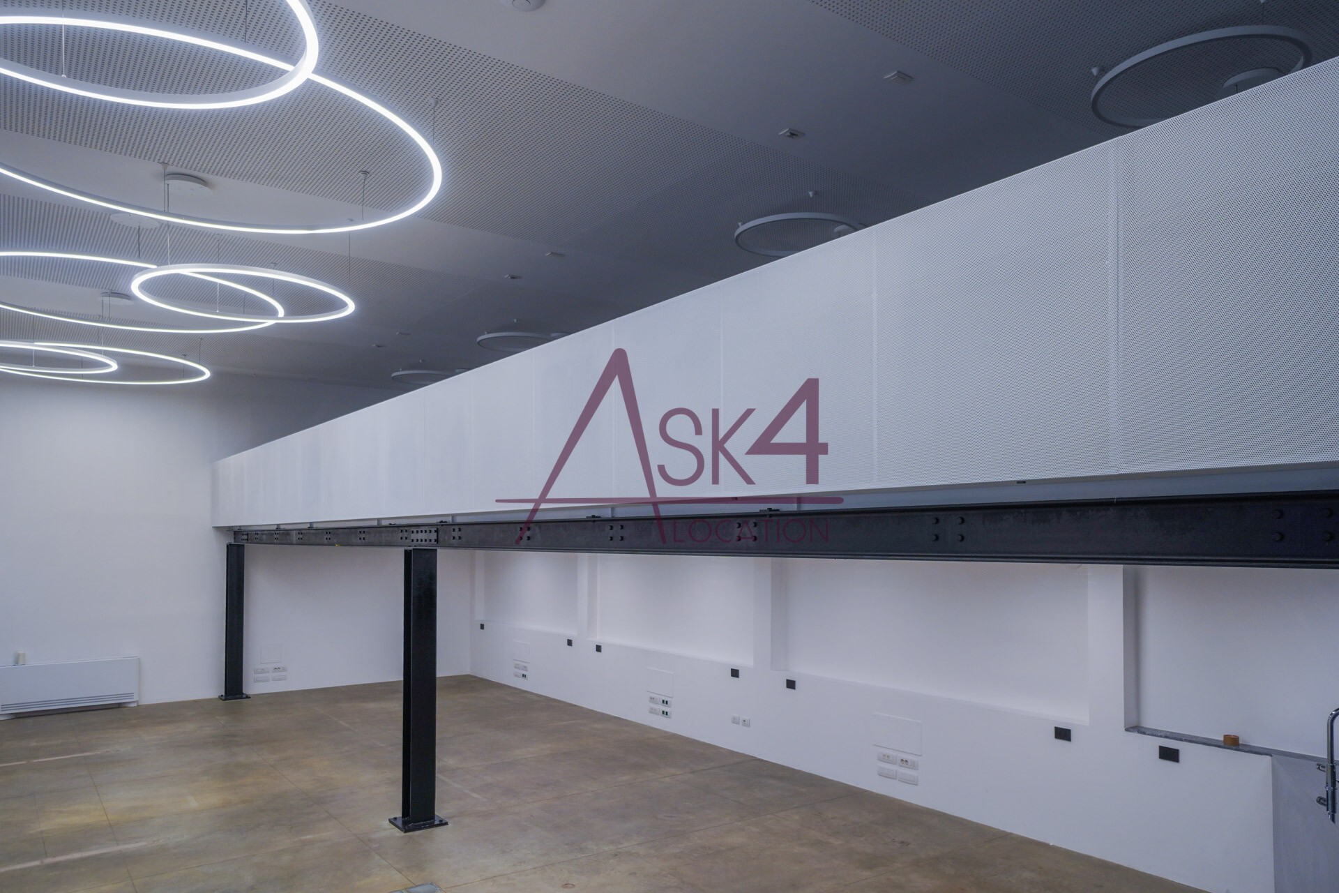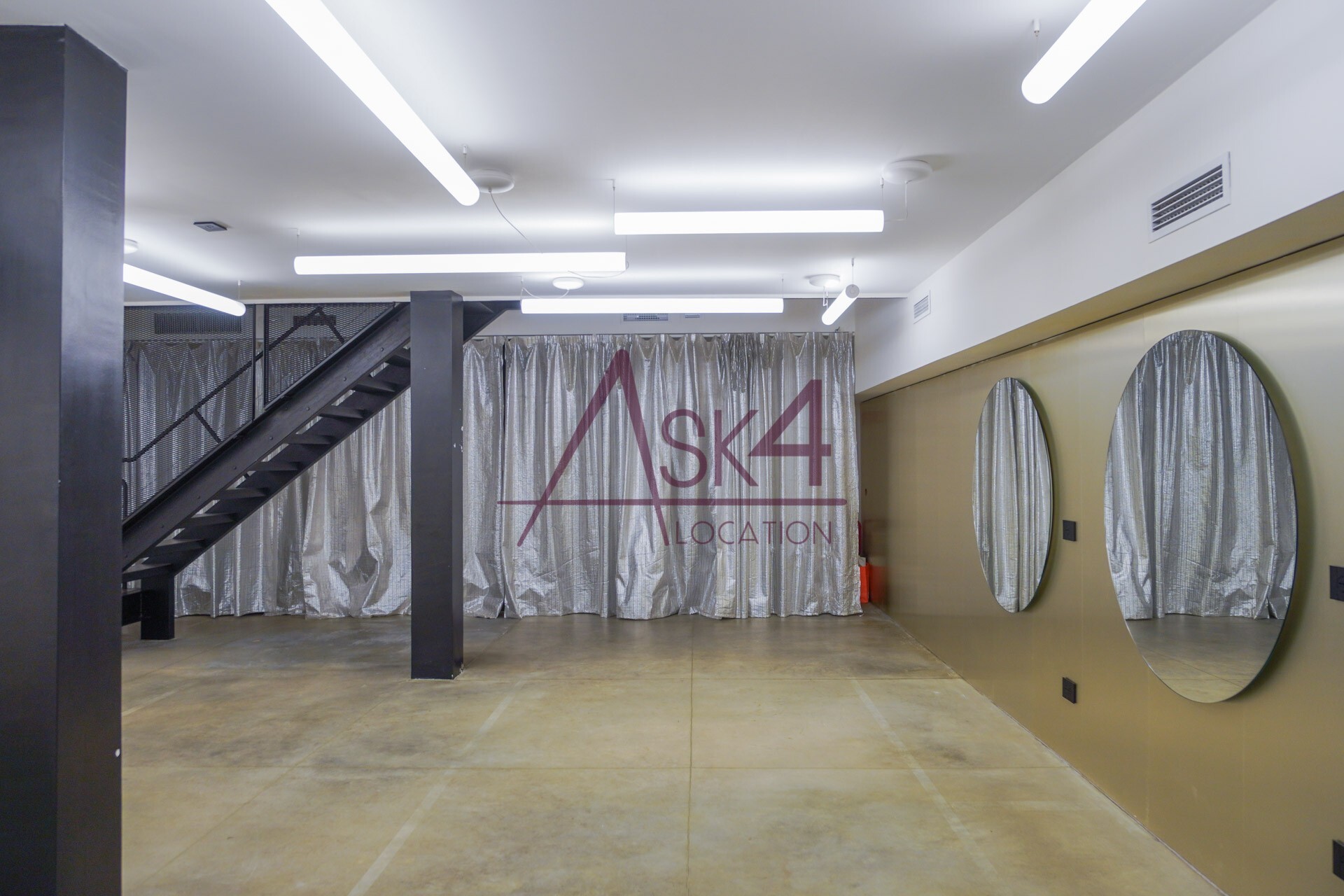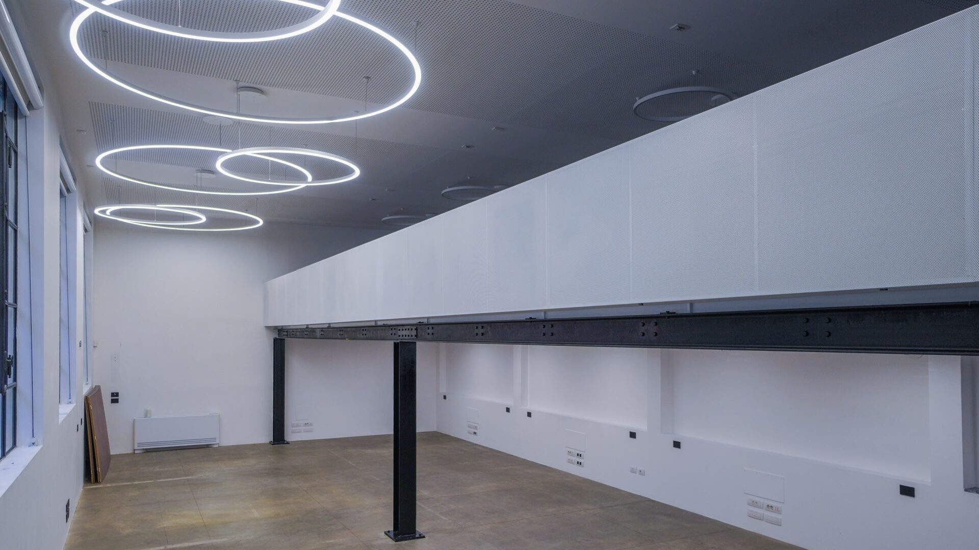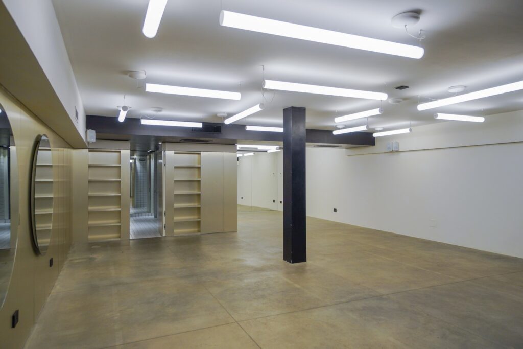 Il design minimalista, arricchito da materiali industriali come ferro, cemento e vetro, crea uno sfondo neutro e versatile per produzioni di moda ed editoriali. Gli anelli luminosi sospesi e le linee geometriche essenziali accentuano la verticalità dello spazio, offrendo un impatto estetico che valorizza ogni scatto.