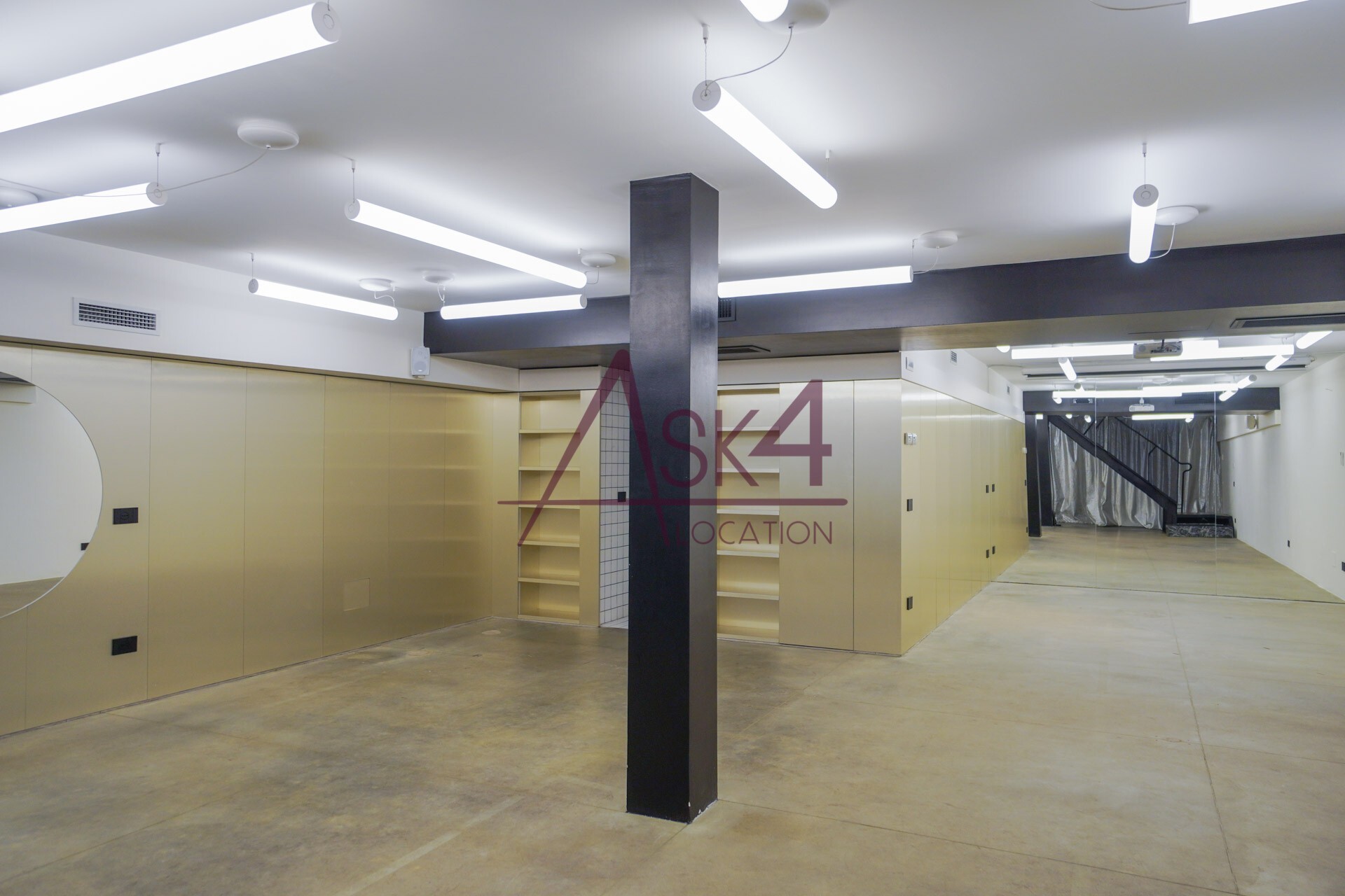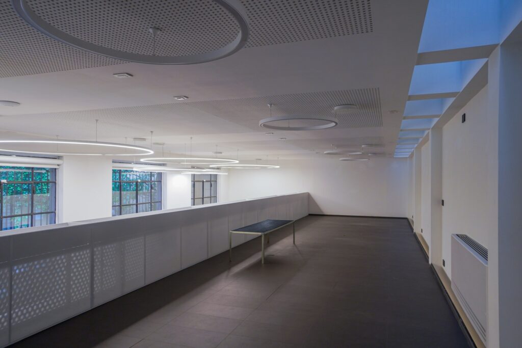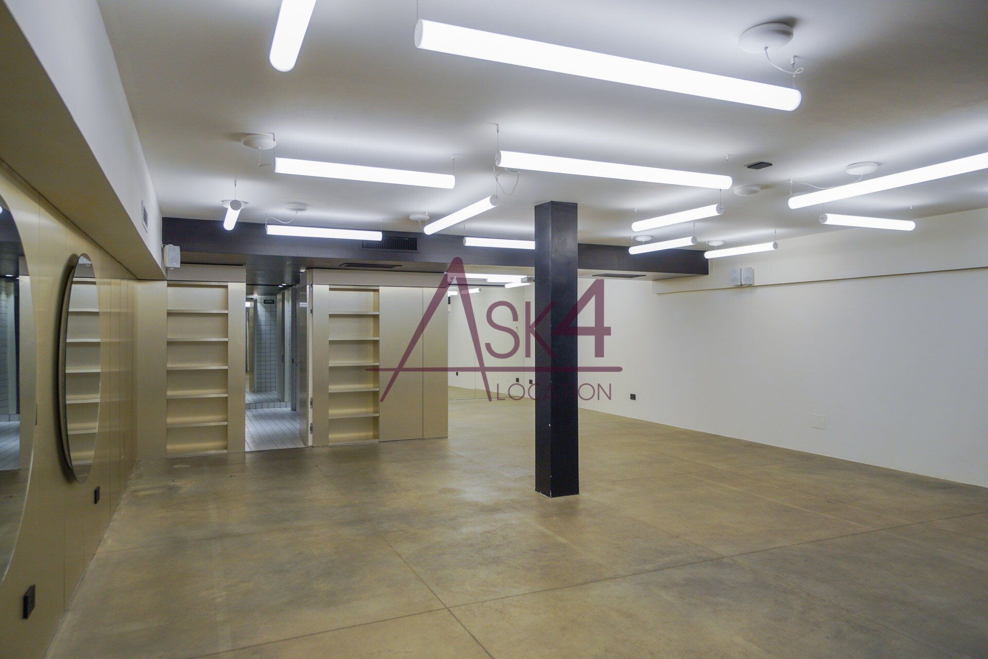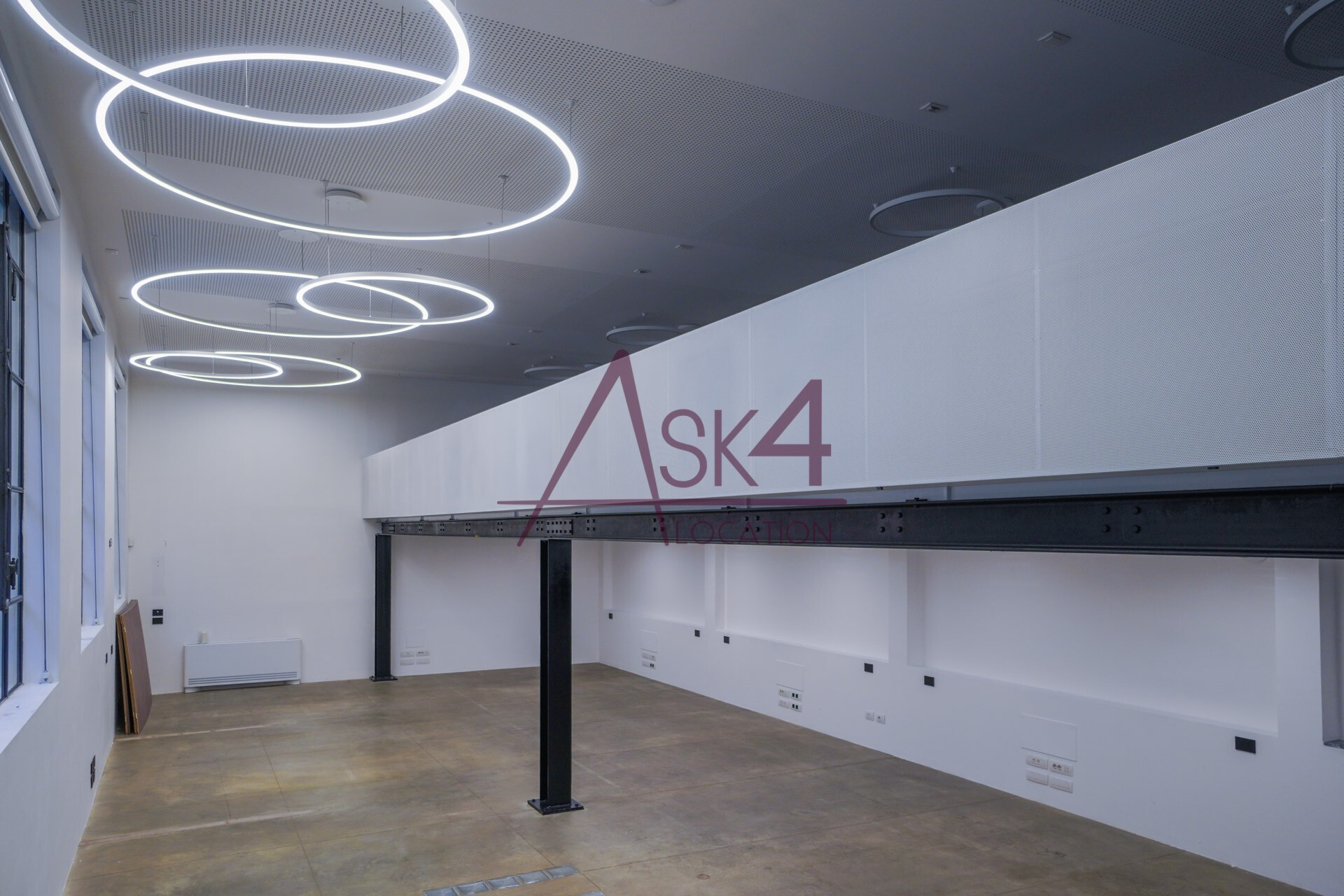 Il design minimalista, arricchito da materiali industriali come ferro, cemento e vetro, crea uno sfondo neutro e versatile per produzioni di moda ed editoriali. Gli anelli luminosi sospesi e le linee geometriche essenziali accentuano la verticalità dello spazio, offrendo un impatto estetico che valorizza ogni scatto.