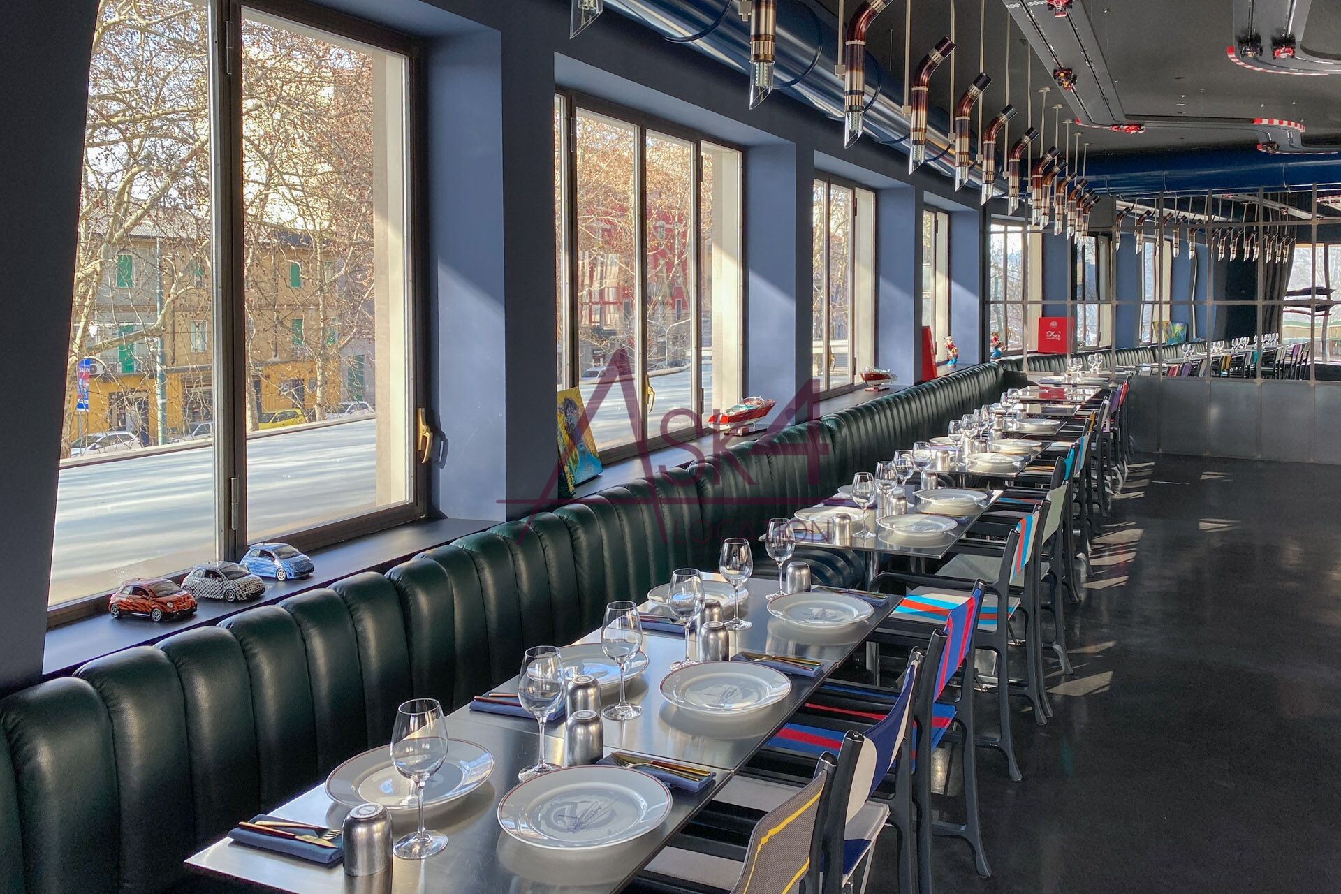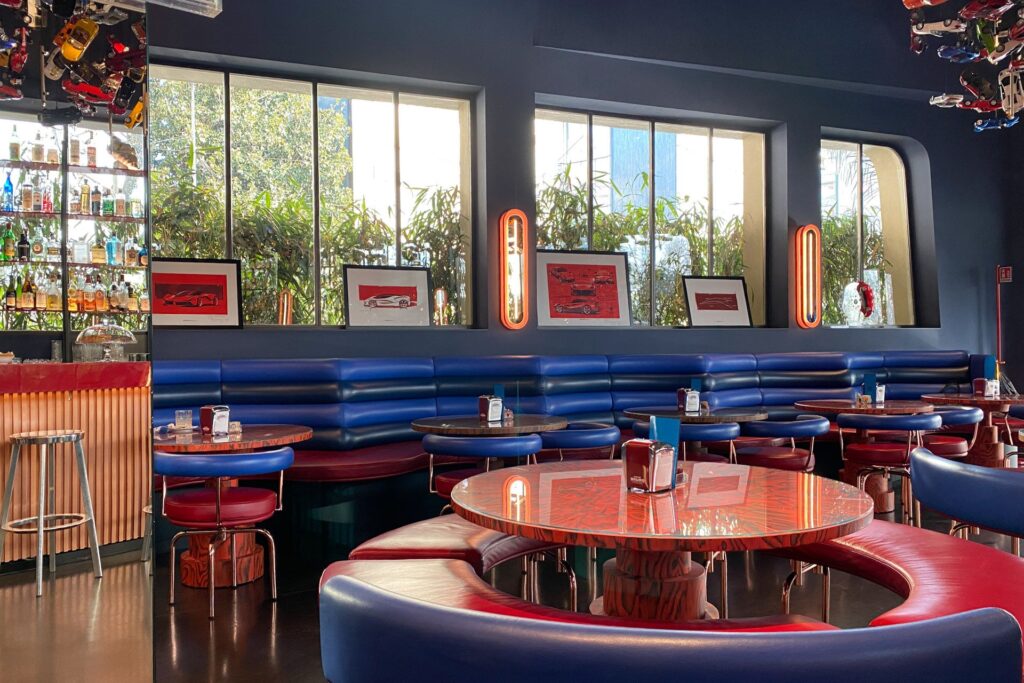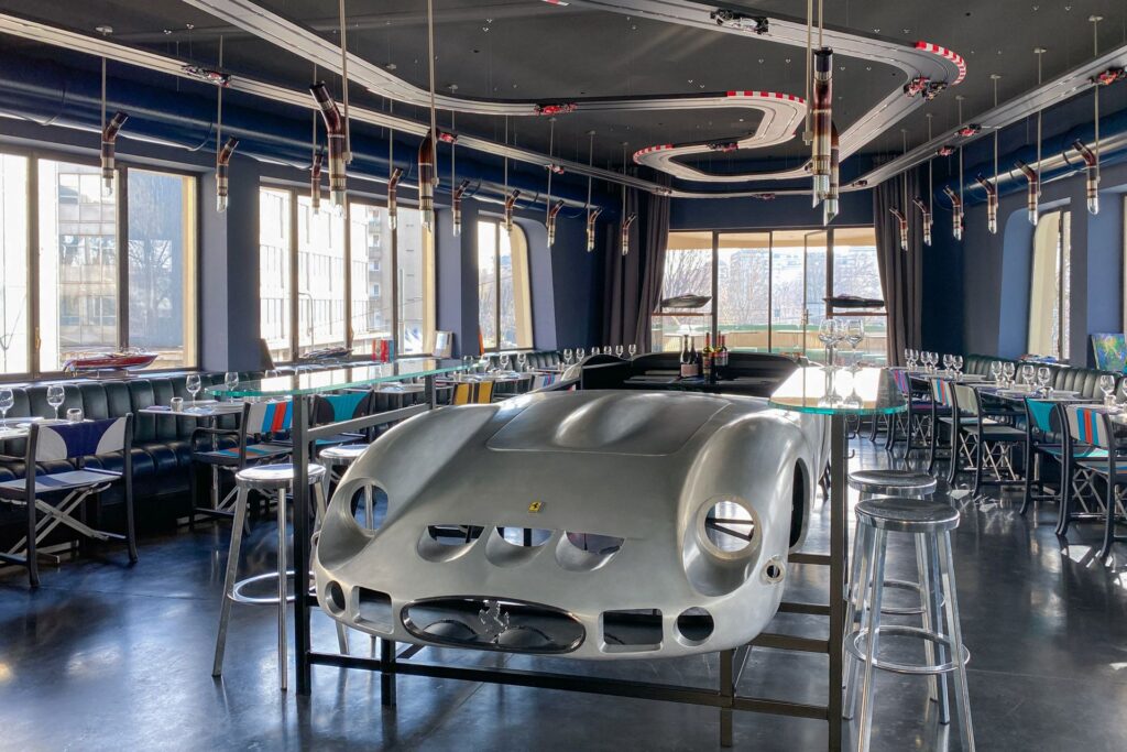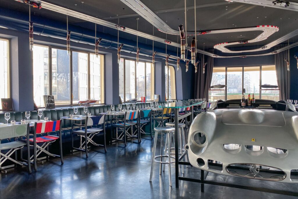 Accanto alla sala principale si apre una lounge d’impatto: sedute circolari dai colori pop, banco bar rétro e la scocca di una vettura d’epoca al centro creano uno sfondo carismatico per eventi di storytelling di marca, shooting automotive e interviste.