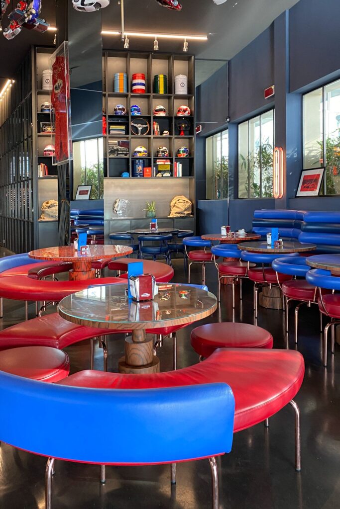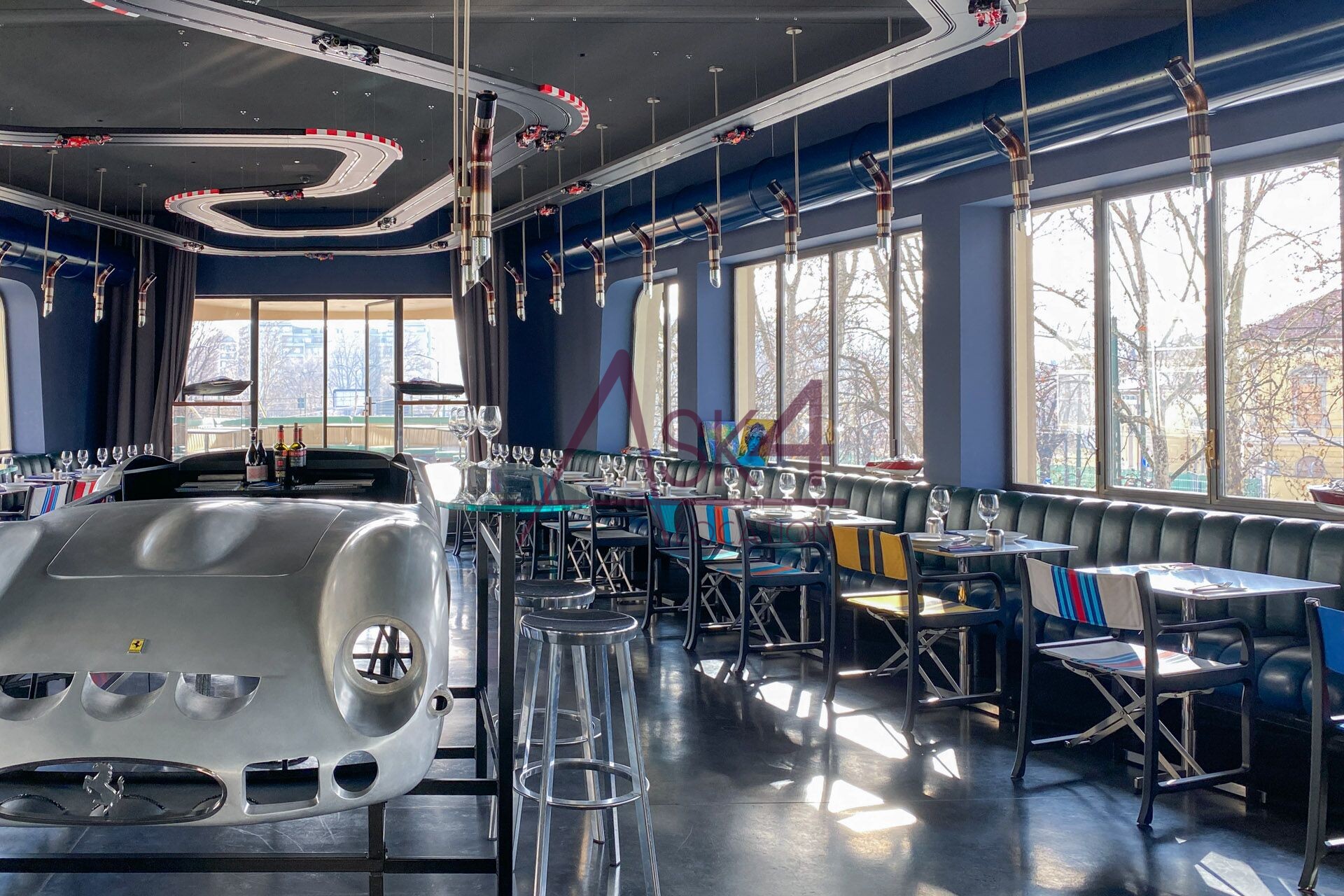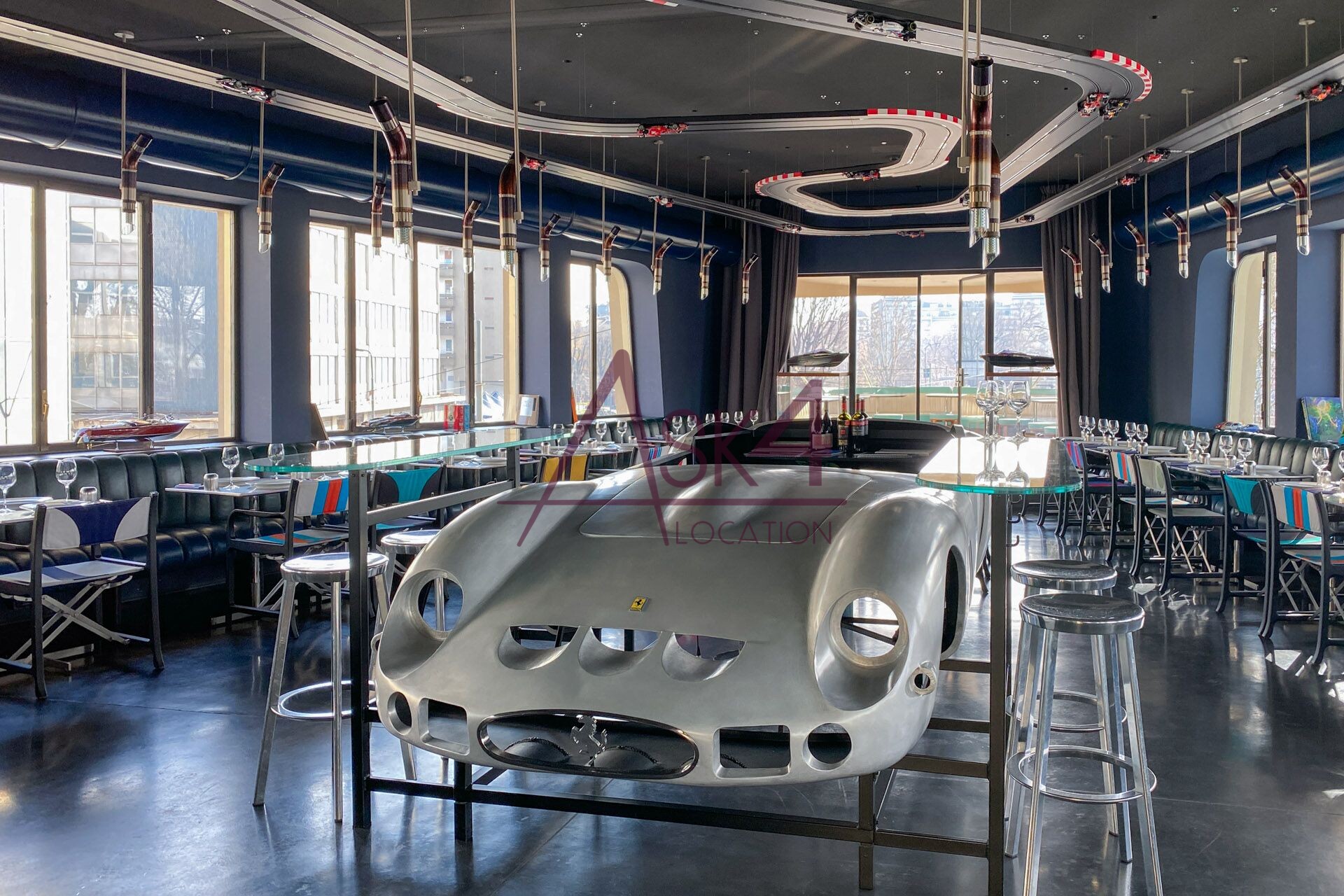 Accanto alla sala principale si apre una lounge d’impatto: sedute circolari dai colori pop, banco bar rétro e la scocca di una vettura d’epoca al centro creano uno sfondo carismatico per eventi di storytelling di marca, shooting automotive e interviste.