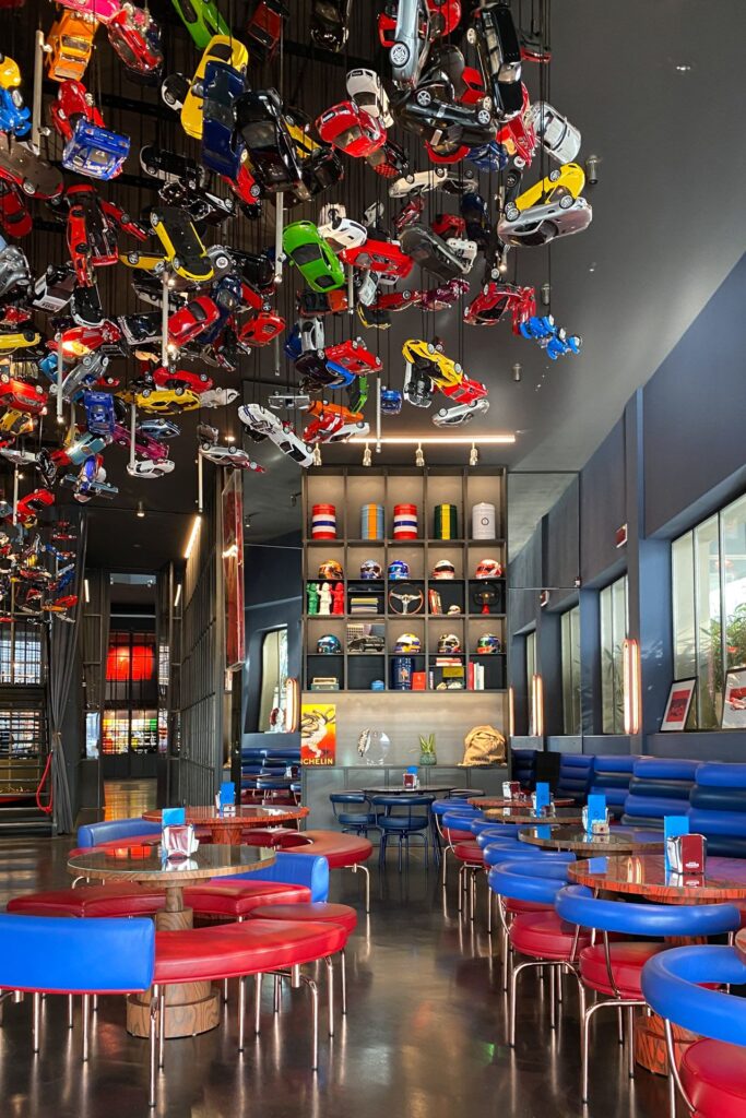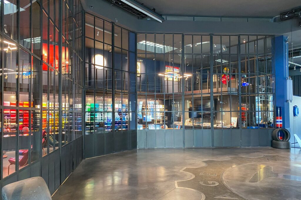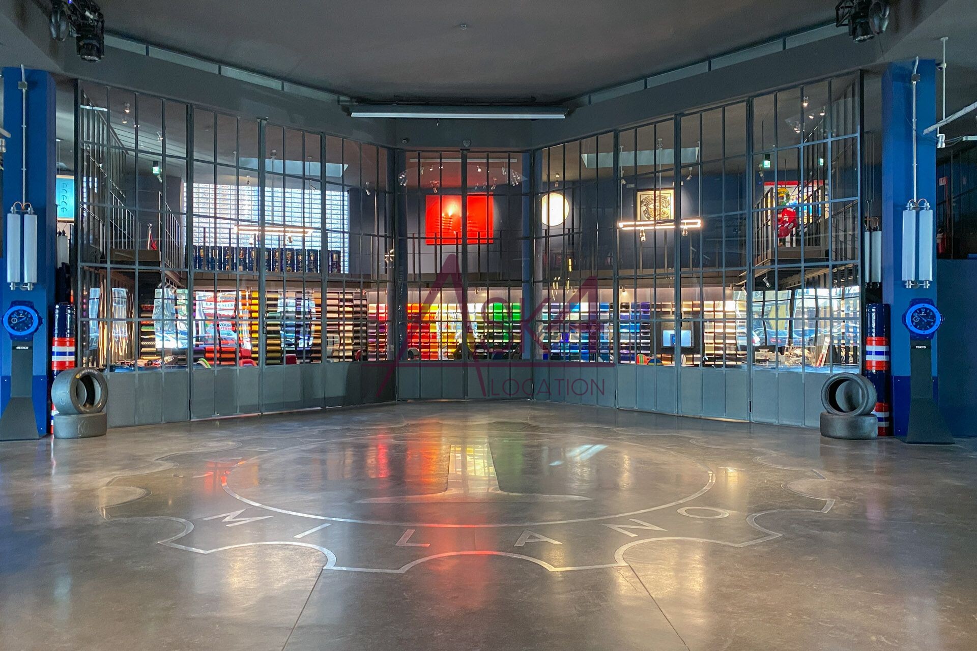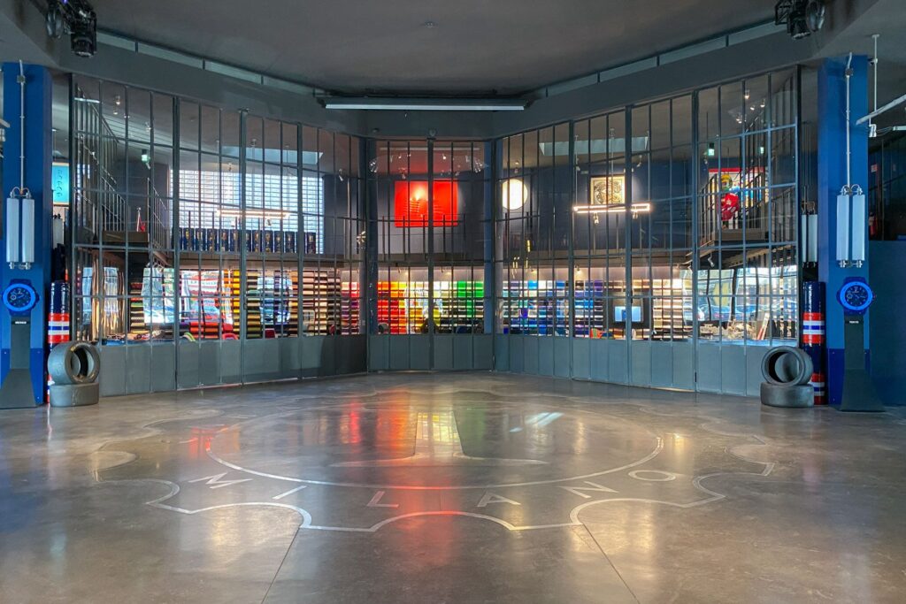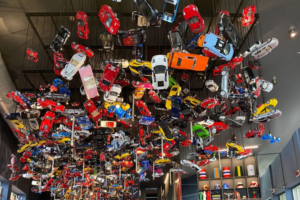 Sul soffitto, centinaia di modellini di auto sfrecciano su una pista sospesa, mentre gli espositori a tutta altezza ospitano oggetti di pop culture che diventano quinte cromatiche uniche per cataloghi fashion, collezioni limited edition o brand experience interattive.