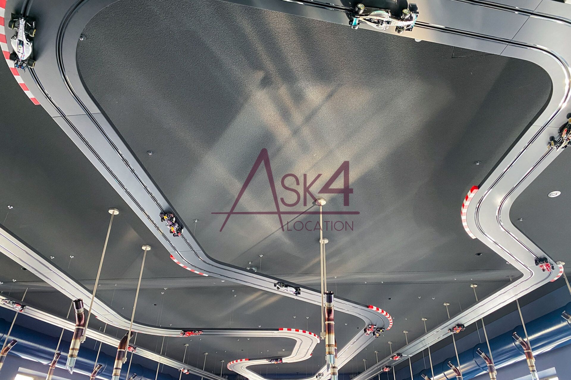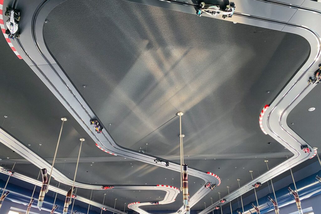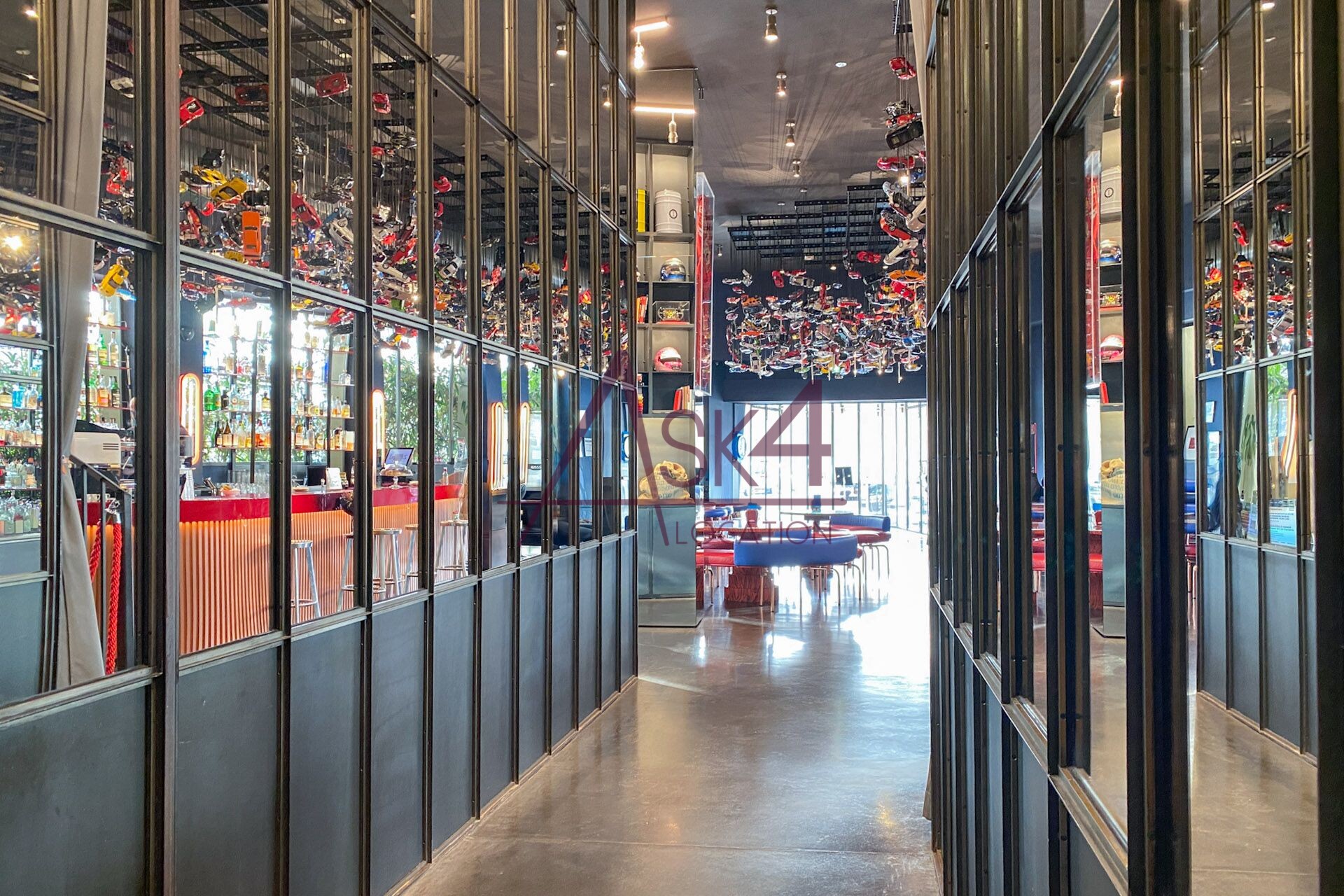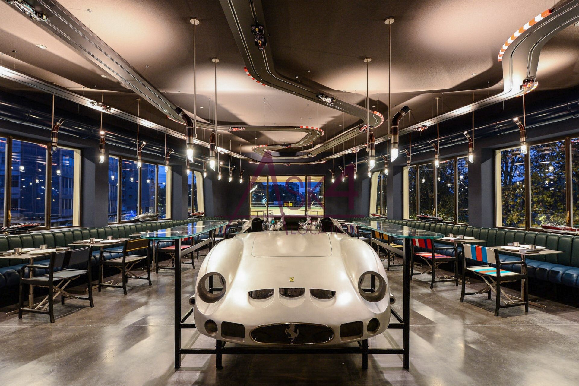 Sul soffitto, centinaia di modellini di auto sfrecciano su una pista sospesa, mentre gli espositori a tutta altezza ospitano oggetti di pop culture che diventano quinte cromatiche uniche per cataloghi fashion, collezioni limited edition o brand experience interattive.