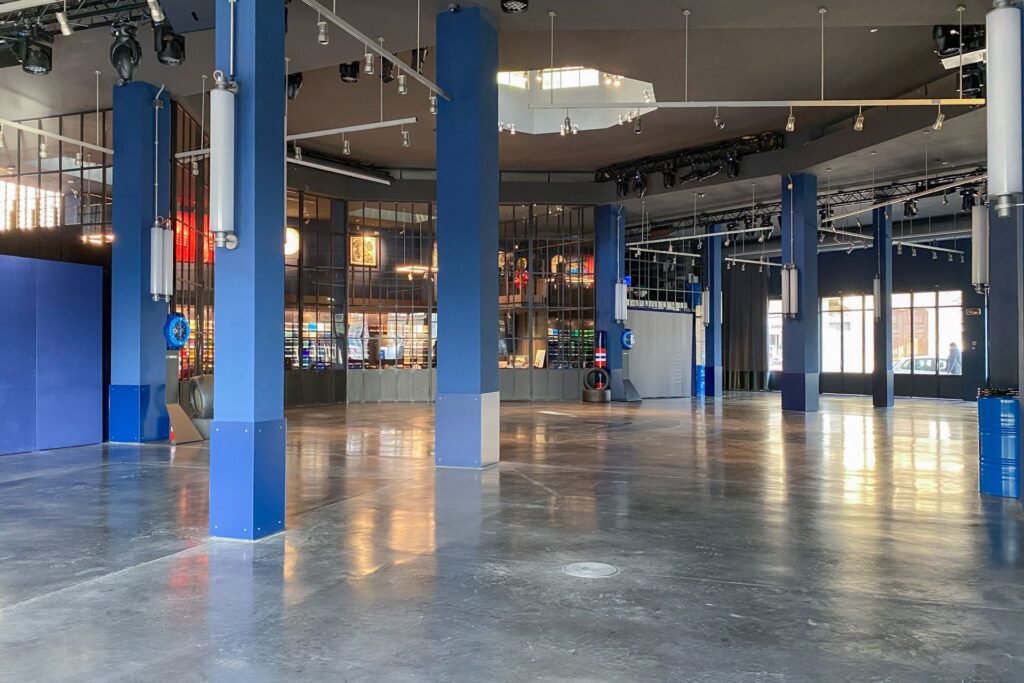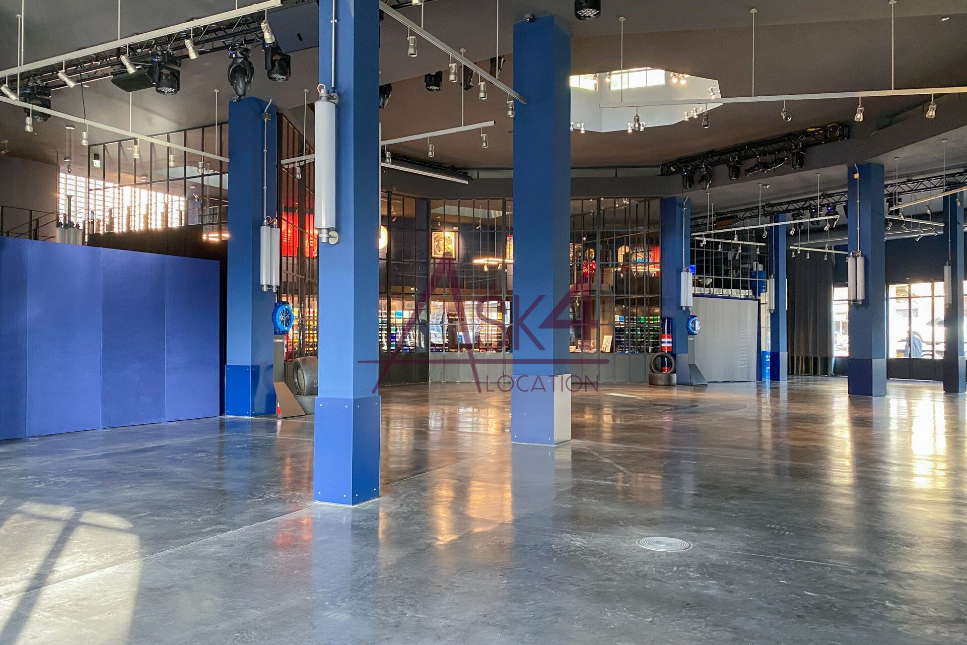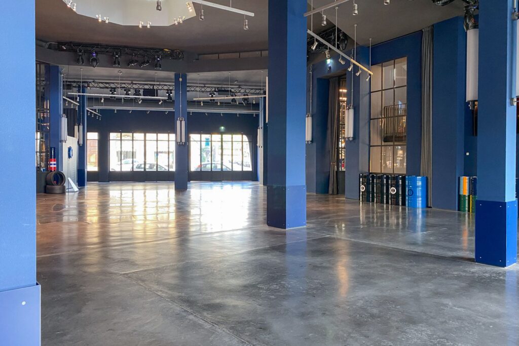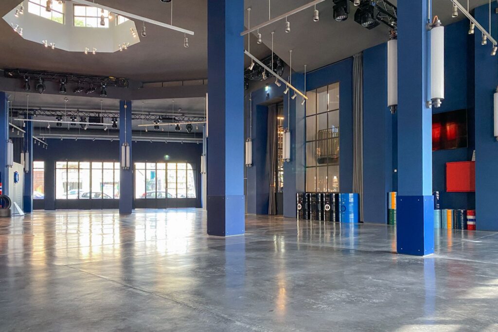 Il main hall accoglie troupe e ospiti in un open space luminoso: pavimentazione in cemento levigato, colonne in acciaio blu e una pianta priva di ingombri offrono la tela neutra perfetta per set fotografici, spot pubblicitari e presentazioni stampa.