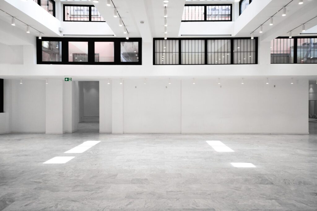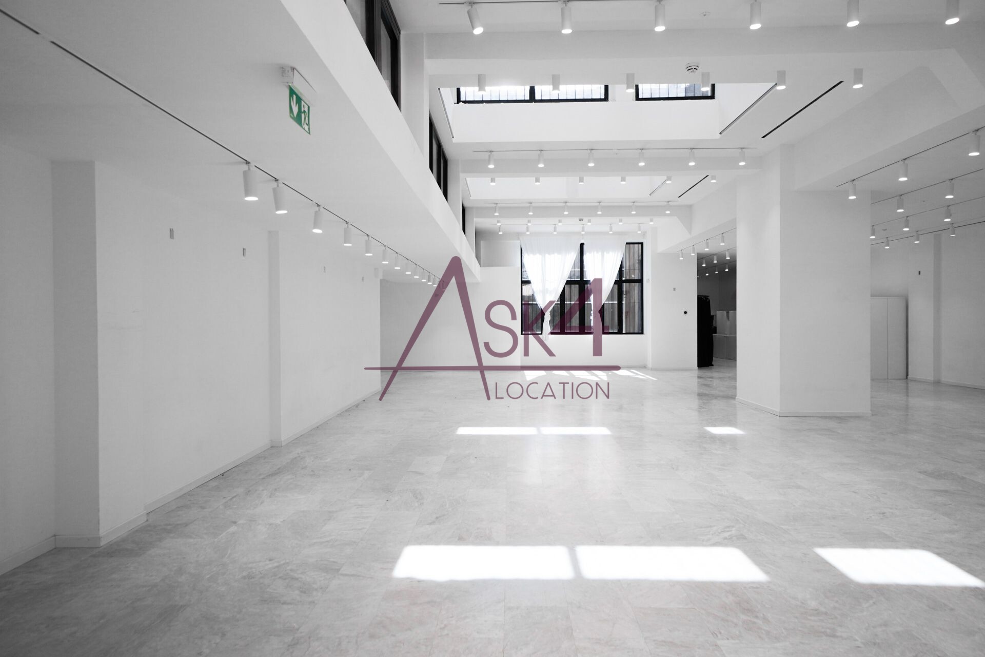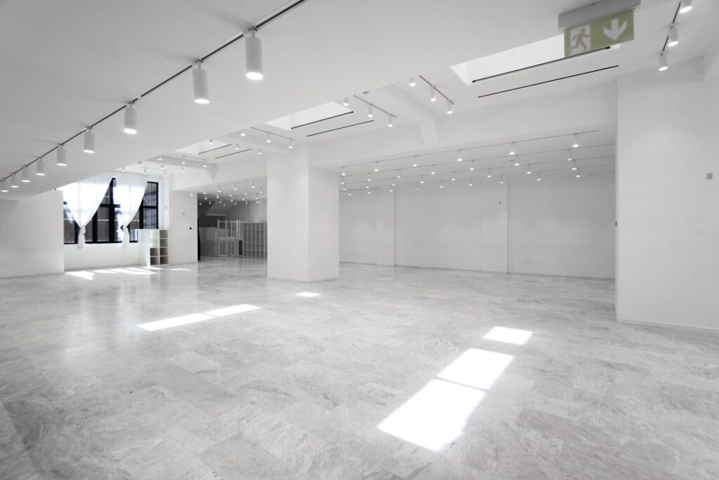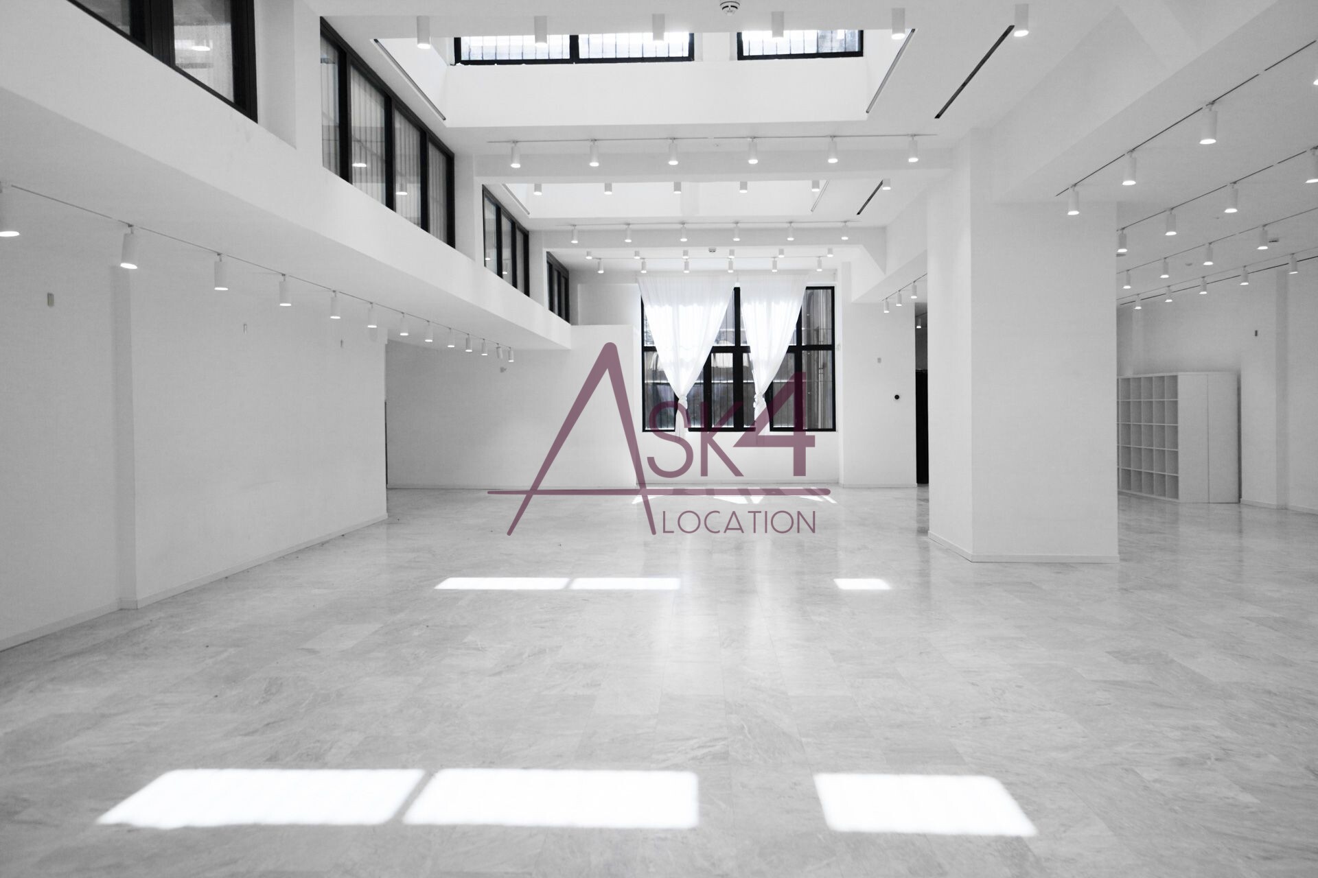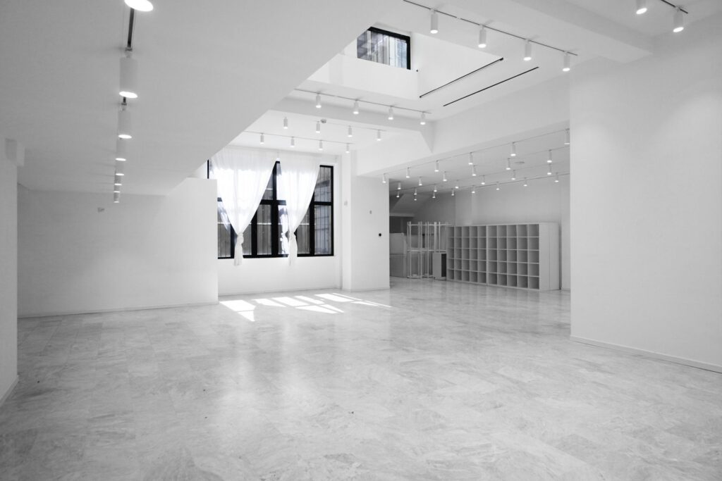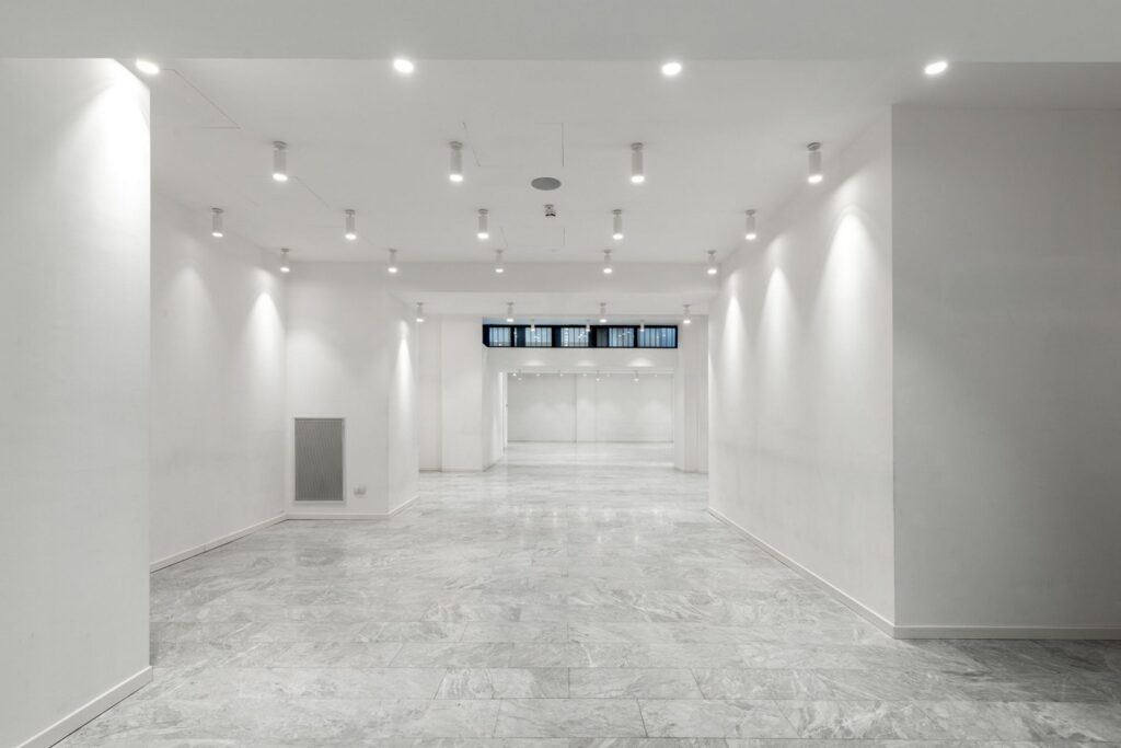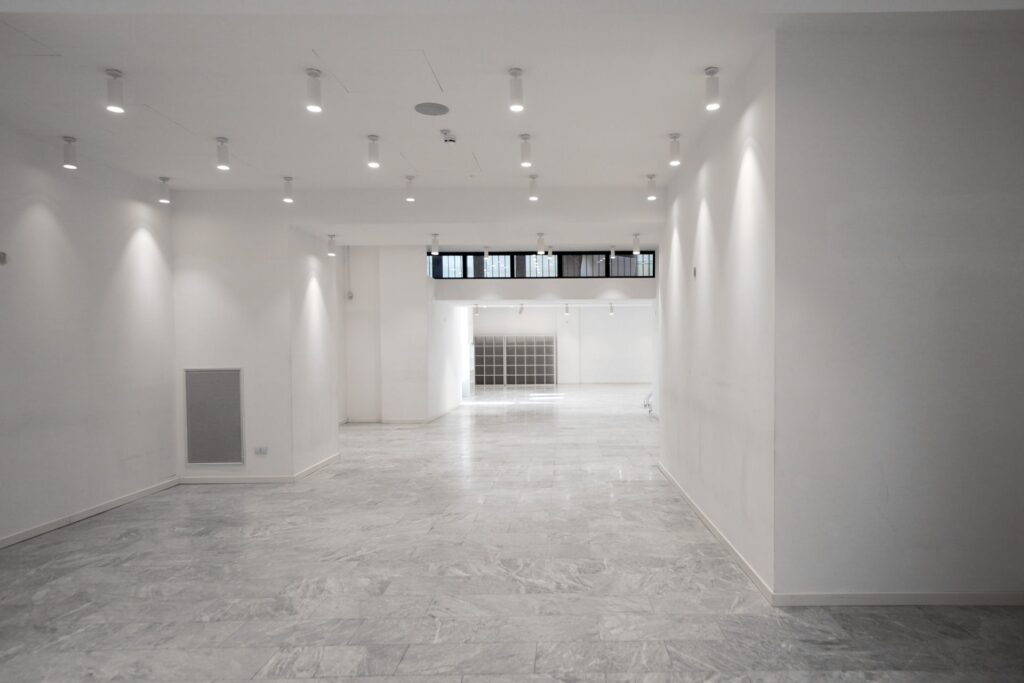 Lo spazio si apre in un’area principale dall’estetica minimalista e lineare, caratterizzata da ampie superfici bianche, grandi finestre a nastro e lucernari geometrici che inondano di luce naturale ogni angolo. Il pavimento in marmo chiaro e l’illuminazione puntuale a soffitto contribuiscono a creare un’atmosfera pulita, perfetta come set neutro per qualsiasi tipo di produzione.