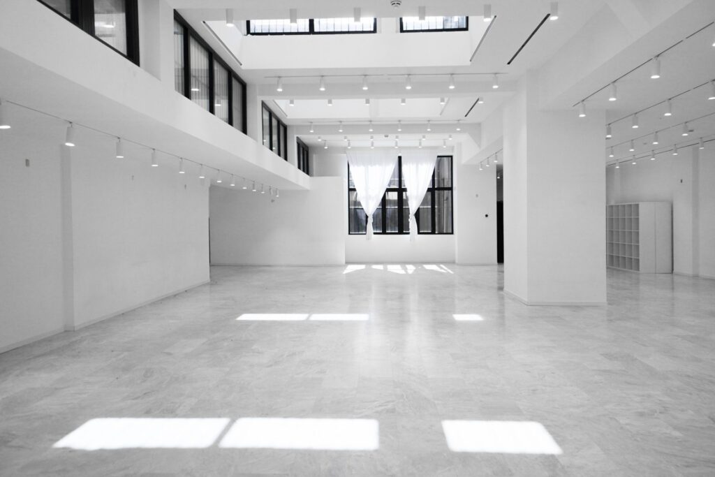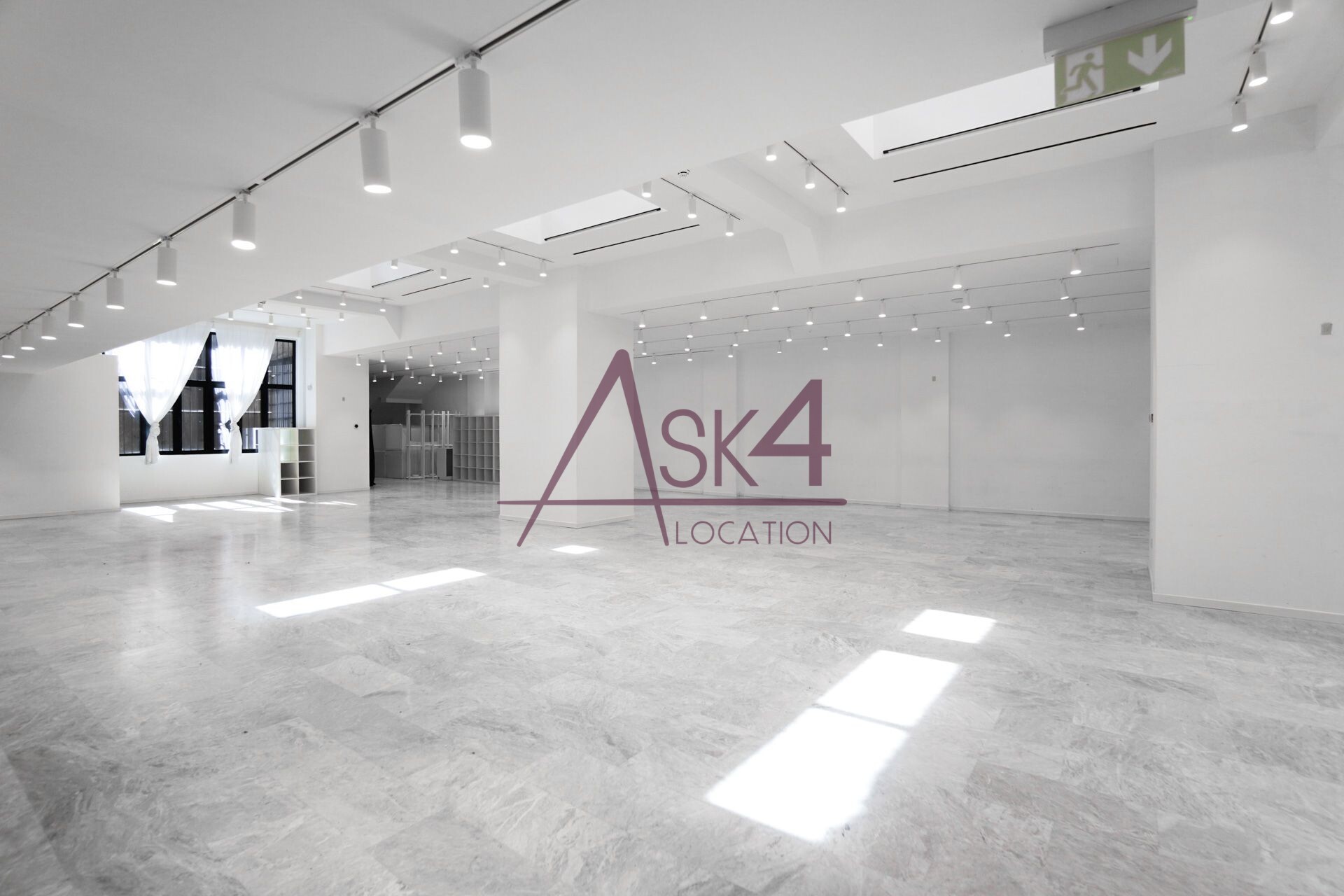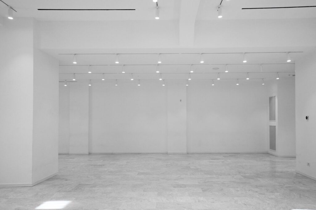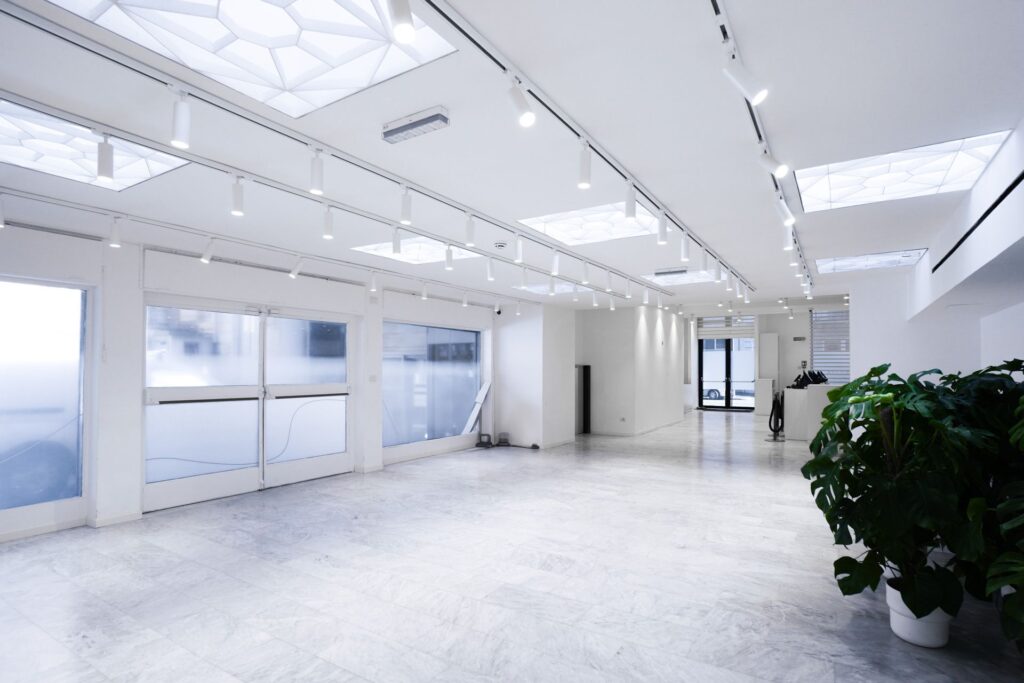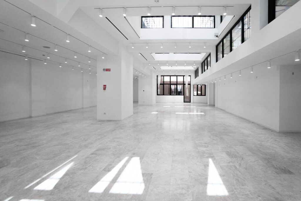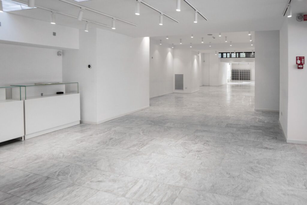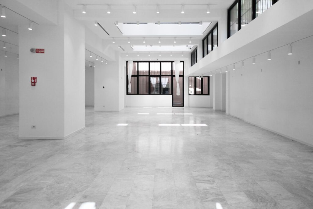 Lo spazio si apre in un’area principale dall’estetica minimalista e lineare, caratterizzata da ampie superfici bianche, grandi finestre a nastro e lucernari geometrici che inondano di luce naturale ogni angolo. Il pavimento in marmo chiaro e l’illuminazione puntuale a soffitto contribuiscono a creare un’atmosfera pulita, perfetta come set neutro per qualsiasi tipo di produzione.