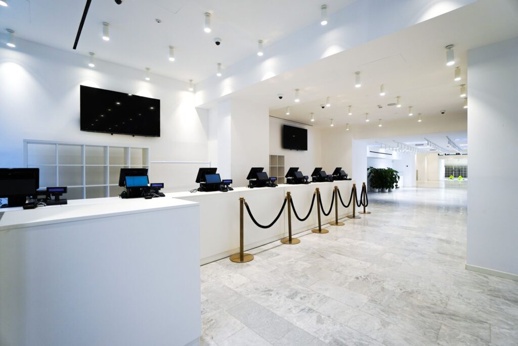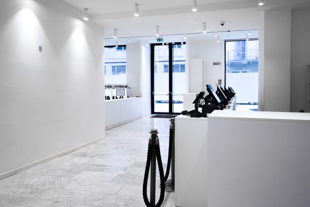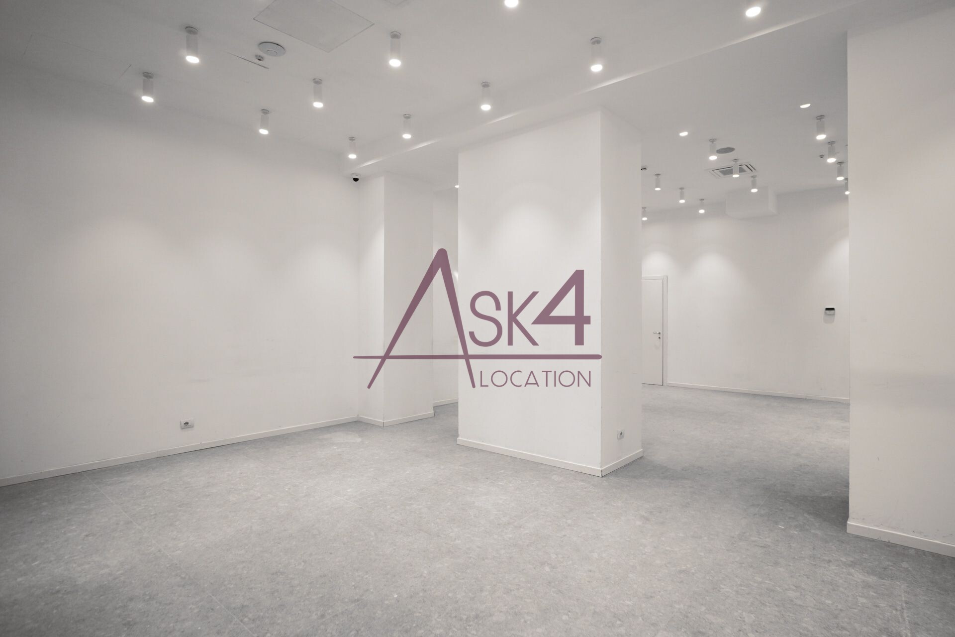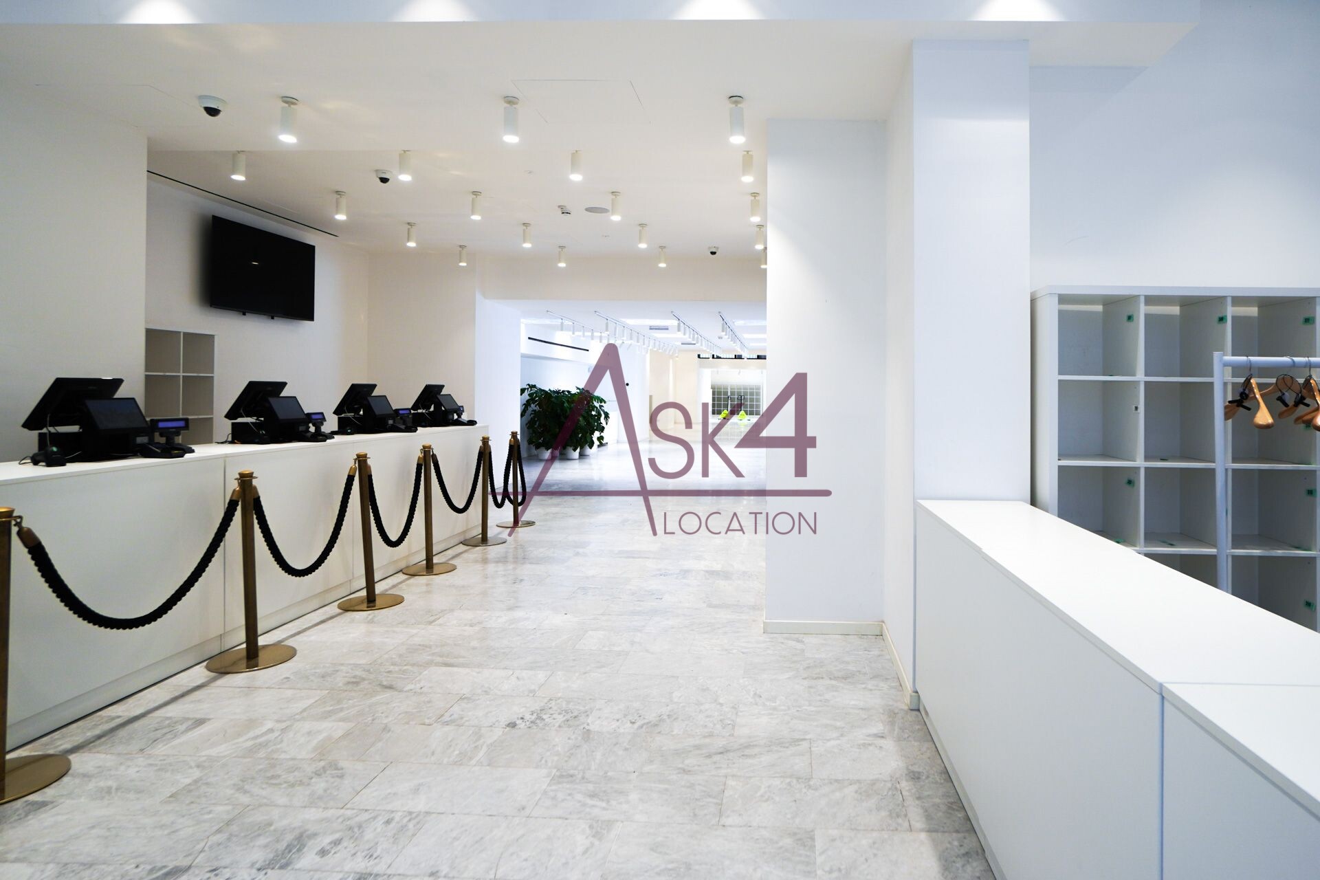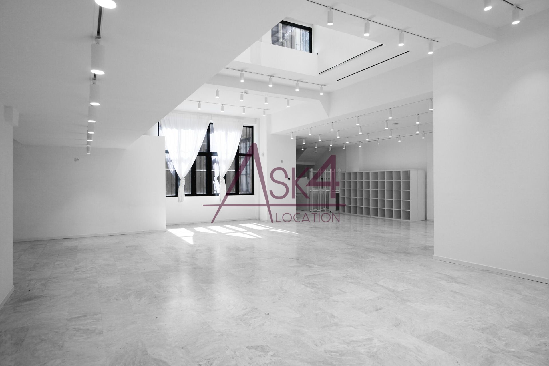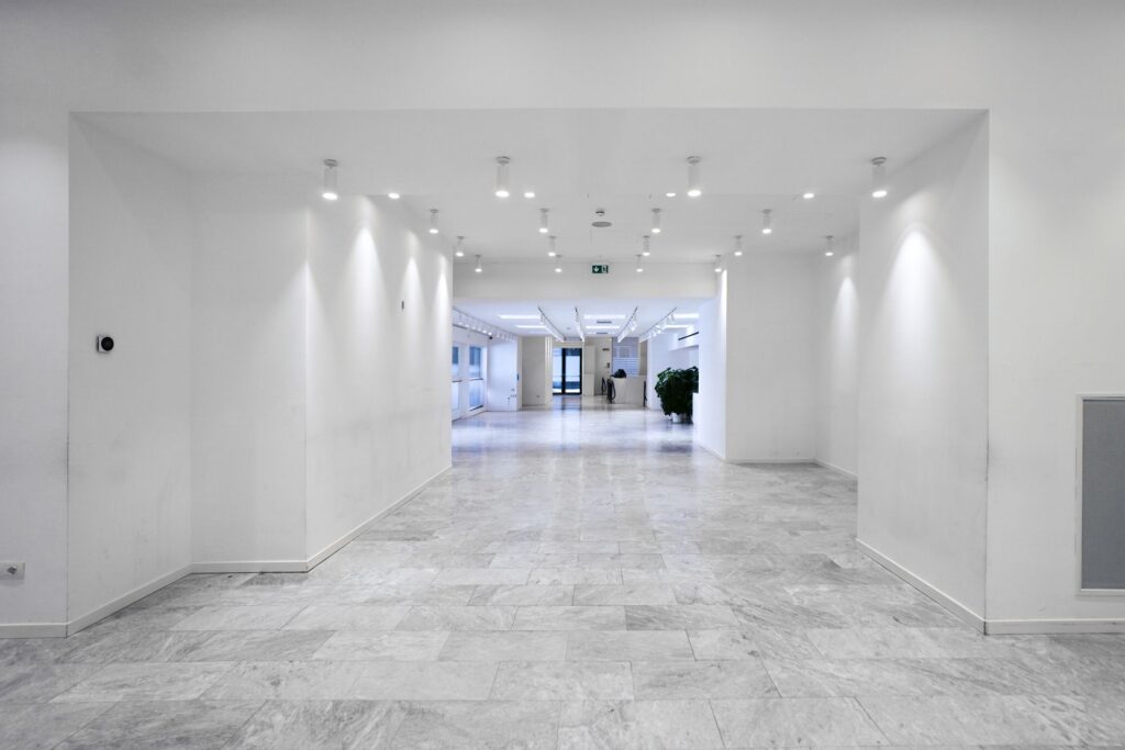 Lo spazio si apre in un’area principale dall’estetica minimalista e lineare, caratterizzata da ampie superfici bianche, grandi finestre a nastro e lucernari geometrici che inondano di luce naturale ogni angolo. Il pavimento in marmo chiaro e l’illuminazione puntuale a soffitto contribuiscono a creare un’atmosfera pulita, perfetta come set neutro per qualsiasi tipo di produzione.
