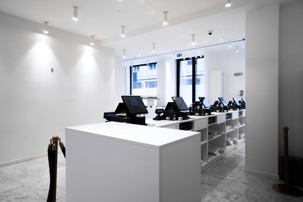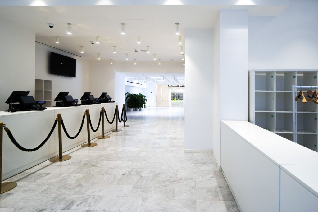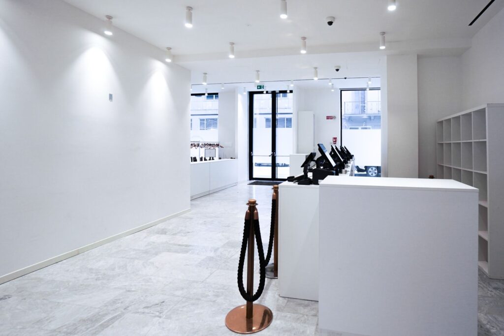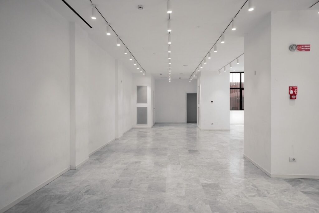 L’illuminazione, studiata in modo uniforme e integrata nel soffitto, valorizza i materiali e consente la massima libertà in fase di allestimento. Gli elementi strutturali, come le colonne e le partizioni leggere, possono essere usati per creare percorsi espositivi o separazioni funzionali.