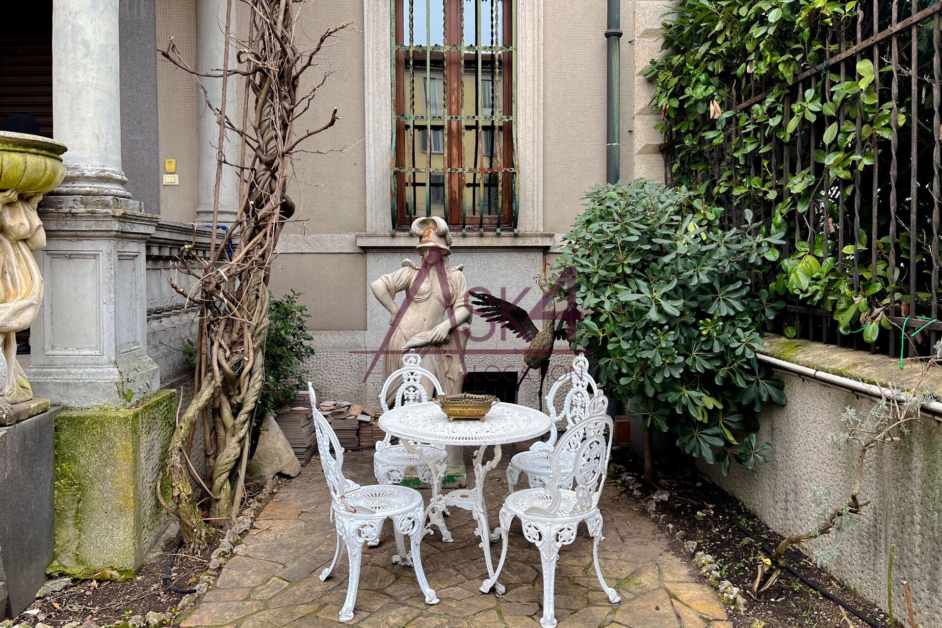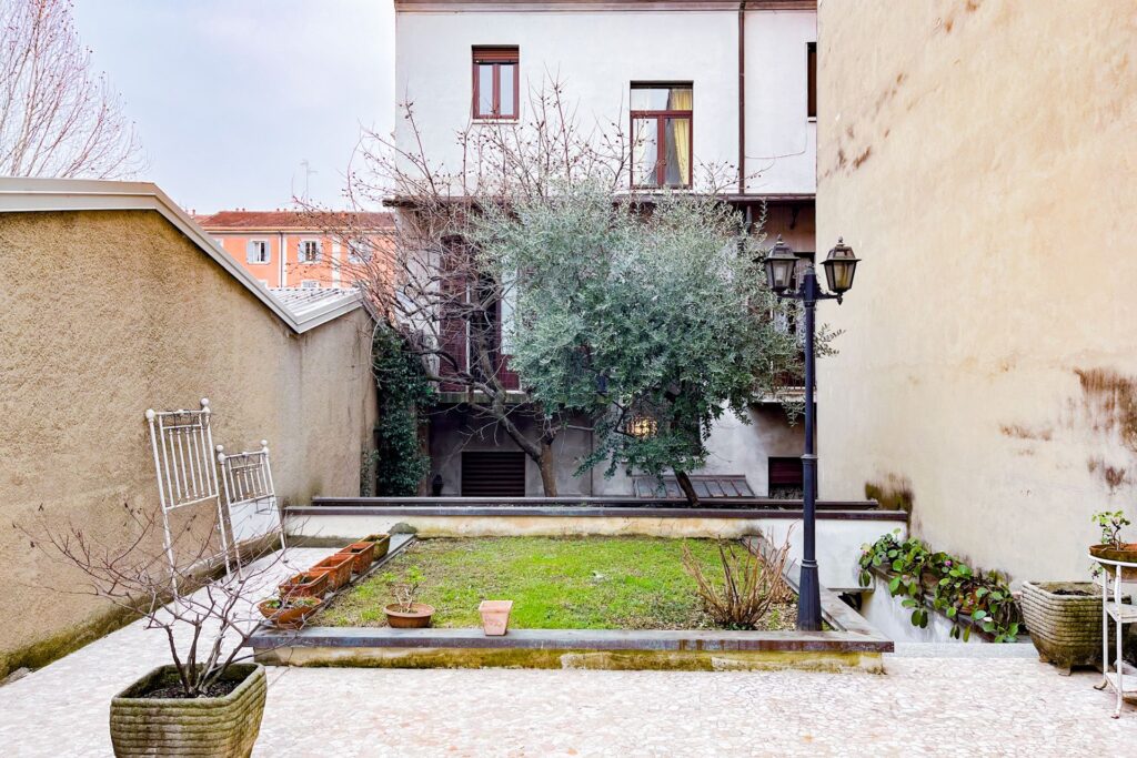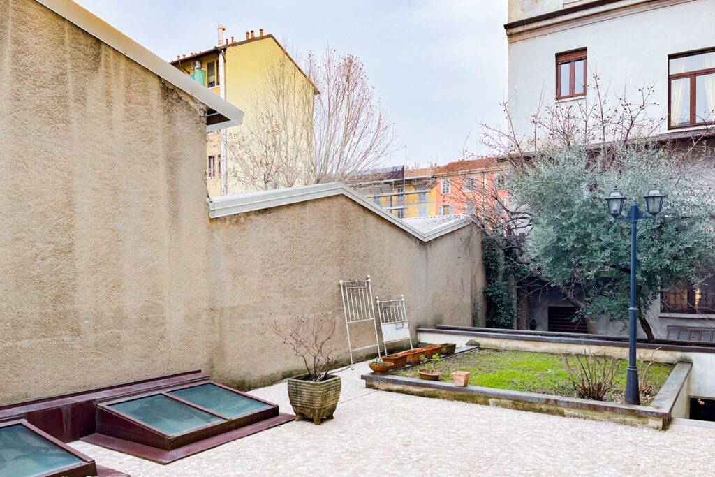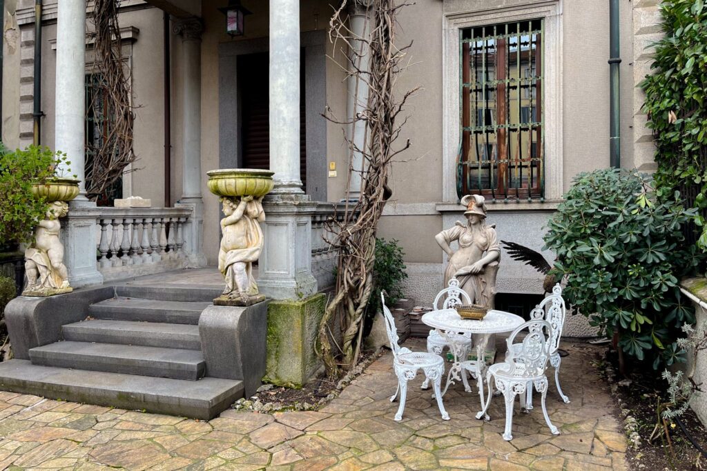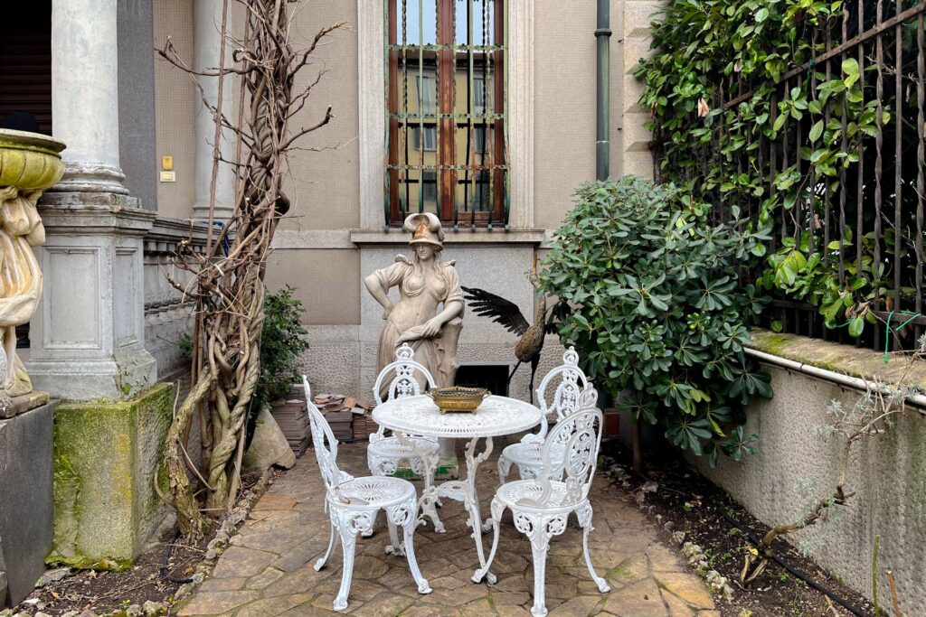 Accanto agli interni sontuosi, la Villa di Bryton offre anche un cortile interno con statue e aiuole verdi, oltre a una terrazza urbana affacciata sui tetti milanesi: elementi che creano un interessante contrasto tra intimità storica e contesto cittadino. Questi spazi esterni sono ideali per shooting panoramici e riprese in esterna, con una varietà di angoli che si prestano a interpretazioni stilistiche diverse.
