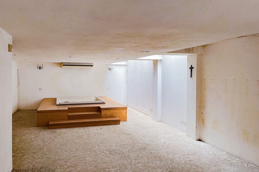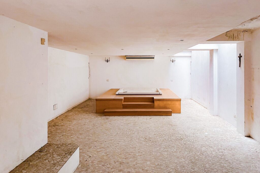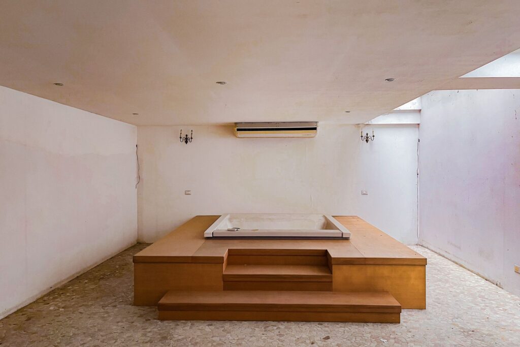 Nel seminterrato, la location dispone di un ambiente con pedana rialzata, muri neutri e pavimentazione in pietra, adatto per set minimali o installazioni temporanee. L’accesso diretto da più punti della villa e la distribuzione su più livelli rendono la location funzionale anche per crew di produzione, team creativi ed esigenze logistiche complesse.