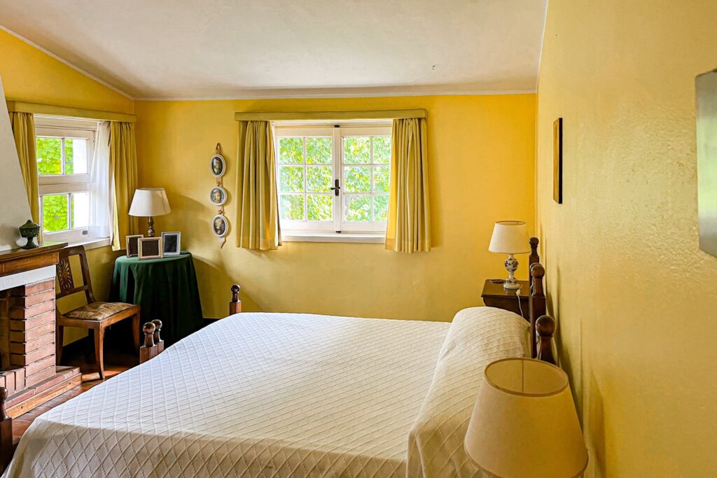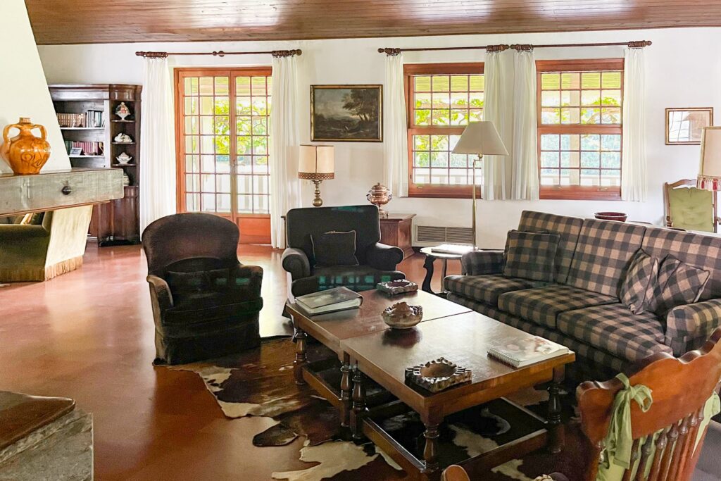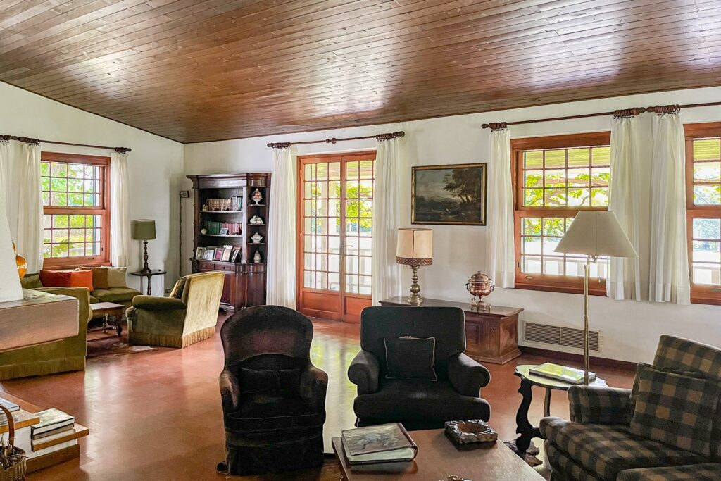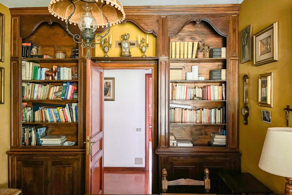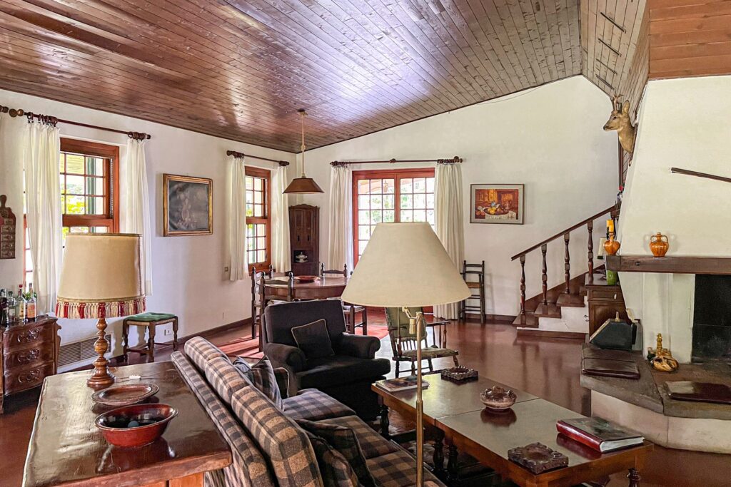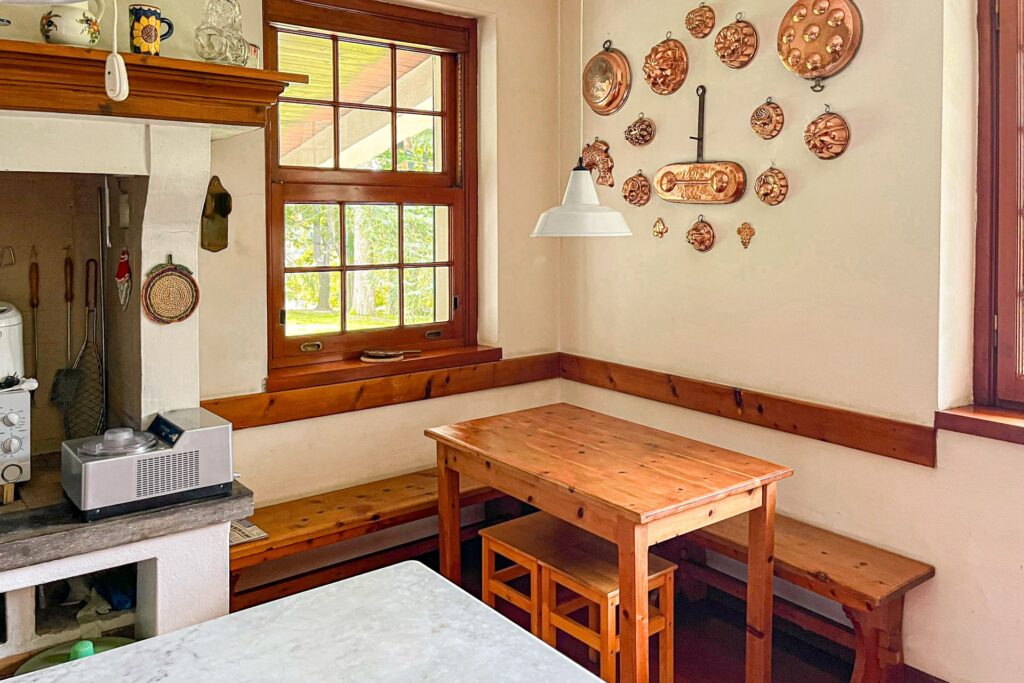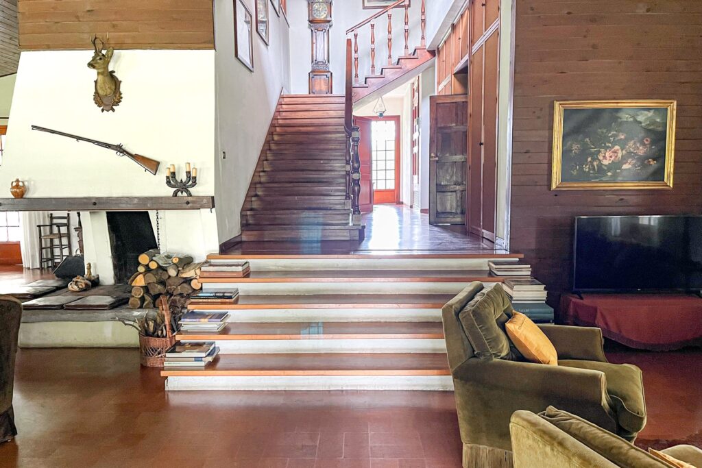 Il cuore della villa è dominato da materiali caldi e naturali: legno, cotto e tessuti imbottiti definiscono uno stile coerente, perfetto per racconti visivi ambientati in contesti familiari, nostalgici o legati al mondo rurale. Il salone, con camino centrale e arredi vintage, si presta a riprese statiche e scene dialogate.