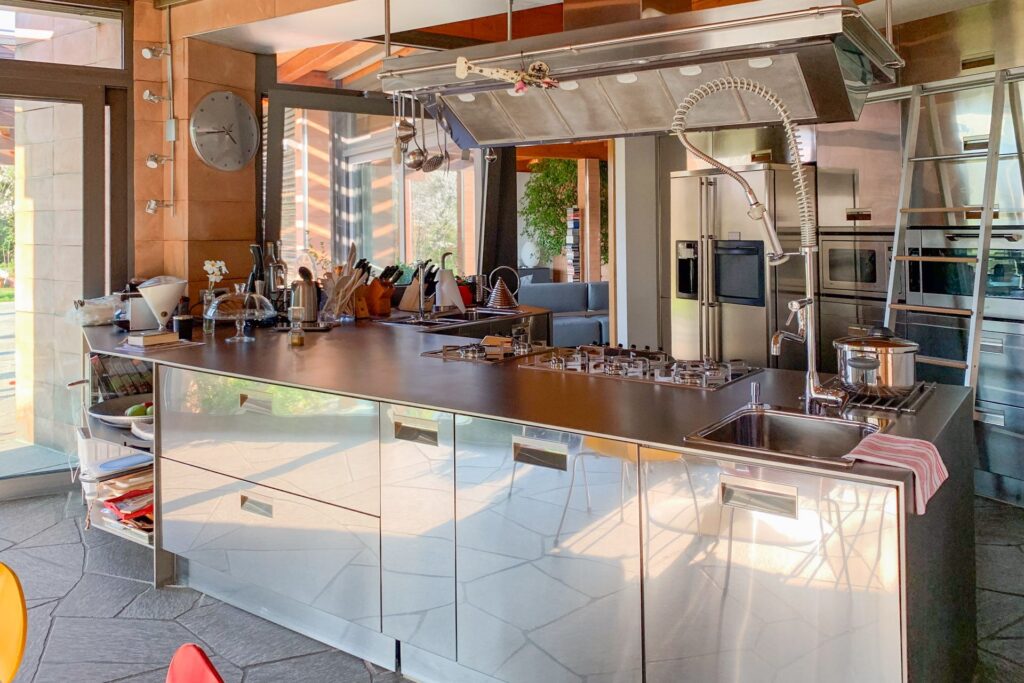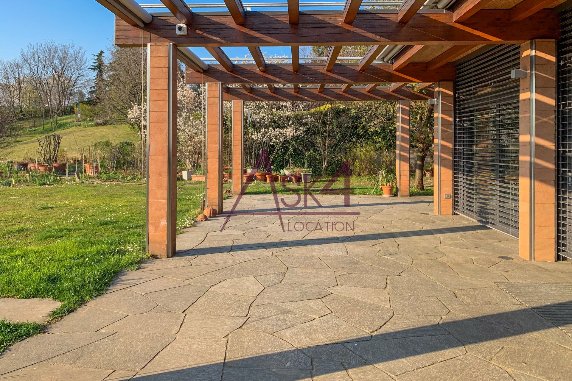 Un ampio giardino, con uno splendido laghetto, caratterizza la location e può essere sfruttato come facile accesso carico e scarico. È presente un favoloso porticato, che potrà essere usato come zona d’appoggio e nei periodi caldi anche come zona trucco e parrucco. La cucina a isola moderna e tecnologica si adatta a eventi di show cooking.