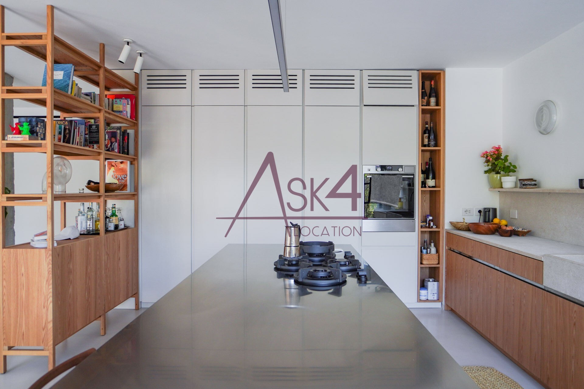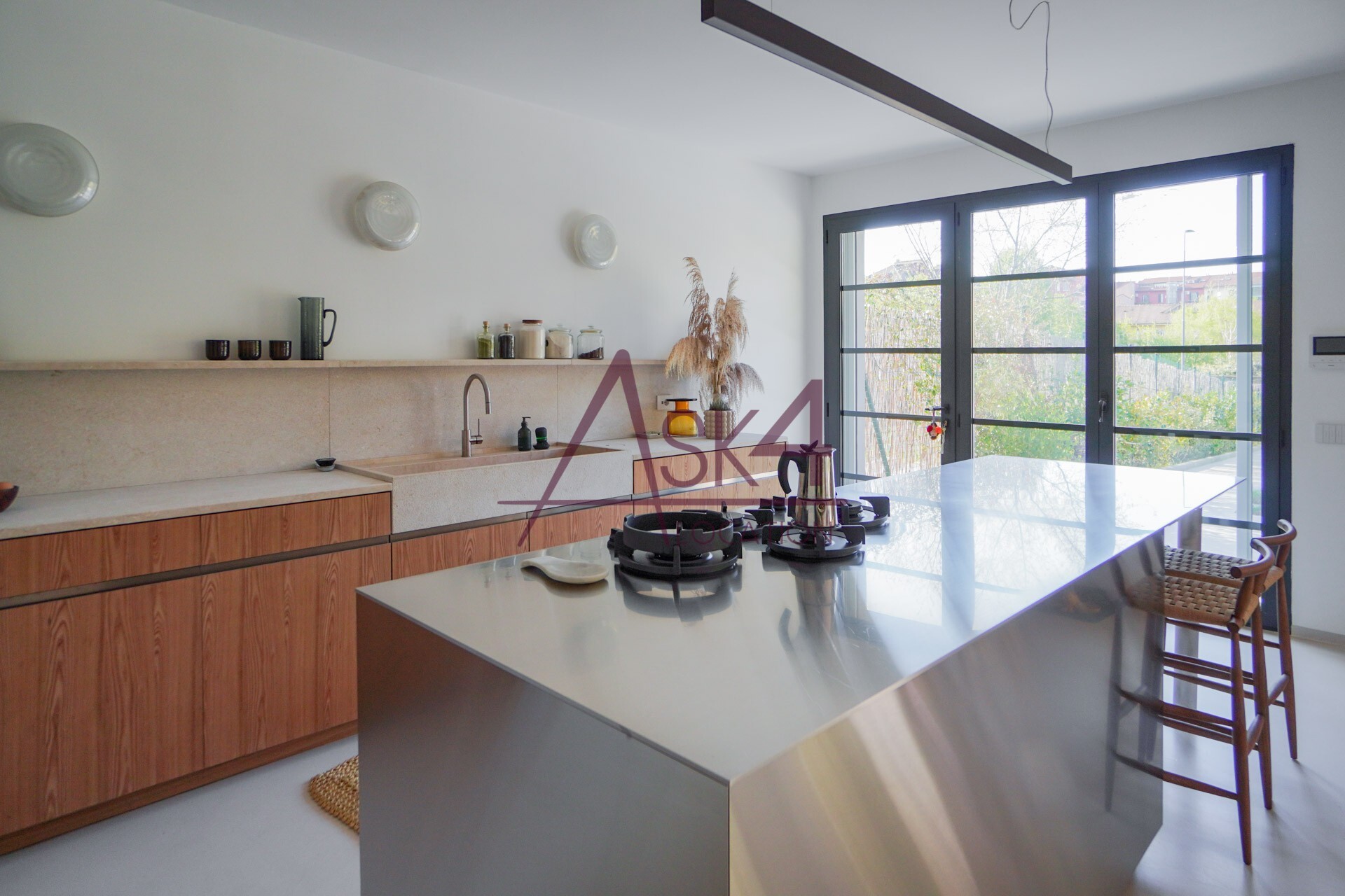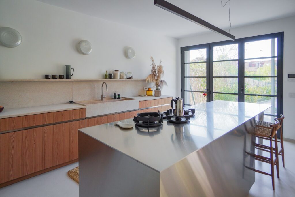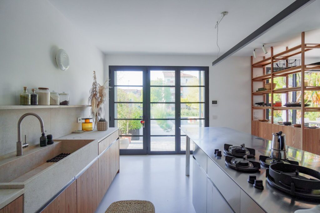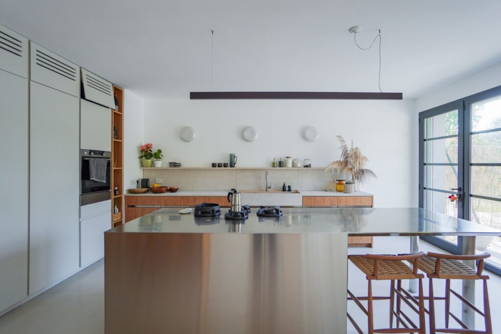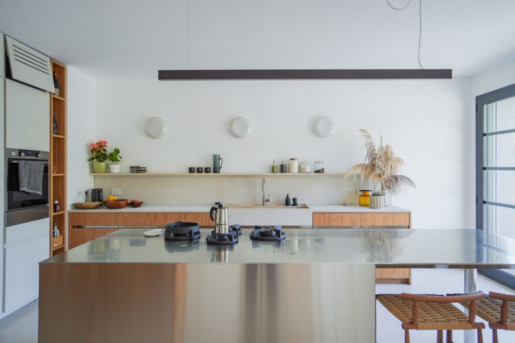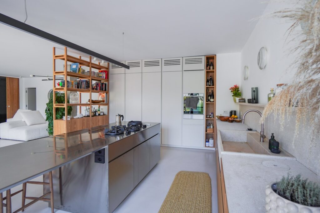 La cucina, separata dal soggiorno da due mobili libreria che creano una schermatura delicata senza dividere gli spazi in modo netto, è caratterizzata da materiali pregiati come legno e acciaio. Questa combinazione di elementi conferisce un tocco di modernità e naturalezza agli ambienti, rendendo la villa il luogo ideale per ambientazioni minimaliste e sofisticate.